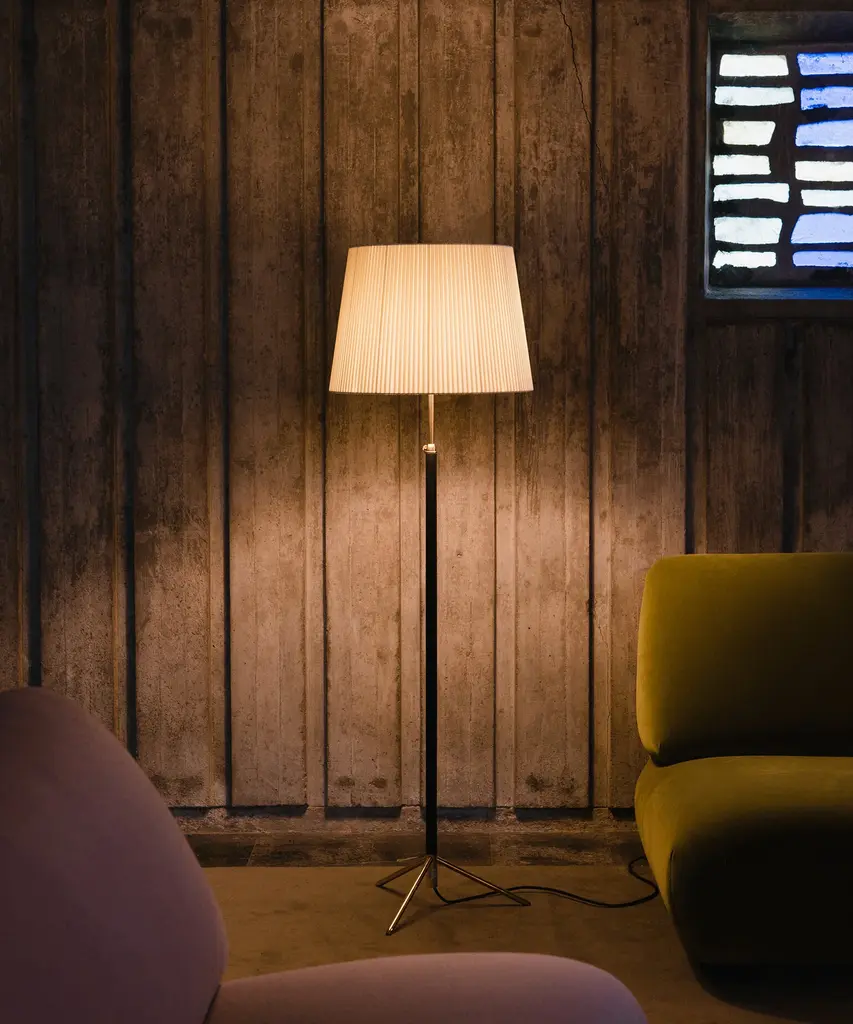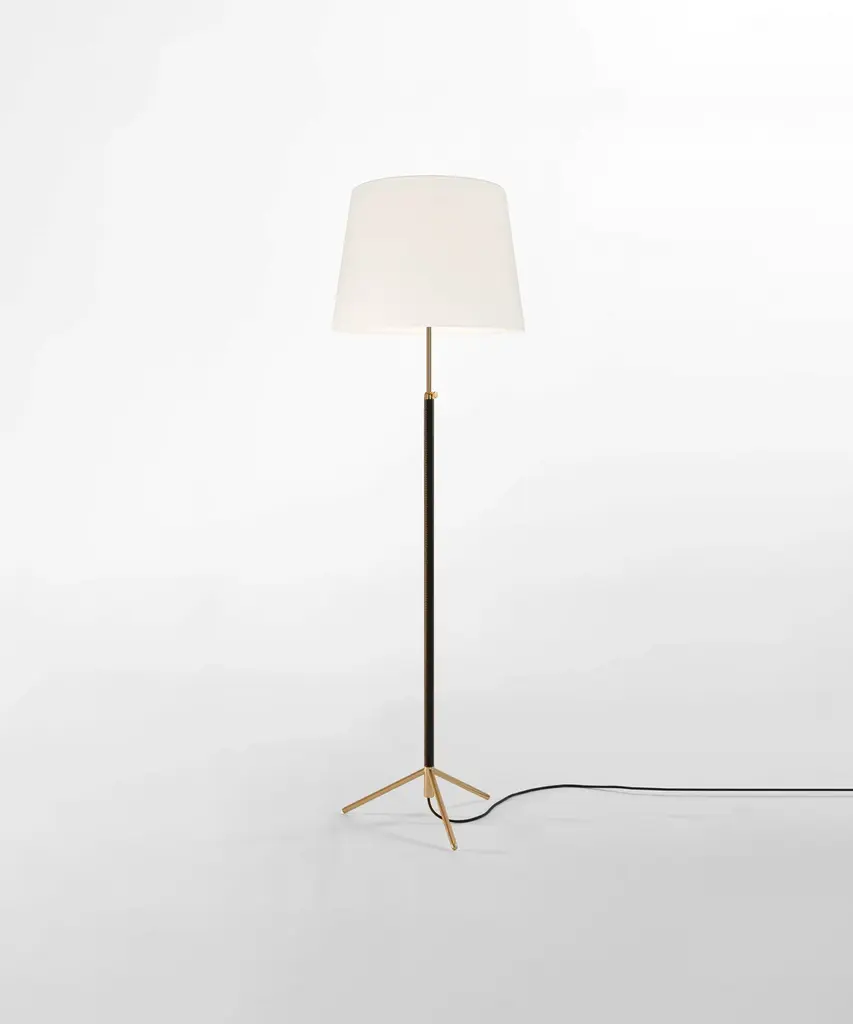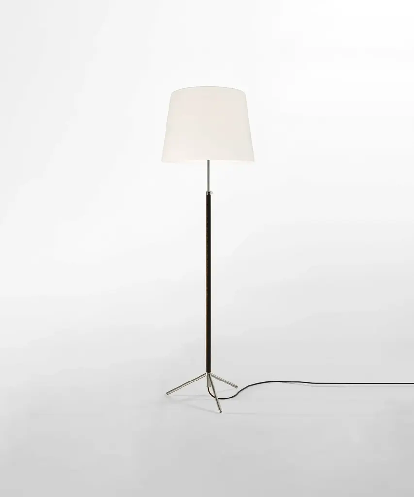 Jaume Sans was a renowned Catalan surrealist sculptor and painter. He was also a member of the artistic association ADLAN which included among its members Picasso, Dalí, Miró, and Calder, all acquaintances of the GATCPAC architects with whom they shared their social venue on Passeig de Gràcia in pre-Spanish Civil War Barcelona. Sans focused on the design of furniture for his own household, which is how the remarkable Pie de Salón or Peana Molina lamps were created, and later edited by Santa & Cole. A sleek reinterpretation of traditional symmetrical lamps, with a chrome shaft. The stem of the lamp is adjustable and is leather-covered for a luxurious feel, opening up into a tripod base that allows the cable to easily go through. A perfect example of industrial craftsmanship. It features three distinct shades in three different materials and eight color options that exude timeless elegance Produced by Barcelona-based lighting purveyor, Santa & Cole.