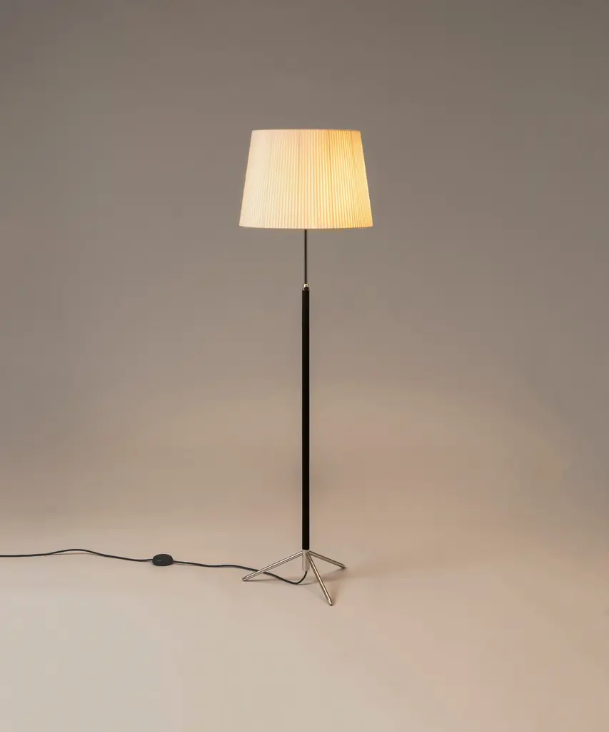 Jaume Sans was a renowned Catalan surrealist sculptor and painter. He was also a member of the artistic association ADLAN which included among its members Picasso, Dalí, Miró, and Calder, all acquaintances of the GATCPAC architects with whom they shared their social venue on Passeig de Gràcia in pre-Spanish Civil War Barcelona. Sans focused on the design of furniture for his own household, which is how the remarkable Pie de Salón or Peana Molina lamps were created, and later edited by Santa & Cole. A sleek reinterpretation of traditional symmetrical lamps, with a chrome shaft. The stem of the lamp is adjustable and is leather-covered for a luxurious feel, opening up into a tripod base that allows the cable to easily go through. A perfect example of industrial craftsmanship. It features three distinct shades in three different materials and eight color options that exude timeless elegance Produced by Barcelona-based lighting purveyor, Santa & Cole.