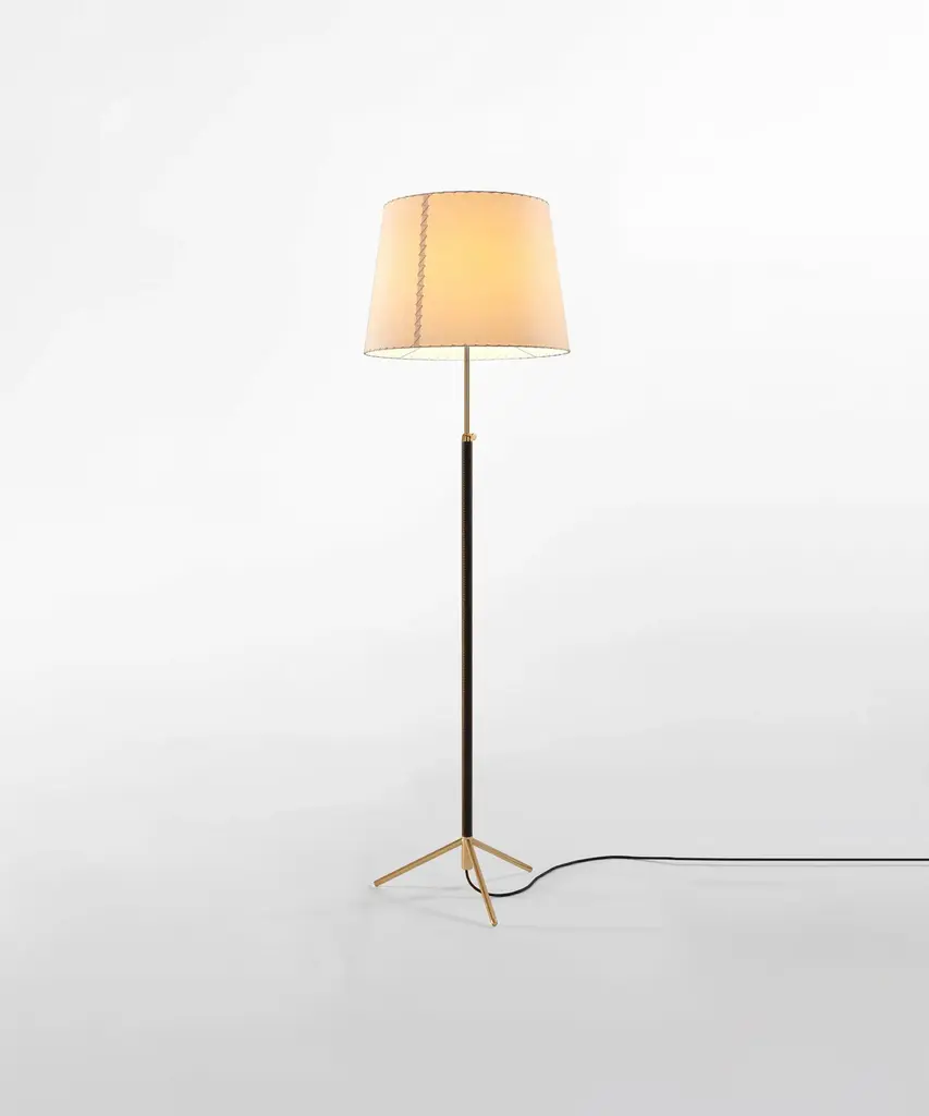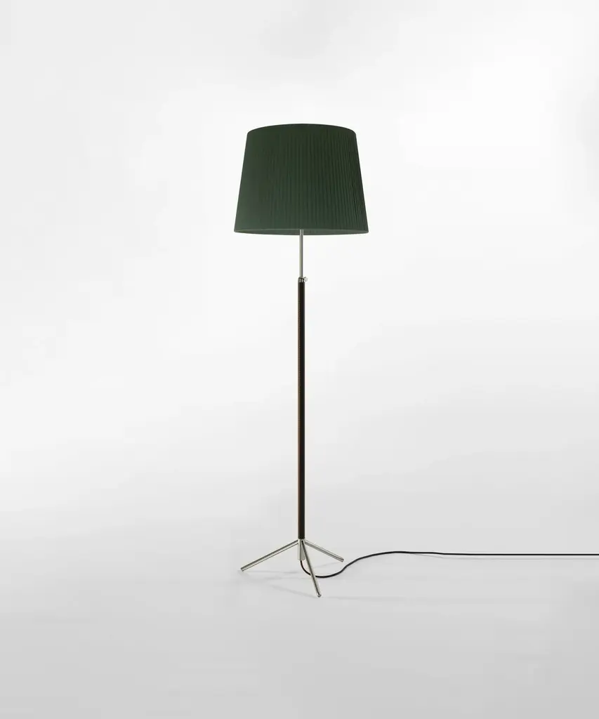 Jaume Sans was a renowned Catalan surrealist sculptor and painter. He was also a member of the artistic association ADLAN which included among its members Picasso, Dalí, Miró, and Calder, all acquaintances of the GATCPAC architects with whom they shared their social venue on Passeig de Gràcia in pre-Spanish Civil War Barcelona. Sans focused on the design of furniture for his own household, which is how the remarkable Pie de Salón or Peana Molina lamps were created, and later edited by Santa & Cole. A sleek reinterpretation of traditional symmetrical lamps, with a chrome shaft. The stem of the lamp is adjustable and is leather-covered for a luxurious feel, opening up into a tripod base that allows the cable to easily go through. A perfect example of industrial craftsmanship. It features three distinct shades in three different materials and eight color options that exude timeless elegance Produced by Barcelona-based lighting purveyor, Santa & Cole.