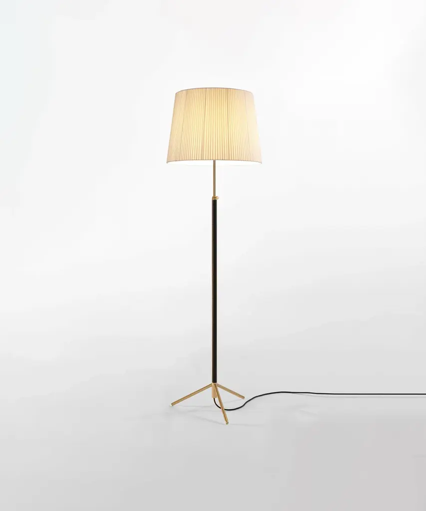 Jaume Sans was a renowned Catalan surrealist sculptor and painter. He was also a member of the artistic association ADLAN which included among its members Picasso, Dalí, Miró, and Calder, all acquaintances of the GATCPAC architects with whom they shared their social venue on Passeig de Gràcia in pre-Spanish Civil War Barcelona. Sans focused on the design of furniture for his own household, which is how the remarkable Pie de Salón or Peana Molina lamps were created, and later edited by Santa & Cole. A sleek reinterpretation of traditional symmetrical lamps, with a chrome shaft. The stem of the lamp is adjustable and is leather-covered for a luxurious feel, opening up into a tripod base that allows the cable to easily go through. A perfect example of industrial craftsmanship. It features three distinct shades in three different materials and eight color options that exude timeless elegance Produced by Barcelona-based lighting purveyor, Santa & Cole.