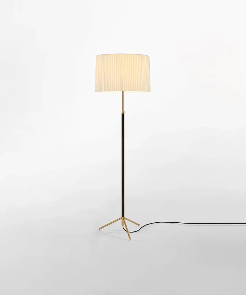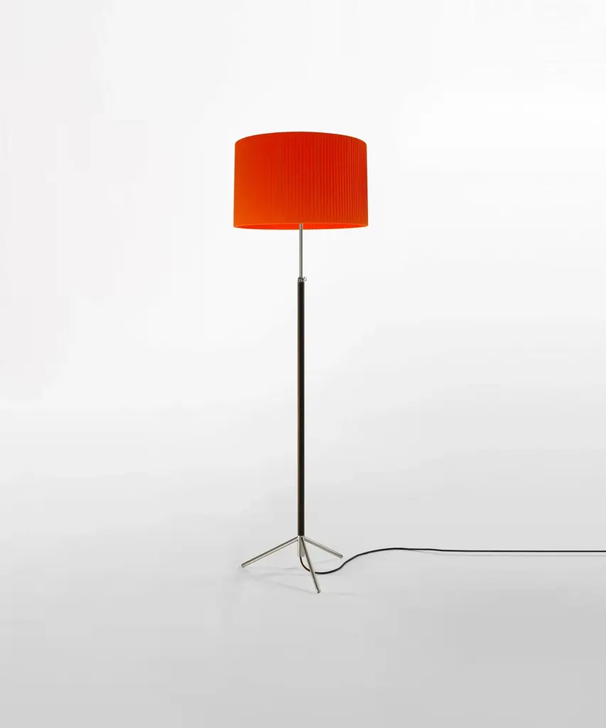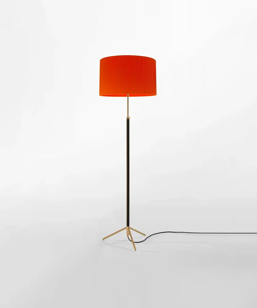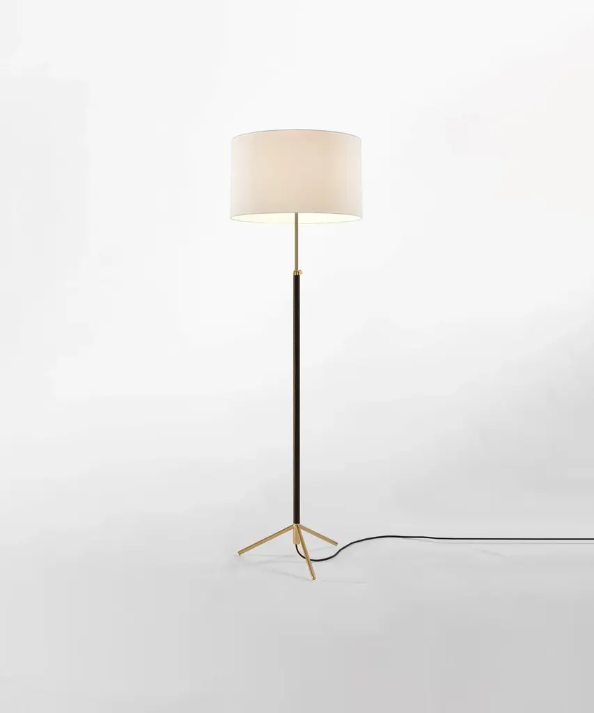 Jaume Sans was a renowned Catalan surrealist sculptor and painter. He was also a member of the artistic association ADLAN which included amongst its members Picasso, Dalí, Miró, and Calder, all acquaintances of the GATCPAC architects with whom they shared their social venue on Passeig de Gràcia in pre-Spanish Civil War Barcelona. Sans focused on the design of furniture for his own household, which is how the remarkable Pie de Salón or Peana Molina lamps were created, and later edited by Santa & Cole. A sleek reinterpretation of traditional symmetrical lamps, with a chrome shaft. The stem of the lamp is adjustable and is leather-covered for a luxurious feel, opening up into a tripod base that allows the cable to easily go through. A perfect example of industrial craftsmanship. It features three distinct shades in three different materials and eight color options that exude timeless elegance Produced by the Barcelona-based lighting purveyor, Santa & Cole.