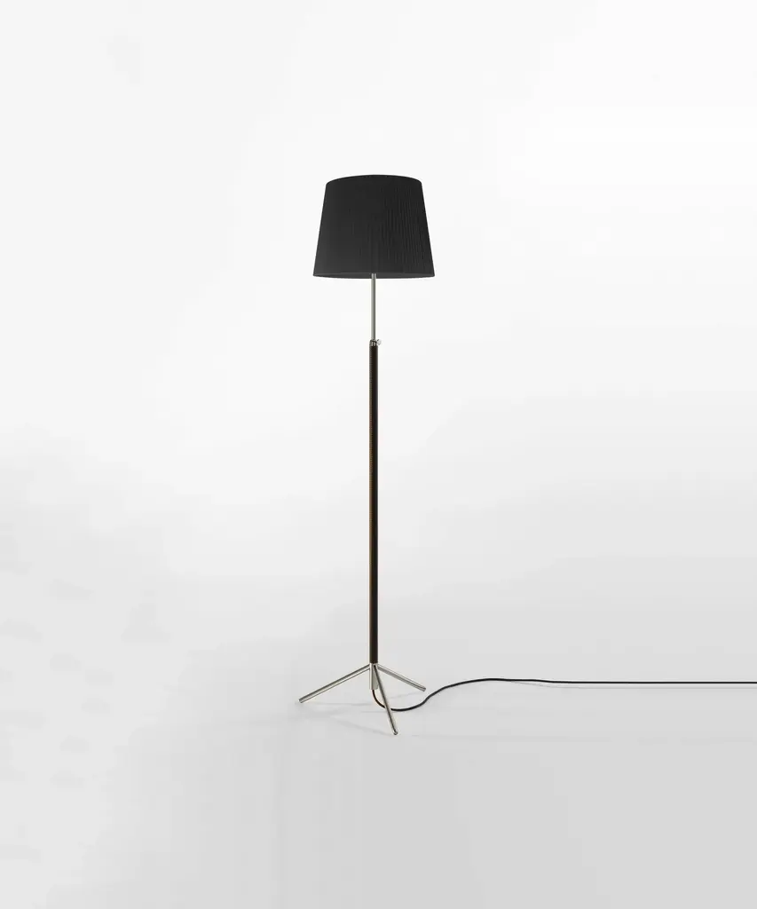 Jaume Sans was a renowned Catalan surrealist sculptor and painter. He was also a member of the artistic association ADLAN which included among its members Picasso, Dalí, Miró, and Calder, all acquaintances of the GATCPAC architects with whom they shared their social venue on Passeig de Gràcia in pre-Spanish Civil War Barcelona. Sans focused on the design of furniture for his own household, which is how the remarkable Pie de Salón or Peana Molina lamps were created, and later edited by Santa & Cole. A sleek reinterpretation of traditional symmetrical lamps, with a chrome shaft. The stem of the lamp is adjustable and is leather-covered for a luxurious feel, opening up into a tripod base that allows the cable to easily go through. A perfect example of industrial craftsmanship. It features three distinct shades in three different materials and eight color options that exude timeless elegance Produced by the Barcelona-based lighting purveyor, Santa & Cole.