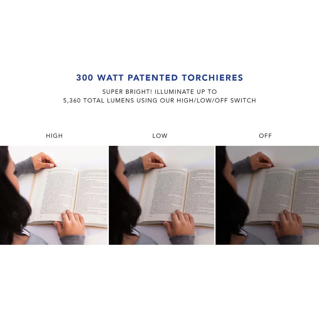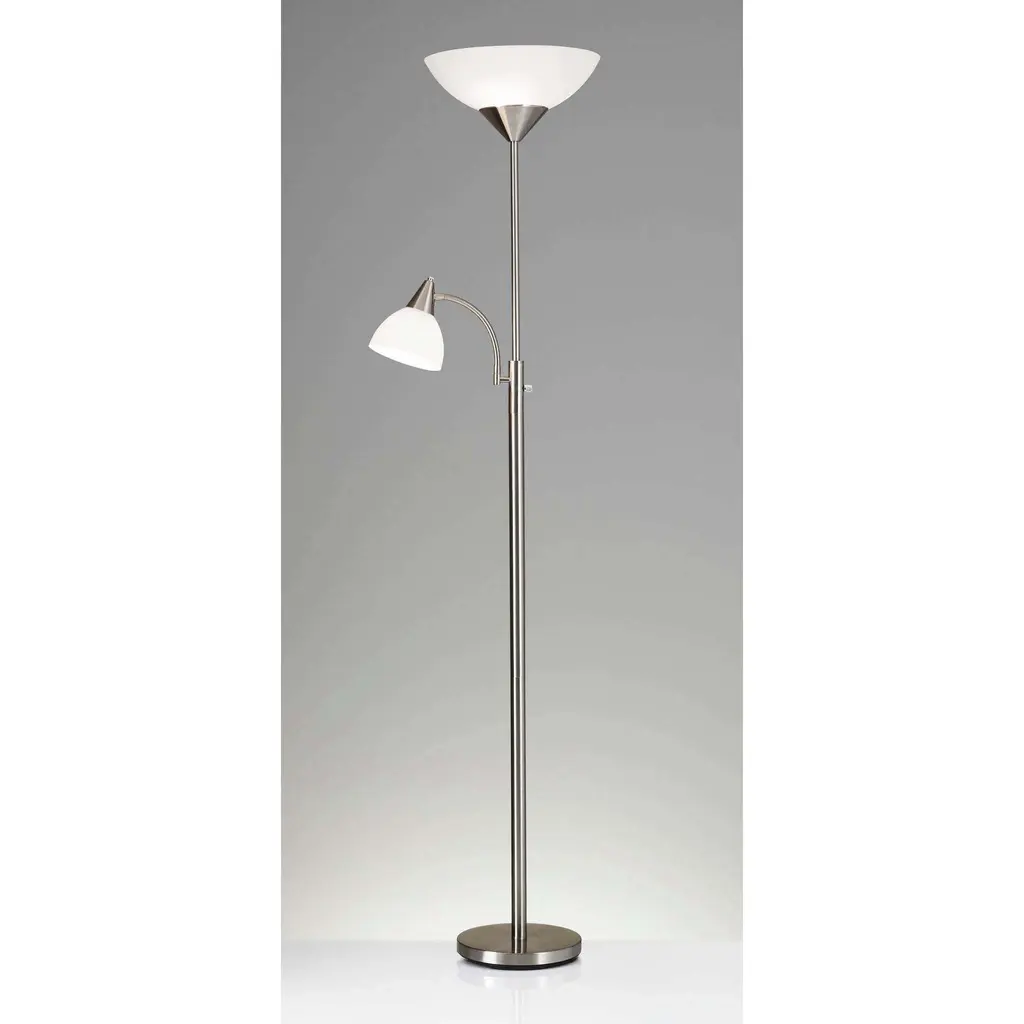 This 300 Watt incandescent floor lamp takes 2 x 150 Watt or equivalent CFL bulbs. Adjustable gooseneck 60 Watt incandescent or 13 Watt CFL bulb reading light. 4-way switch on pole (both upper lights on, reading light only on, upper and reading lights on, all off). This lamp is compatible with CFL bulbs; same bulb type must be used in all sockets. Available in black or satin steel with white acrylic shades. 71"Height, 10" Base. Shades: Upper: 5"Height, 14" Dia. Reading light: 4" Height, 6" Dia. Note: Must use same bulb type in all sockets. All CFL or All incandescent.