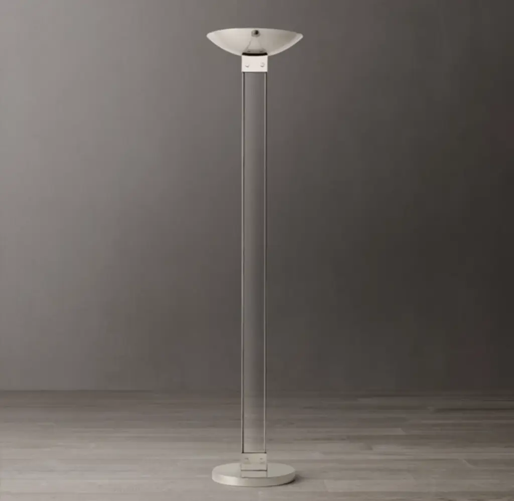 Influenced by the sleek lines of midcentury Italian lighting design, our torchiere by Ian K. Fowler makes a simple yet stunning statement. Marrying a pared-down profile with luxurious materials, a flat crystal column rises up from the brass base, culminating in a simple dish shade that provides dramatic uplighting.
