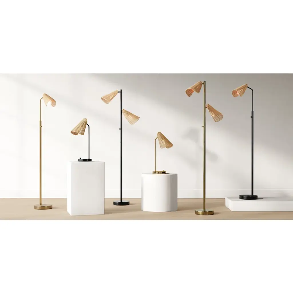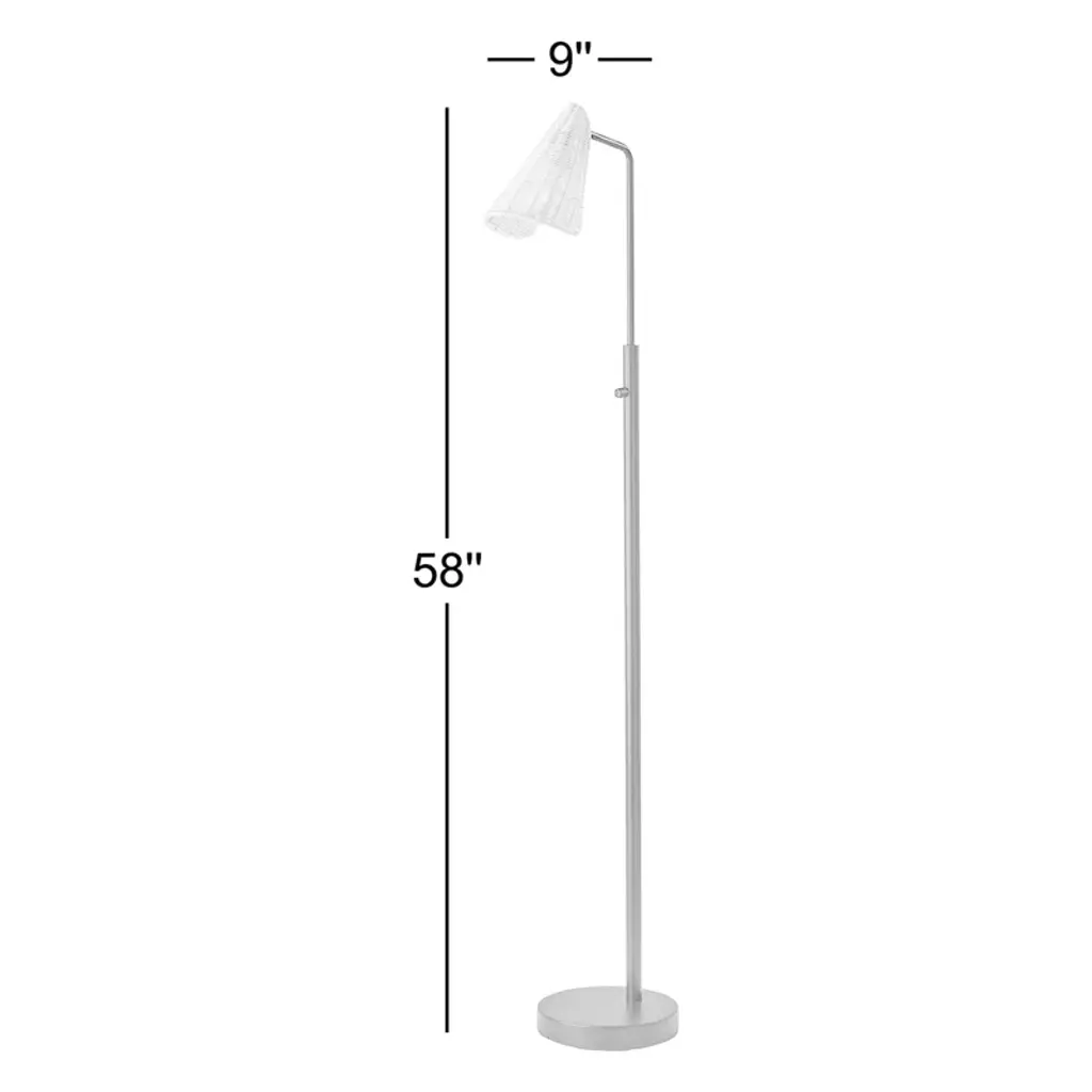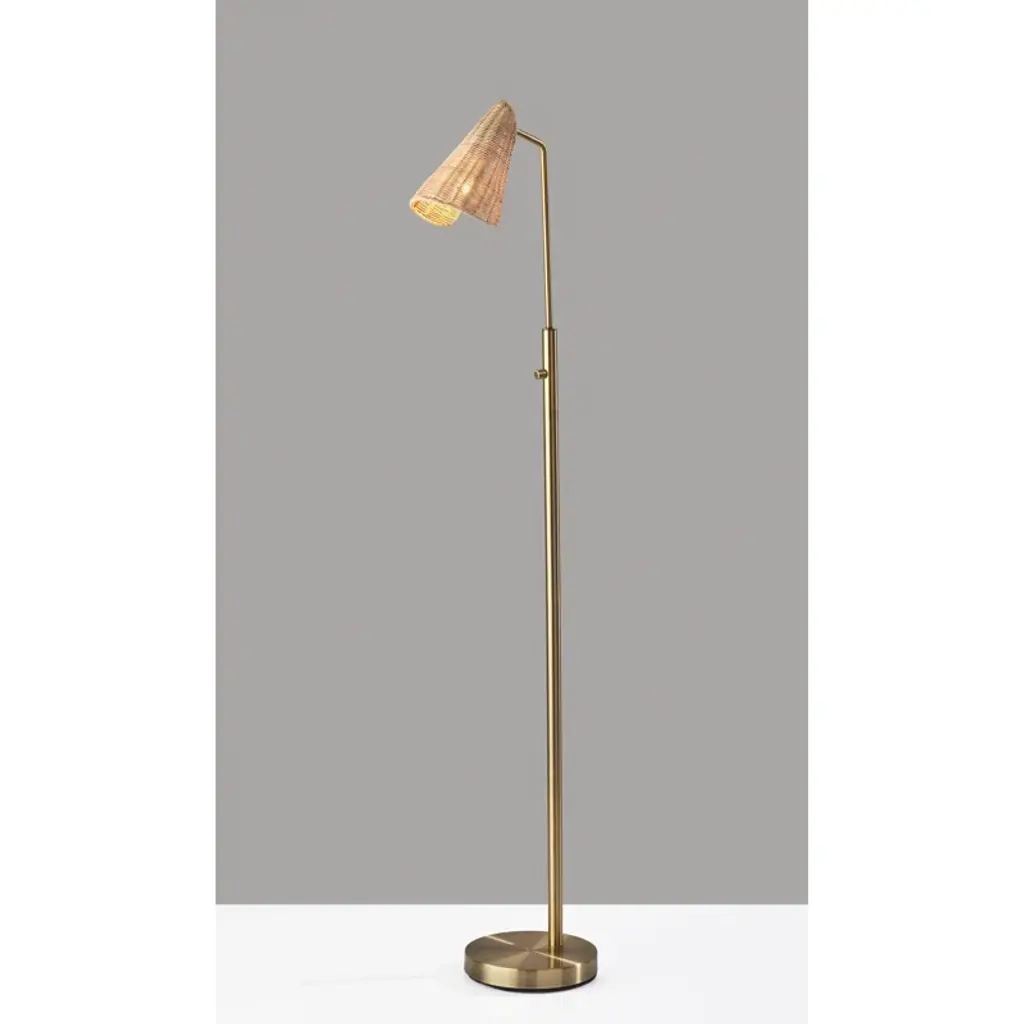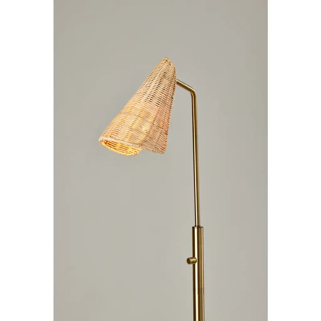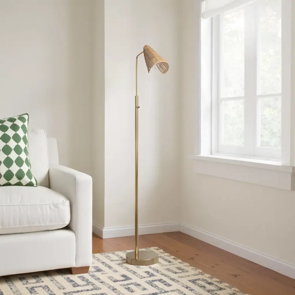 Illuminate your favorite reading nook with this floor lamp, a perfect blend of natural and contemporary elements. Its compact footprint, measuring 58" in height and 9" in width, makes it an ideal choice for smaller spaces or tucked behind furniture. The round metal base and slim stem showcase clean lines, while the hood-shaped rattan shade adds a touch of organic charm. The shade's articulation point lets you direct light where it's needed most, and a rotary switch on the stem ensures easy operation. Pair it with the coordinating desk and tree lamps for a cohesive look.
