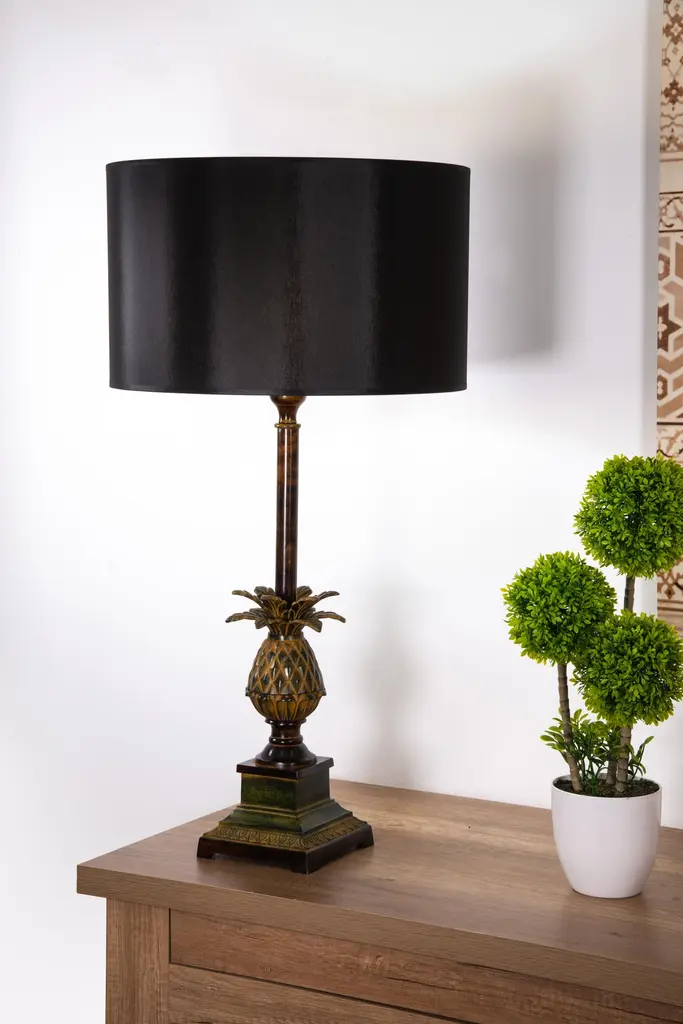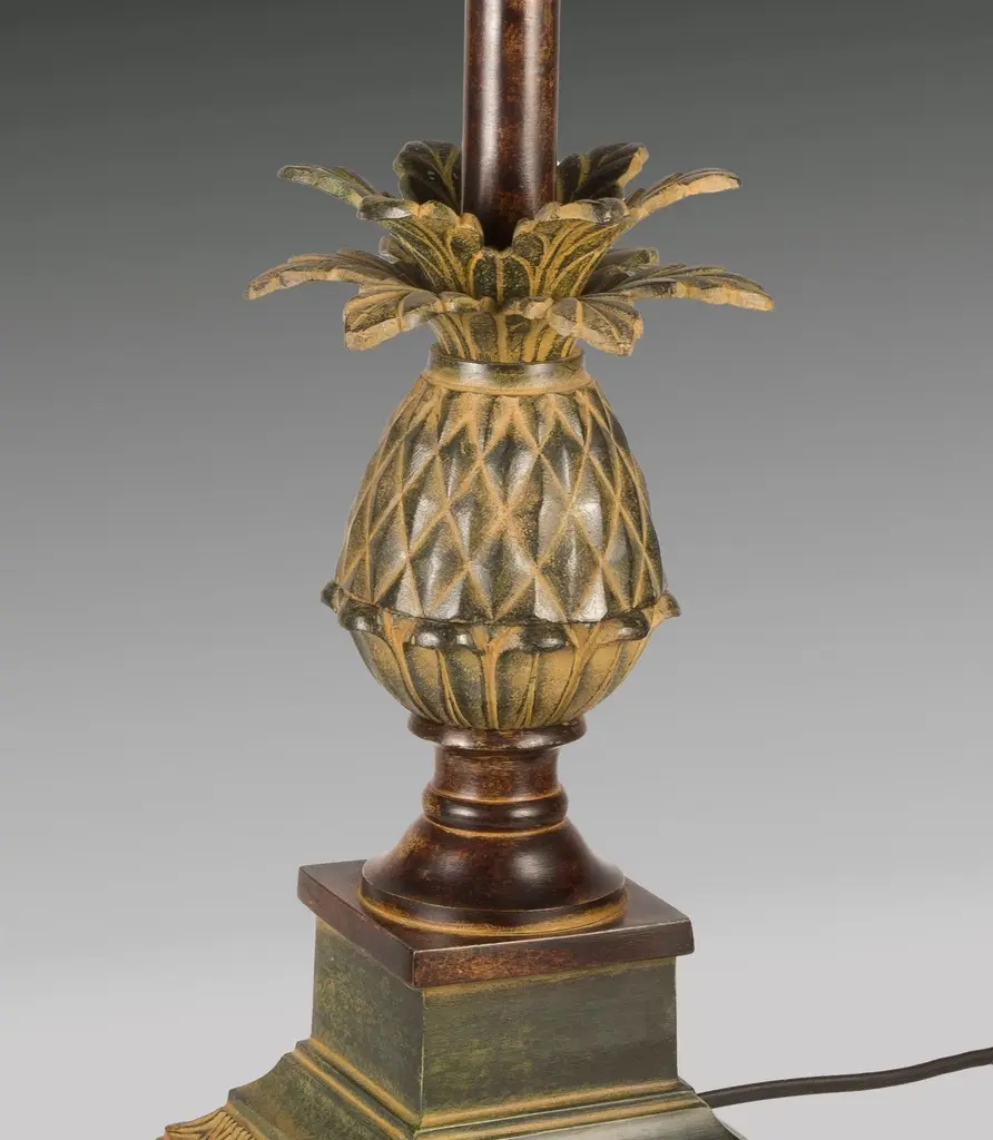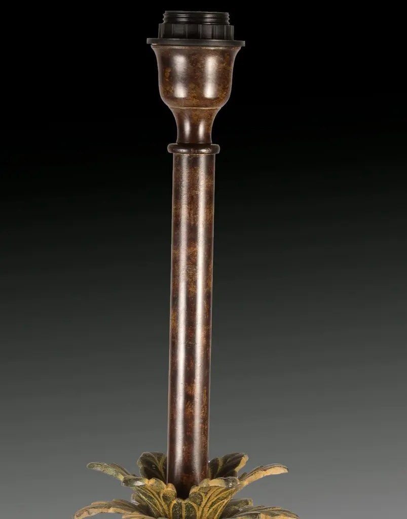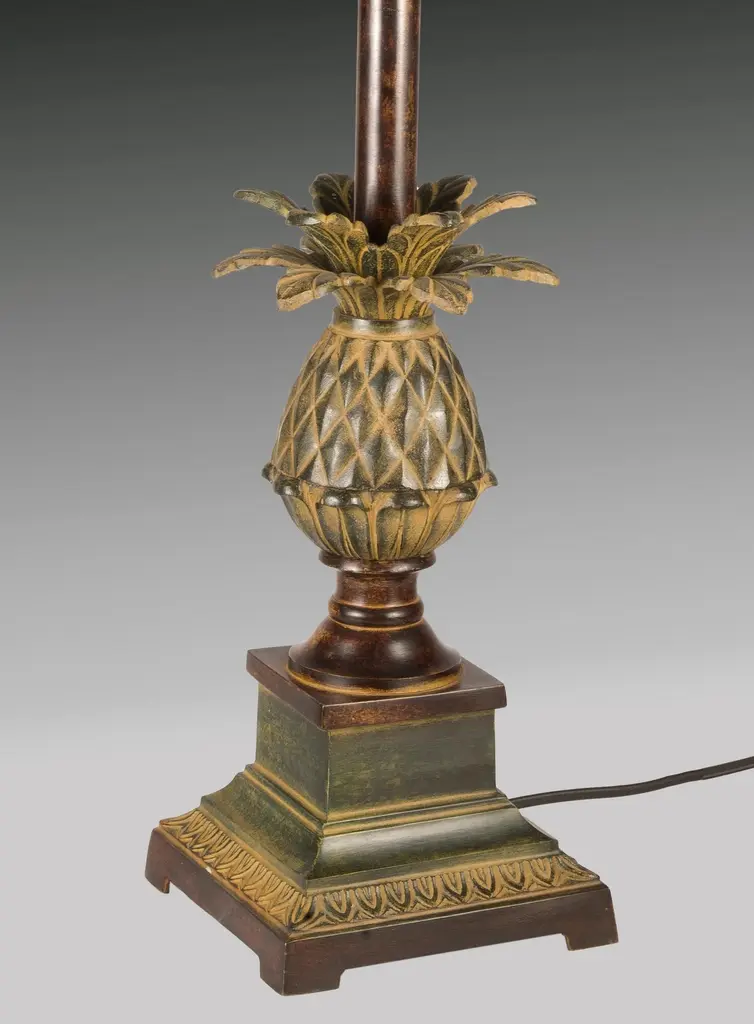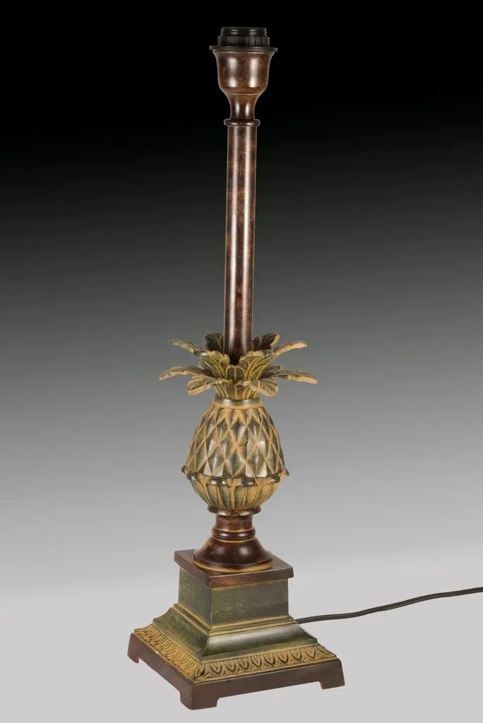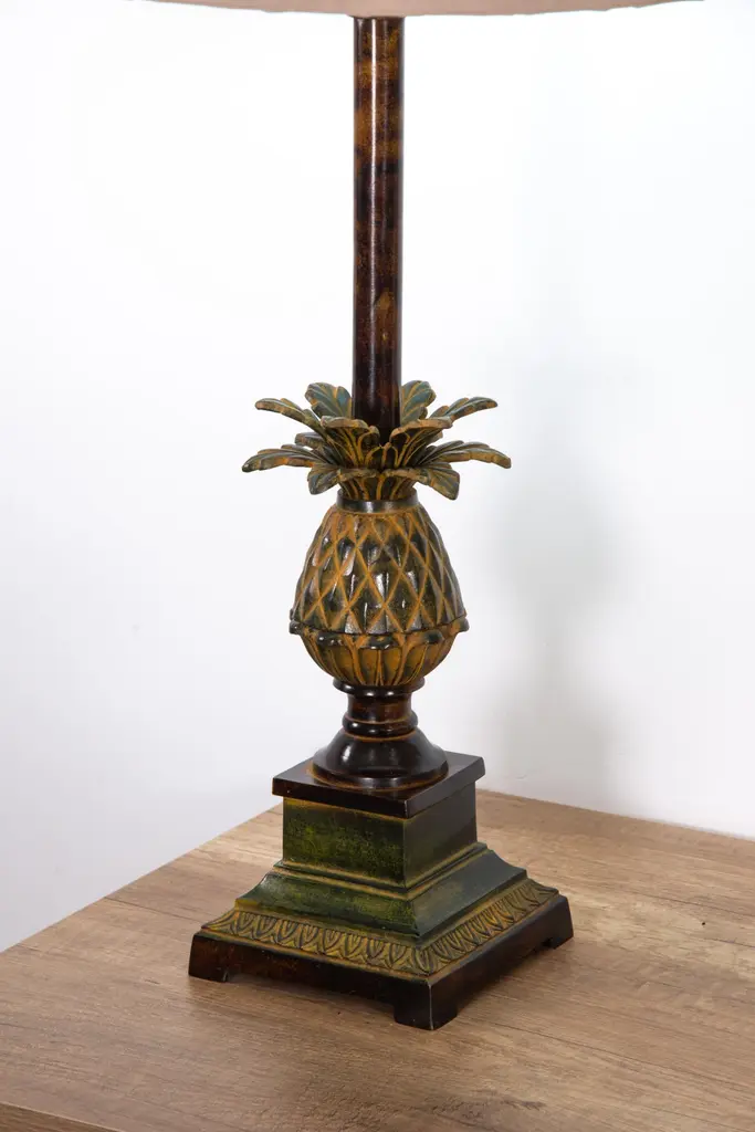 Patinated bronze lamp. No screen. A square base under a pedestal highlights the curious decorative element that stars in this work: the pineapple is formed by an oval body with rhombus decoration topped by a tuft of leaves resembling this fruit. From its upper part, a rod protrudes to support the light bulb. Weight: 3.8kg. · Size: 15x15x58 cms. Two units available, price per unit.