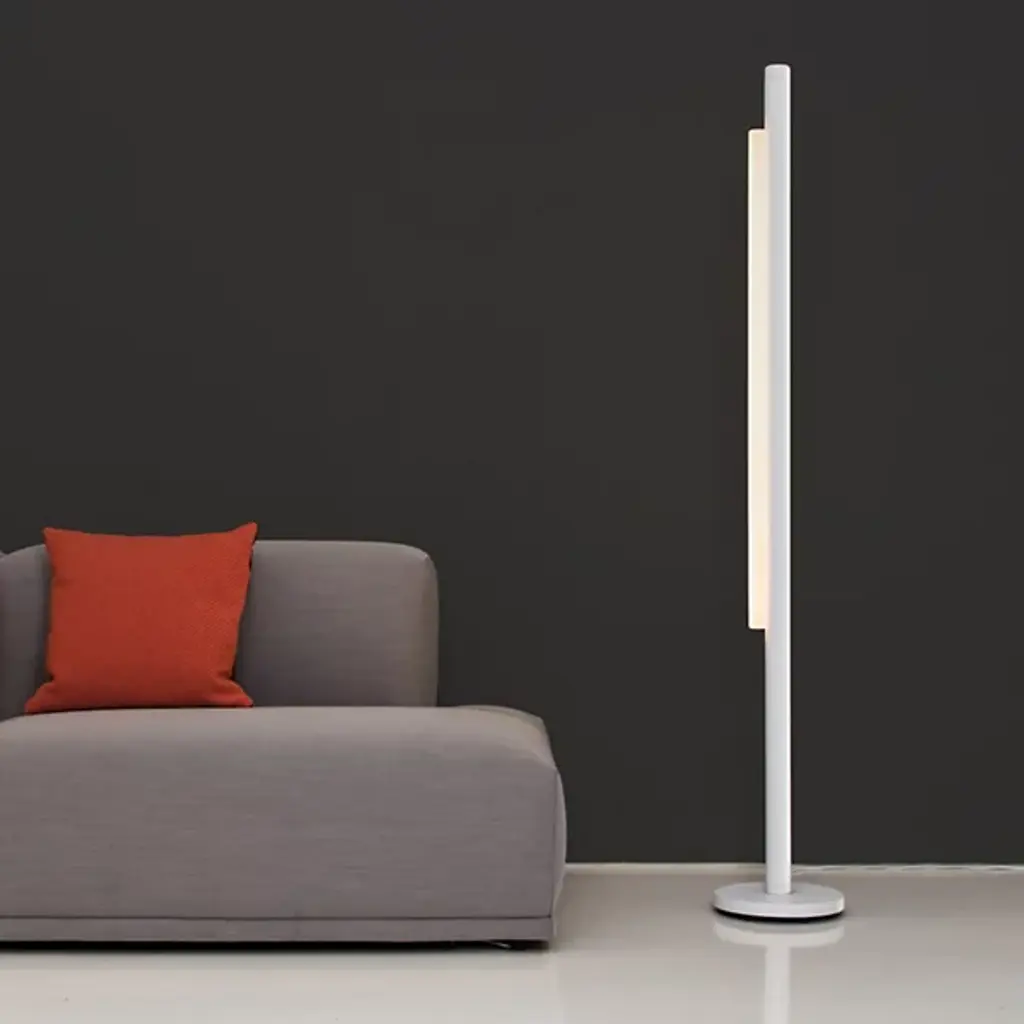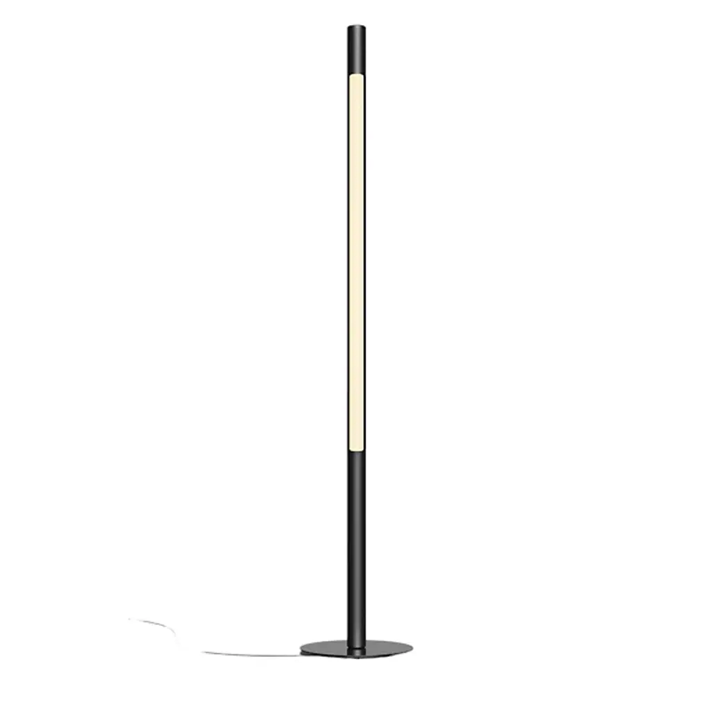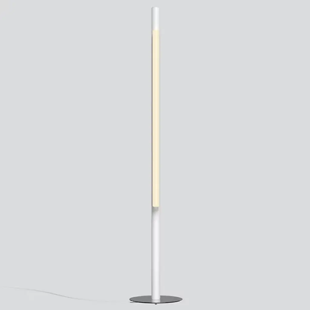 The Pipeline 125 LED Floor Lamp was designed by Caine Heintzman in 2017, and is made in Canada. A sleek and slim aluminum tube is paired with an acrylic diffuser that houses a linear LED and an aircraft cable. This minimal floor lamp adds an elegant touch and direct illumination to modern living rooms, bedrooms, and offices.