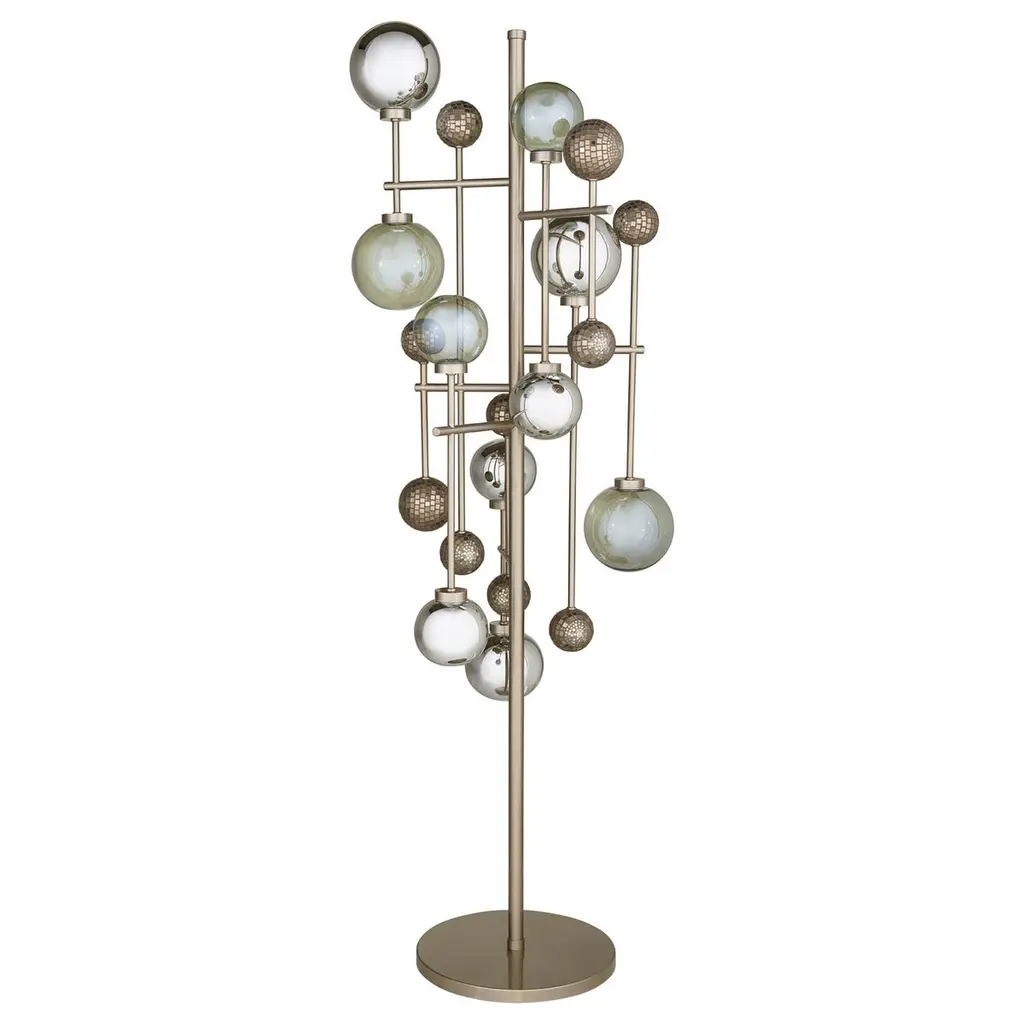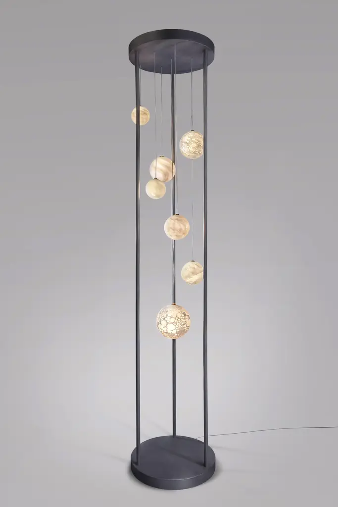 Planets floor lamp - Ludovic Clément d’Armont. Blown glass and brass. Dimensions: 220 x 55 x 55 cm. Each creation is unique. Ludovic Clément d’Armont is in the continuation of a family tradition of centuries of gentle glassmakers, painters, carpenters and artists. Both engineer and artist, he imagines new lightings combining creative emotions with optical, electronic, thermal, environmental, electrical, chemical, color, energy, mechanical and medical knowledge. His pleasure is do discuss with his clients to achieve the ideal model. This piece is attributed to the mentioned designer/maker. It has no attribution mark and no official proof of authenticity, however it is well documented in design history. I take full responsibility for any authenticity issues arising from misattribution, Up to 250V (Europe/UK Standard).