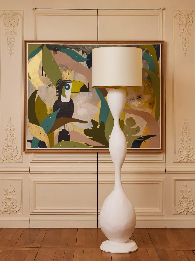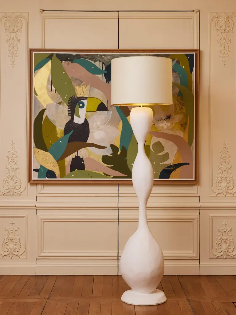 Floor-lamp in sculpted plaster signed by the artist Florence Vial.France, 2024Dimensions: Diam 32 x H 187 cm (with shade)
