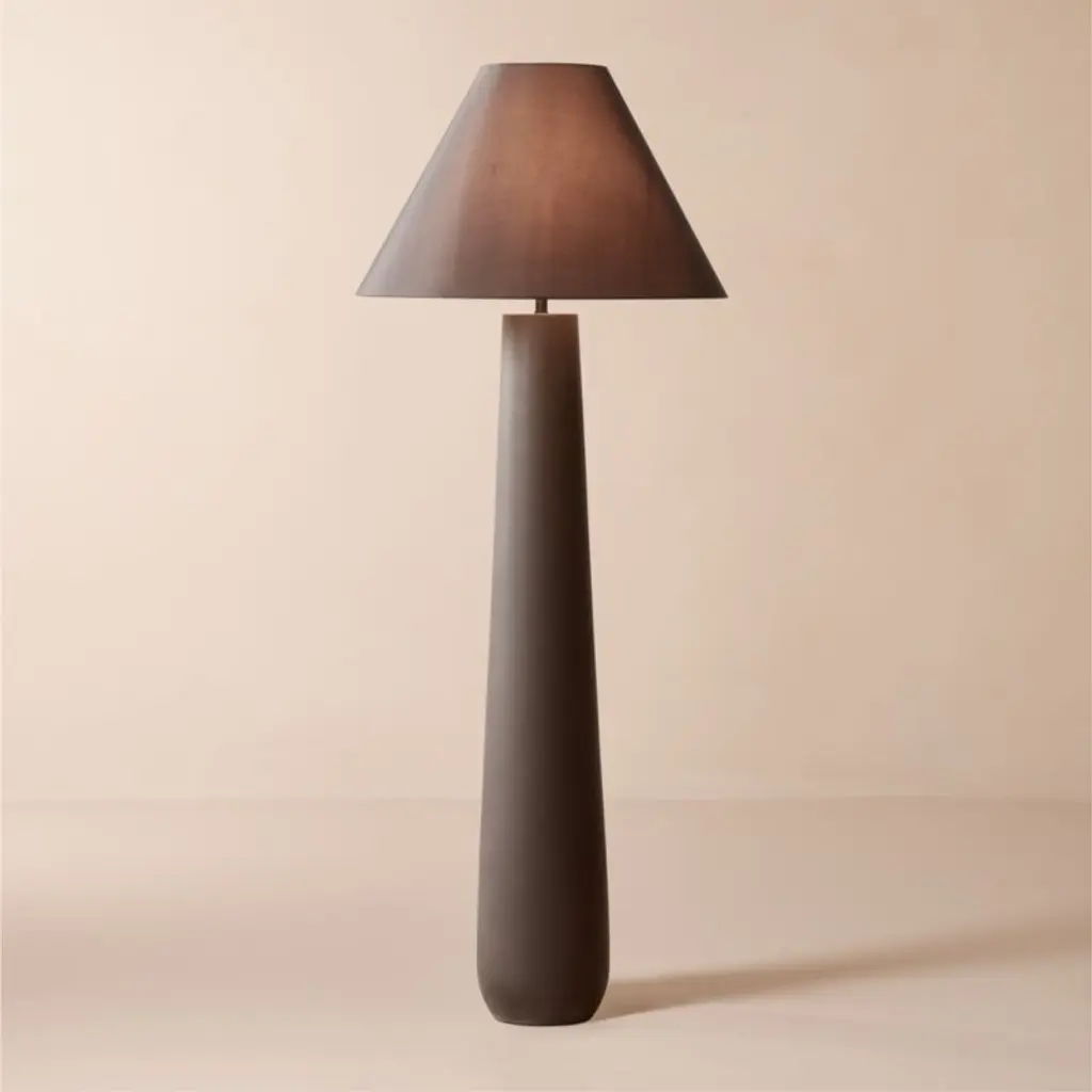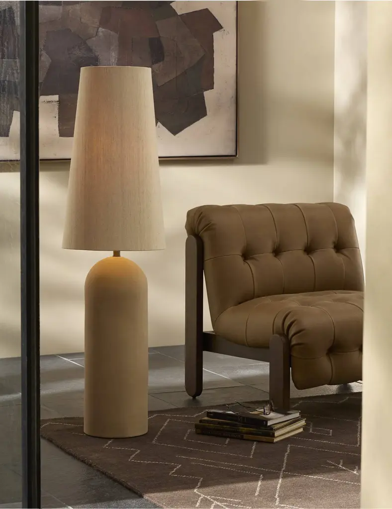 Monochromatic floor lamp stands on a solid ivory concrete base that tapers to an ivory linen shade. "We're really pushing the limits in terms of scale," explains designer Kara Mann. "We love the more substantial shades." Lamp gives off a soft light, perfect for warming up any space. CB2 exclusive.