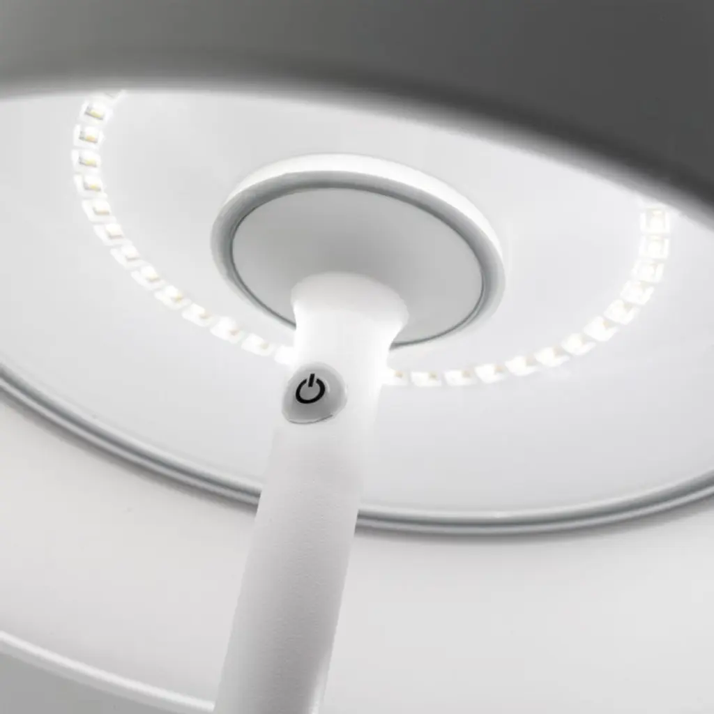 This ingenious design lets you bring the classic look and illumination of a floor lamp wherever it's needed, no cords required. Made of white-finished aluminum, the clean-lined lamp fashions a modern silhouette with a slender tube and petite taper shade. An integrated LED bulb turns on and dims with the touch of a finger and offers up to 11 hours of illumination per charge. To recharge, return the battery-operated lamp to its contact induction charging base. The Poldina Pro L adjusts to three heights and offers three color temperaturescandlelight, warm white and bright. Thanks to its durable powdercoat finish, the white floor lamp can be used indoors or out.