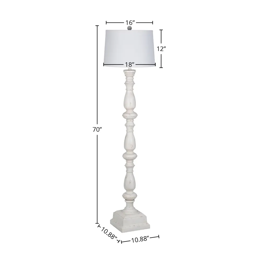 Experience the exquisite elegance of our Polyresin 70" Floor Lamp, a true masterpiece in distressed white resin, adorned with an off-white linen, round hardback shade. Effortlessly installed with a standard 120-volt power supply, this lamp radiates a warm glow, gracing your space with charm and sophistication. Crafted from high-quality resin, its sturdy lamp base ensures durability that will stand the test of time. Seamlessly compatible with E26 medium base bulbs, this lamp offers convenience at your fingertips, allowing you to tailor the lighting to your preference. With its included 72" power cord, find the perfect spot to showcase this enchanting piece in any corner of your space. Worries are kept at bay, for this lamp bears the coveted "dry location listing," ensuring a safe and worry-free lighting experience. Maintaining its allure is a breeze, as the off-white linen shade delights in being low-maintenance and easy to clean.FeaturesGeneral InformationDimensions:Floor LampRequirementsElevate your space with Lamps Per Sé, your trusted source for exquisite lamps and accent furniture. Based in Troutman, NC, we offer a curated selection of high-quality, budget-friendly, and on-trend collections that cater to your unique style and needs. Our commitment to customer satisfaction means personalized assistance to discover products that truly resonate with you. At Lamps Per Sé, we take pride in delivering top-tier service and a stunning array of lamps and accent pieces, ensuring your home reflects your personality, whether you're embracing coastal serenity or mountain tranquility. Discover your perfect decor today!