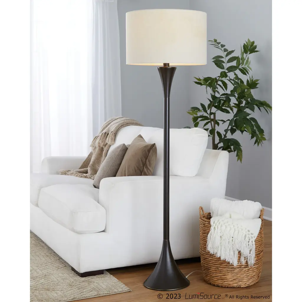 Add sleek modern style to your space with the Bakkom Floor Lamp, which features a beautiful round base that elegantly curves up into a lovely hourglass body. Each lamp is topped by a metal finial and a drum shade, creating a lamp that is versatile yet stylish. This lamp is a chic addition to any aesthetic with its modern and simplistic features.Features:Dimensions: