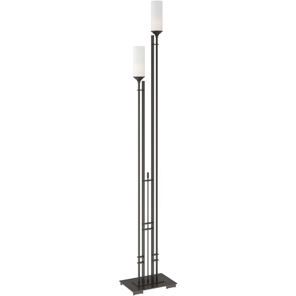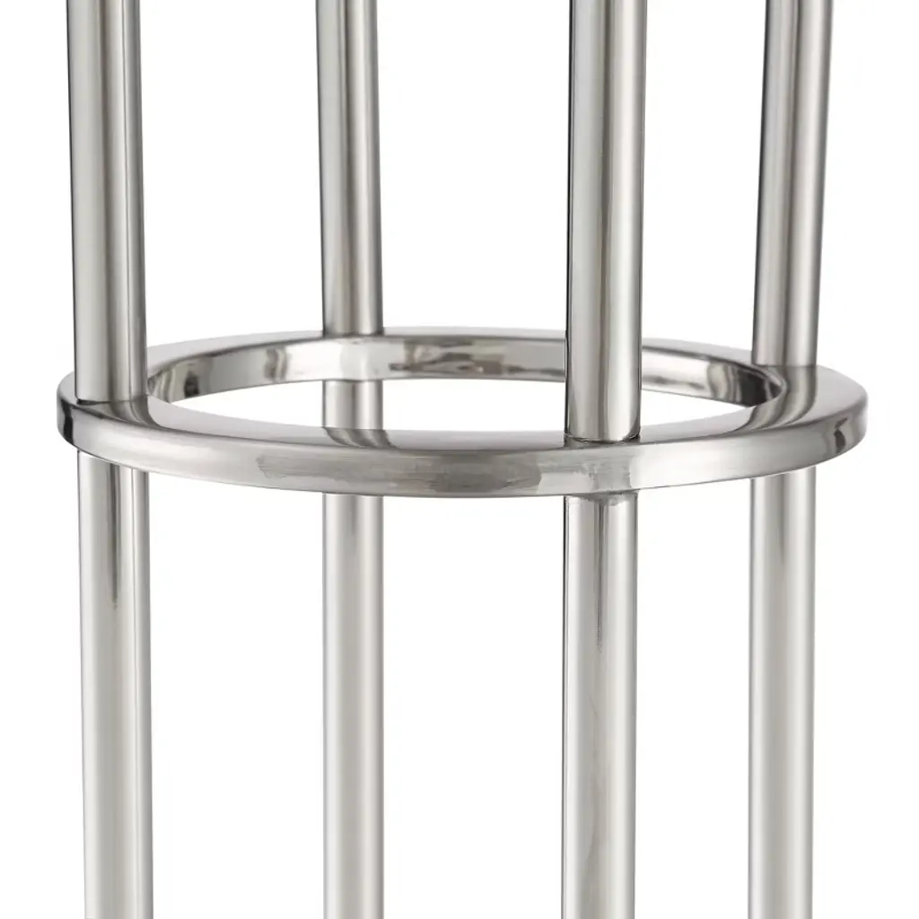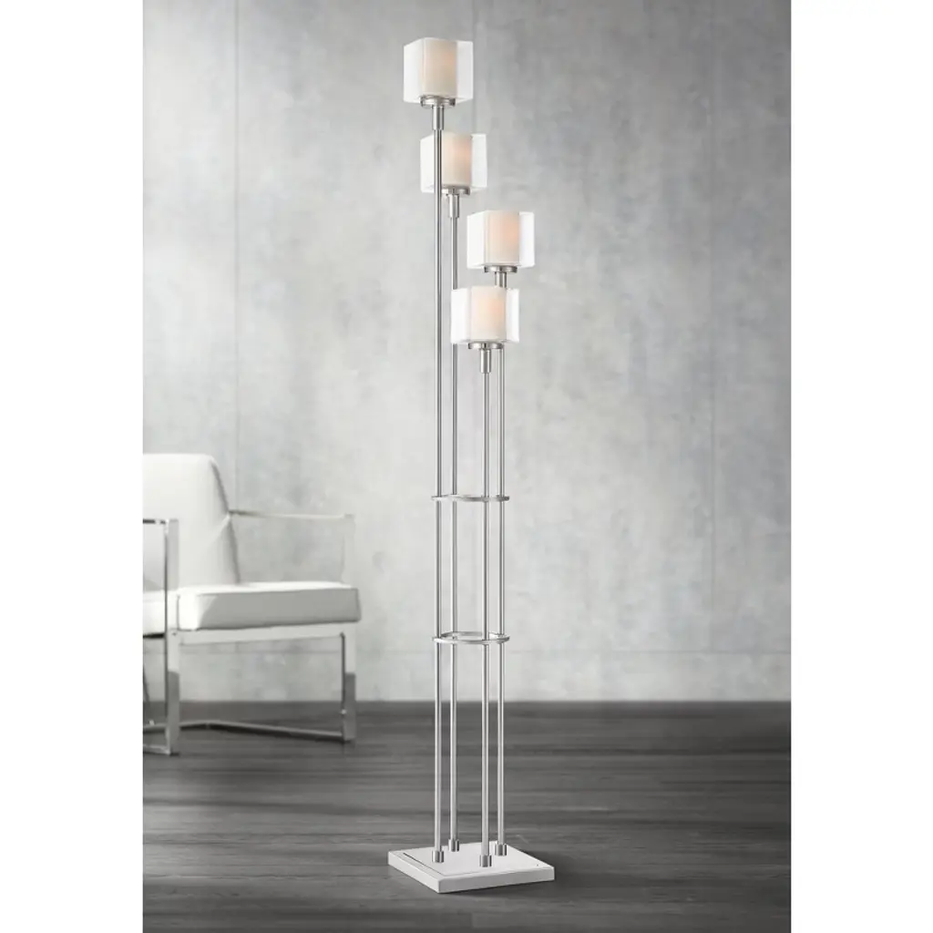 This contemporary four-light tree floor lamp comes in a sleek brushed nickel finish metal frame. Four poles of different lengths arise from a square base, giving the design a staggered height look. At the top of each pole is a double glass shade, which consists of a clear glass shade that encases an opal glass shade.