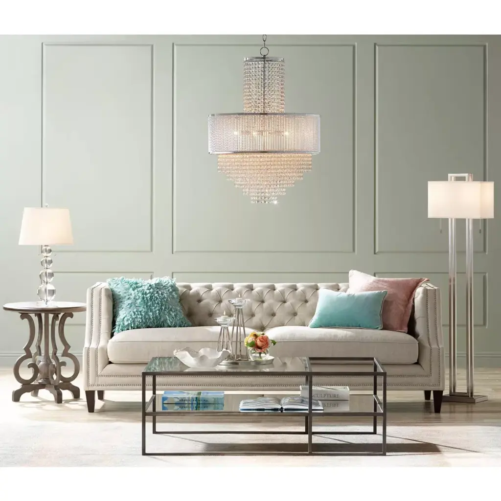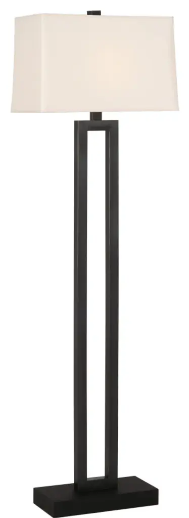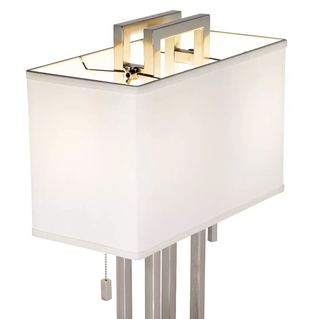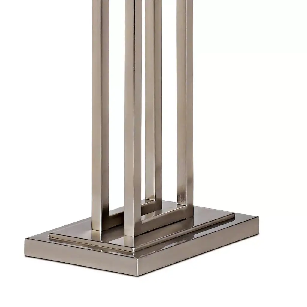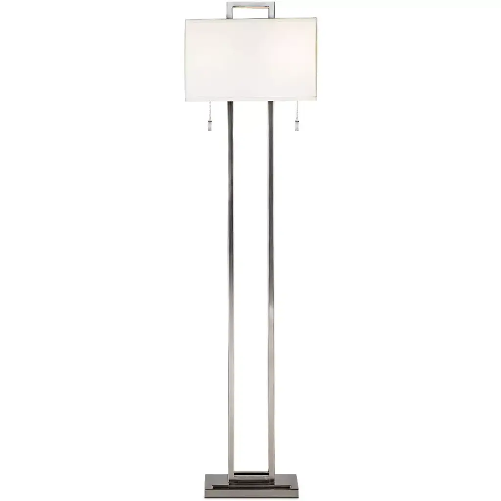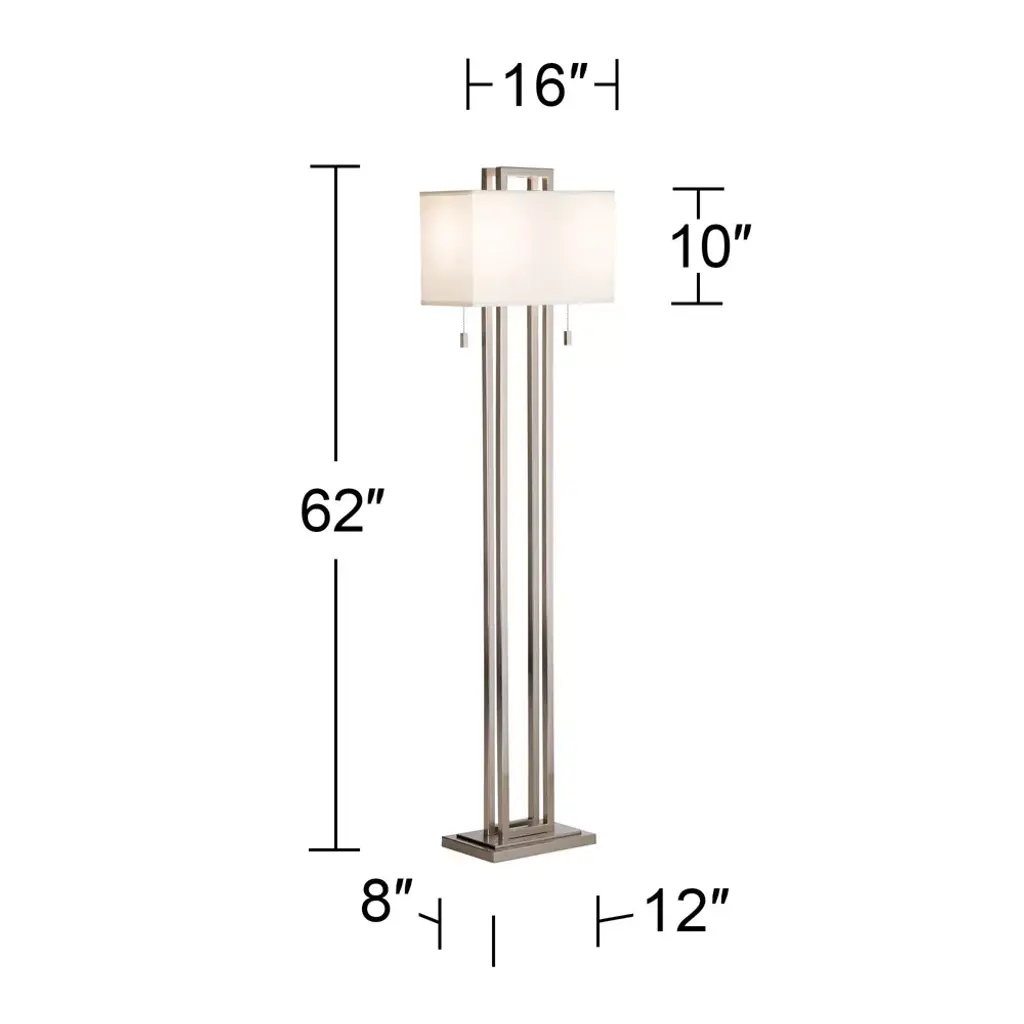 Complement your stylish home with this clean-lined contemporary floor lamp. The design features a matched pair of openwork brushed nickel finish rectangles whose top edges extend beyond the top of the off-white fabric box shade. Double pull chains allow for easy lighting control.