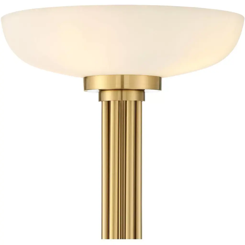 From Possini Euro Design®, this exceptional metal torchiere floor lamp displays a warm antique brass finish that is both elegant and welcoming. A frosted glass shade ensures true, diffused illumination for any living area. Evoking an elevated industrial motif, this lamp features a round base and six-piece metal tube body.