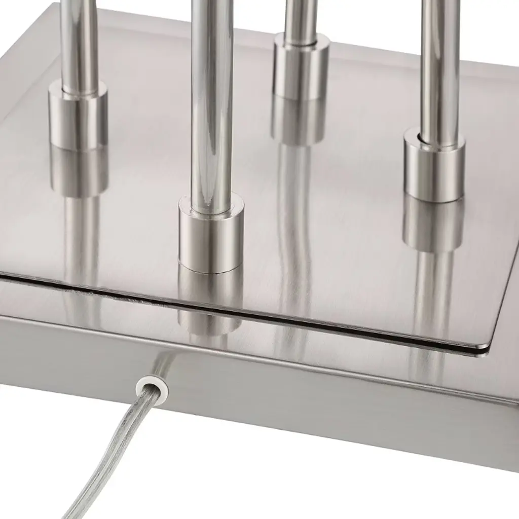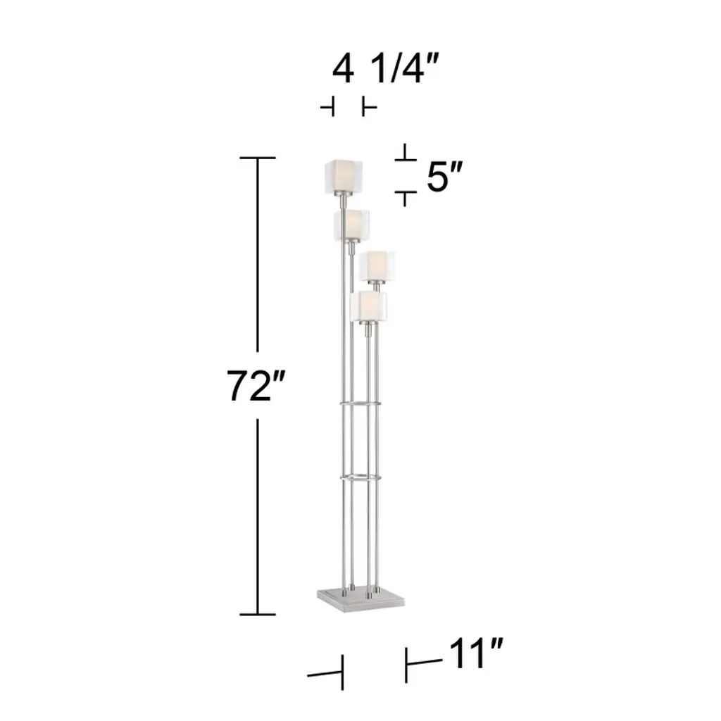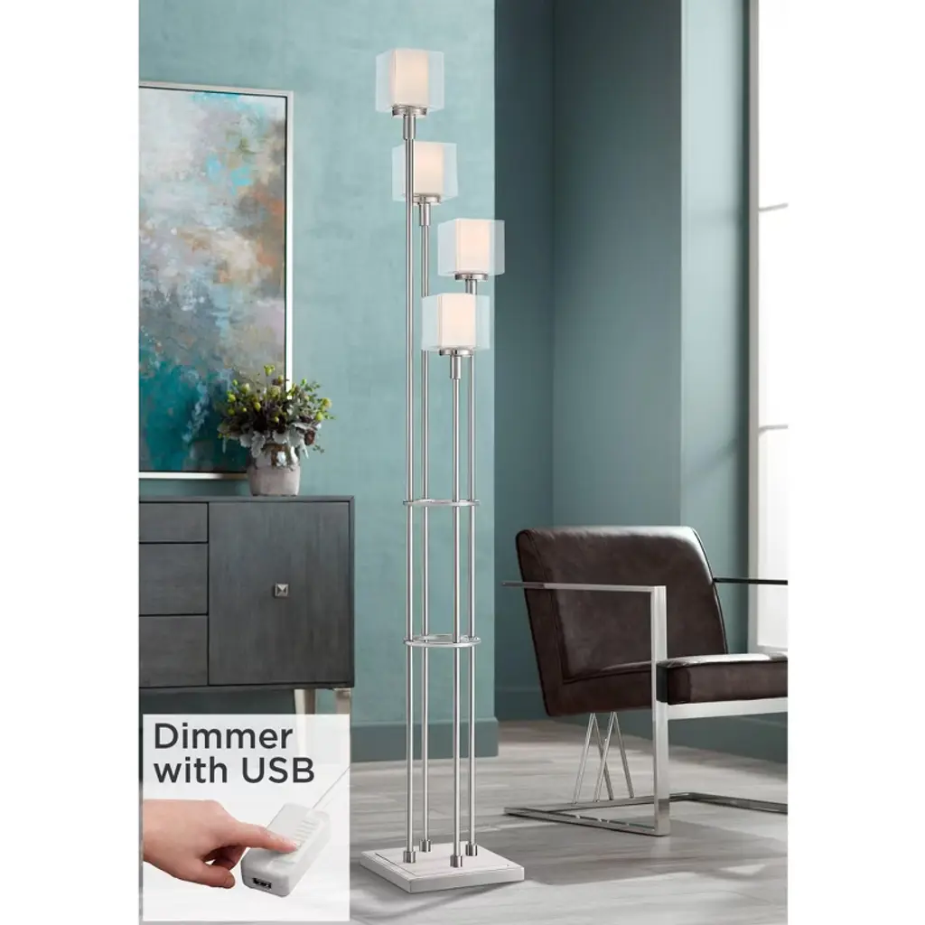 This contemporary four-light tree floor lamp with a USB dimmer comes in a sleek brushed nickel finish metal frame. Four poles of different lengths arise from a square base, giving the design a staggered height look. At the top of each pole is a double glass shade, which consists of a clear glass shade that encases an opal glass shade. The tabletop dimmer works with dimmable LED bulbs, and it also comes with a built-in USB port, allowing you to easily charge phones and other devices.