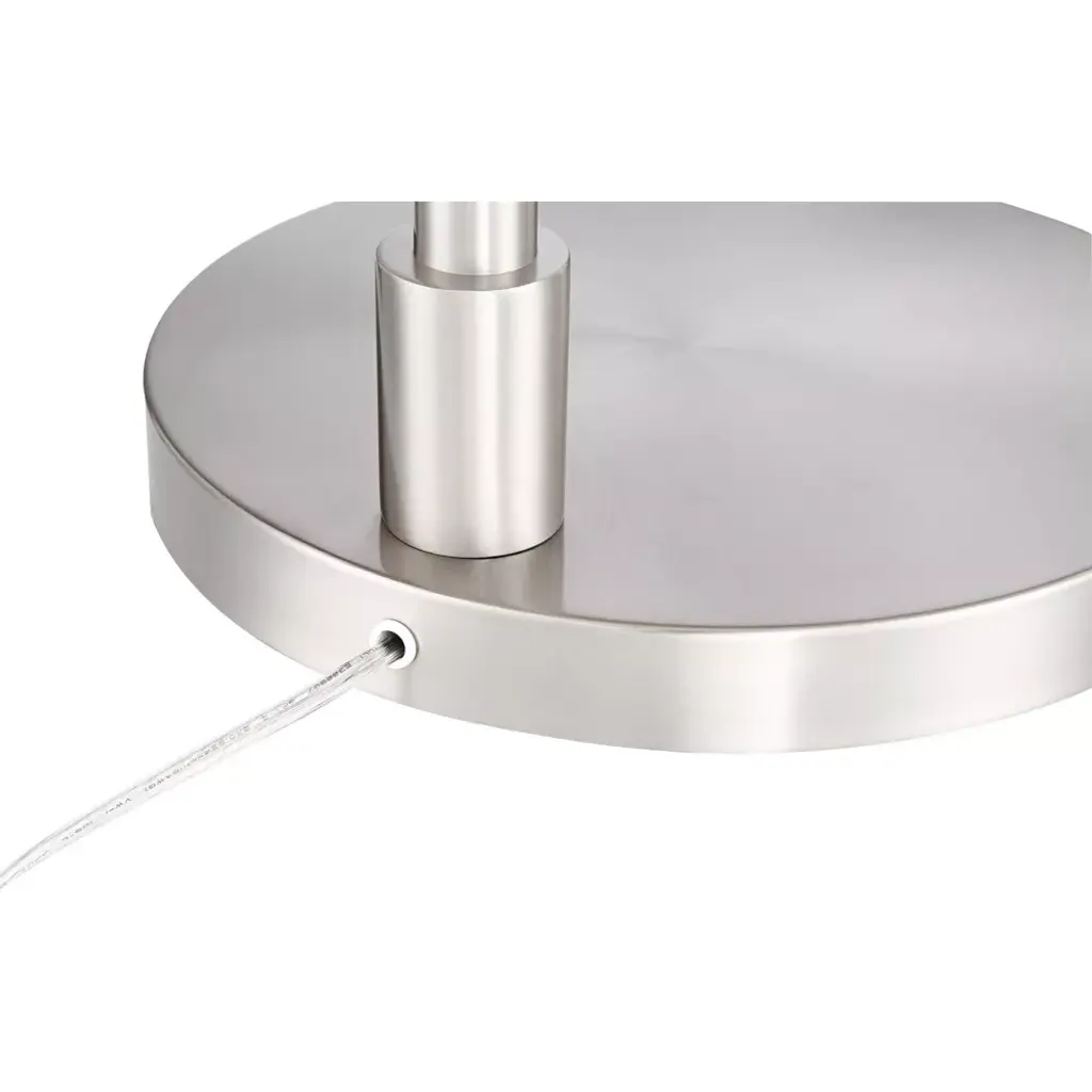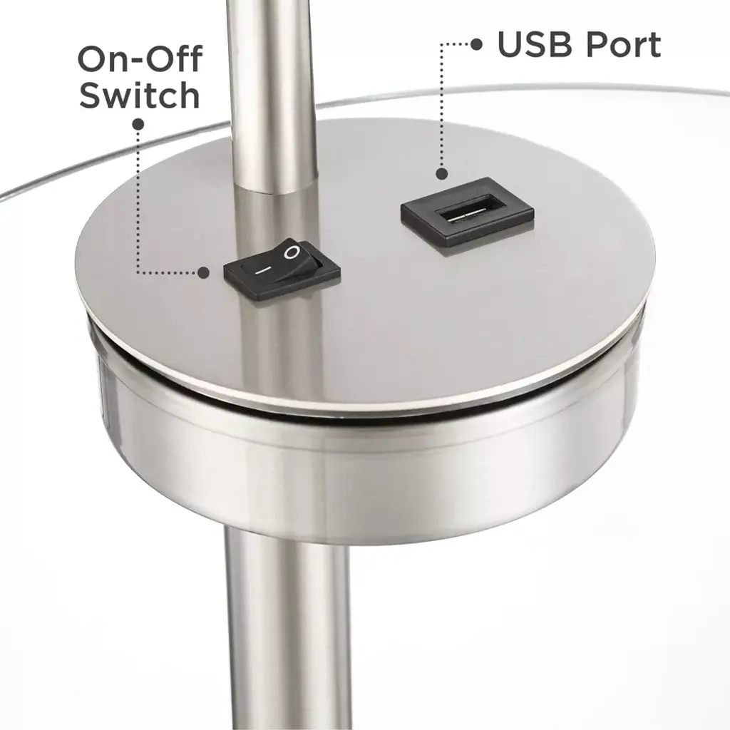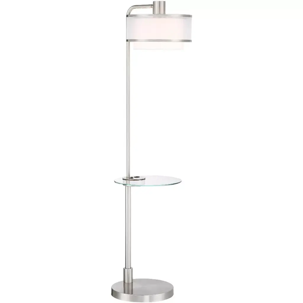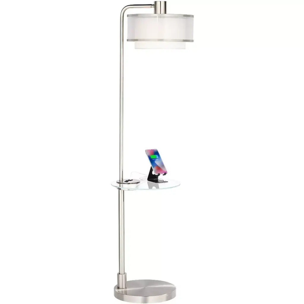 Double up on function while you energize a modern room with style. Adding a handy glass tray table, designers at Possini Euro Design® present an enticing option for illuminating a space dedicated to work and leisure alike. With a brushed nickel finish metal body and an outer silver organza shade that enhances an inner white linen shade, its finished look creates stylish verve and attitude. This sleek floor lamp features a handy USB port and operates with an on-off rocker switch.
