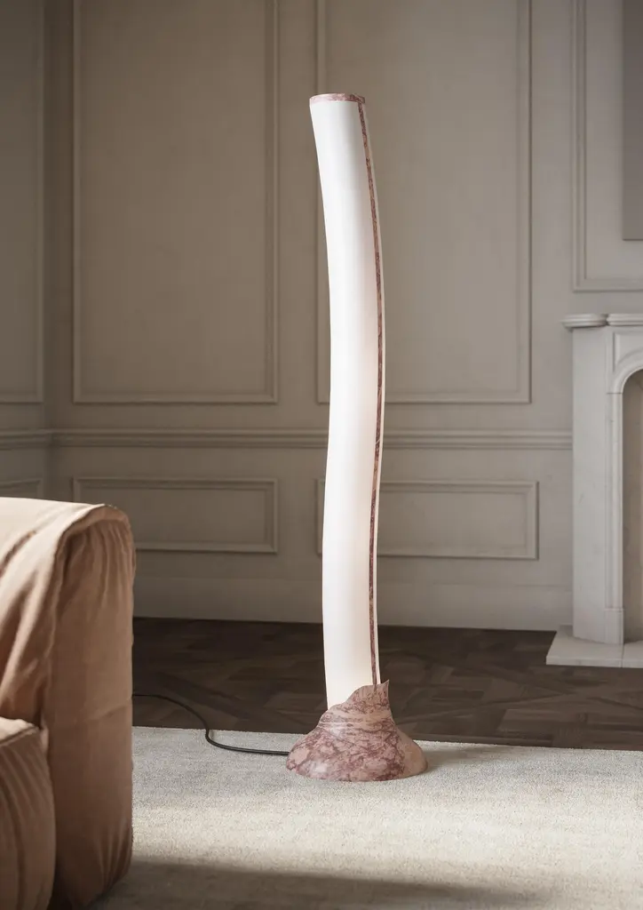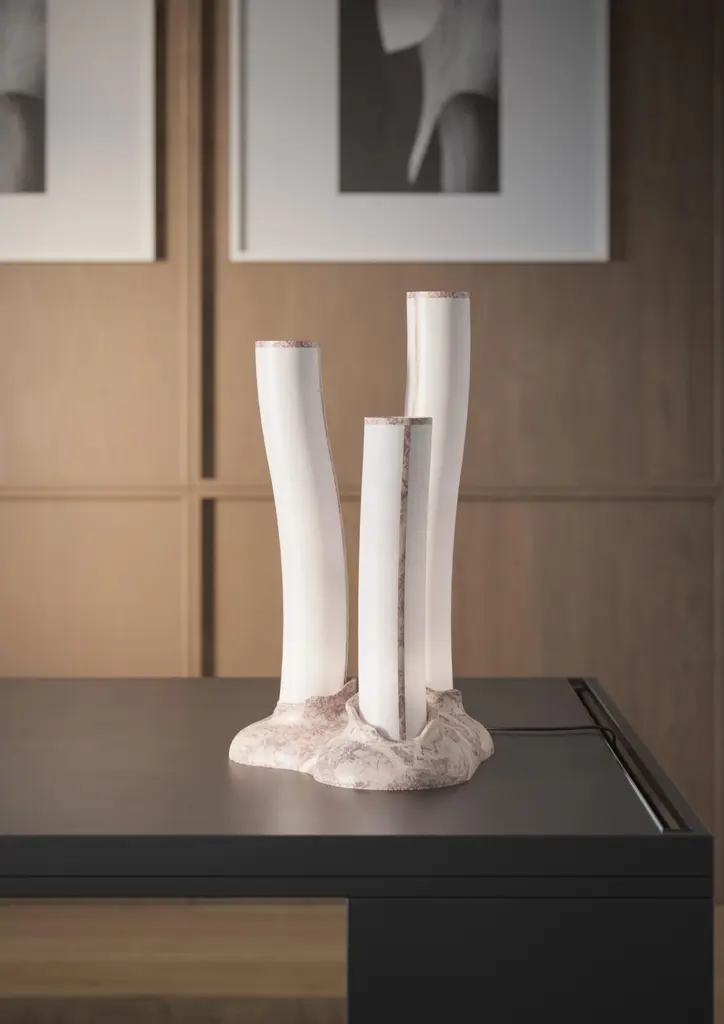 Grand Reef in white Michelangelo and Fior di Pesco Carnico Marbles, by Jacopo Simonetti Vibrations of light and matter “The sculptor doesn’t try to translate his thought into marble: he thinks in marble, directly, as if everything were already marble,” wrote André Gide. His words perfectly sum up Jacopo Simonetti’s work and style. The young designer has created a lightweight yet eternal lamp, vibrant and bright yet porous. He thought in marble, like someone who has long known and worked with this exquisite material, drawing inspiration from the gentle, sinuous lines of coral reefs. Marble and coral, both of them exquisite and delicate, elegant and natural materials. The result is a lamp whose light pairs with the uniqueness of marble to recreate the allure of the marine world for a cosy, exclusive ambience. Also available as a single and triptych table lamps. Size: 28 x 143.5 cm, 11.0 x 56.5 in. Commercial name: TheReefLight_High, by the young tuscan designer Jacopo Simonetti. Made in Italy, hand finished. **The lamps are sold and shipped without power supply and dimmer switch that anyway are complimentary and shipped to customers directly **The lamp electrical components are UL certified for sales outside EU. The lamps are CE certified for sales inside EU The item is made to order. Please note that marbles and stones are natural materials, and therefore can differ slightly in appearance - even when coming from the same quarry or the same block. Picture can then differ slightly from purchased item, as every piece is unique.