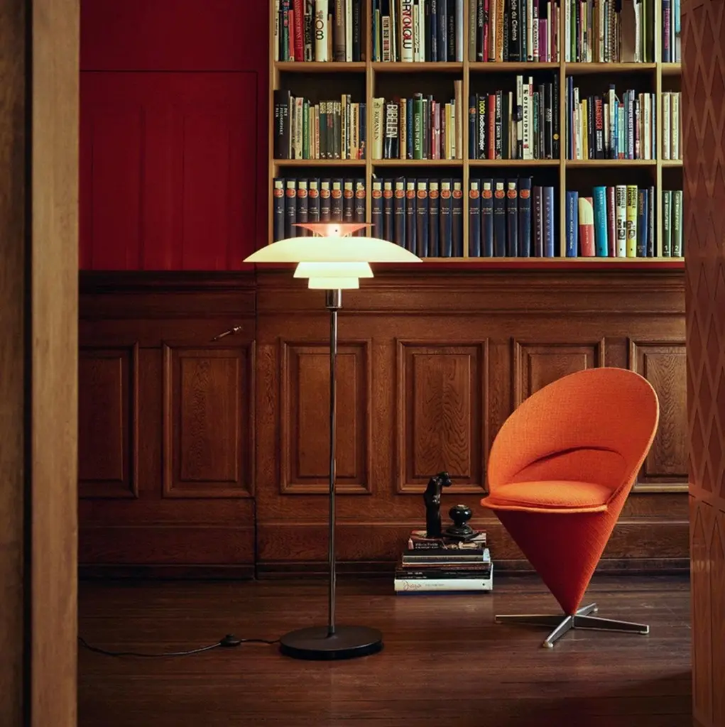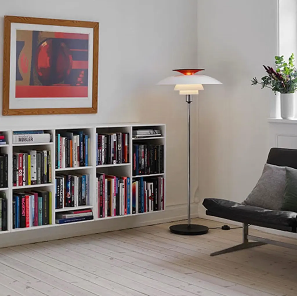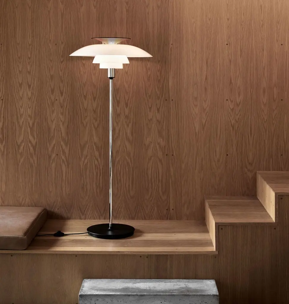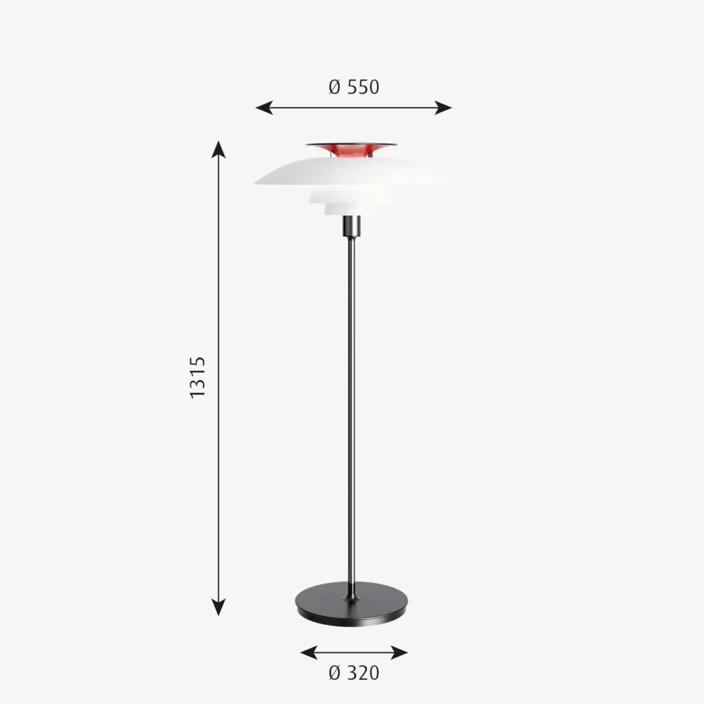 Poul Henningsen 'PH 80' floor lamp in white and chrome for Louis Poulsen. New, current production.Poul Henningsen designed the three-shade-system back in 1925-26. In collaboration with Louis Poulsen, Henningsen designed the first lamps to use the system for an exhibition in Paris. This partnership continued up until Henningsen's death in 1967. Throughout his life, Henningsen sought to create direct, glare-free light that provided illumination where it was needed most—and to create soft shadows, using incandescent bulbs as a light source. PH 80 belongs to Henningsen’s three-shade family. Henningsen did not just design a light—he designed an entire system, with around a thousand different models being produced over the years. Henningsen was the first to pursue a scientific approach to lighting, using a logarithmic spiral as his starting point. By basing his design on the logarithmic spiral, he achieved an even distribution of light across the entire curvature of the shade. This even light distribution, combined with the diffused reflection through the glass, made it possible to control glare and shadows. Due to its distance from the light source, each shade equally reduces the amount of light. PH 80 is based on this same three-shade design. PH80, the lamp's model number, does not refer to the top shade's diameter, which is the system that usually applies to the three-shade models. The light was created in 1974 after Henningsen’s death to mark the 80th anniversary of his birth—hence the name PH 80. The original PH 80, designed in 1974, features a characteristic red top reflector that provides warm and atmospheric lighting. The opal acrylic shades add a fresh look and provide attractively diffused ambient light. PH 80 was later introduced in a black and a white finish with a smoother surface on the base compared to the slightly more rough surface on the classic version. The black PH 80 has a black top plate and a white top reflector for a clean, elegant look and pleasant light distribution. The stand and socket holder are matte-black, which adds a beautiful contrast to the opal acrylic shades for a more graphic look. The white version adds a minimalist all-white design to the PH 80 range with its white top reflector, top plate, and stand. This monochrome color palette completes the PH 80 series with modernized and subtle alternatives to the classic PH 80.
