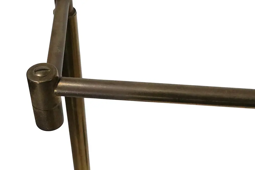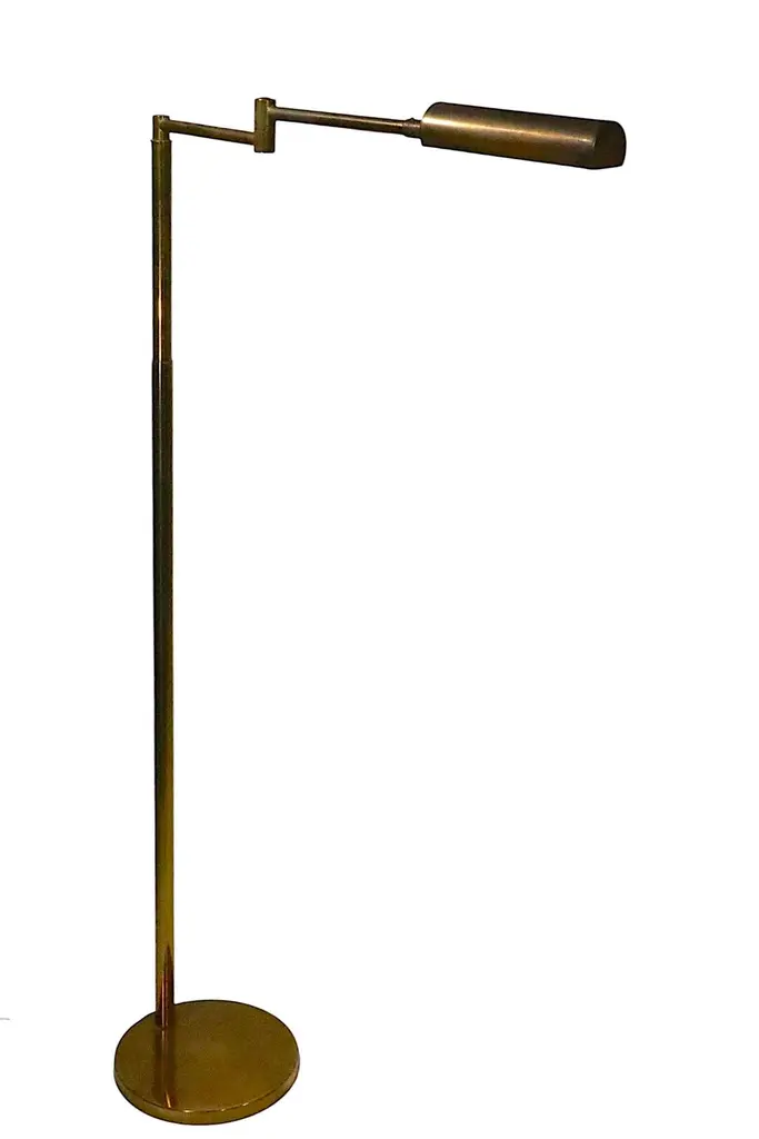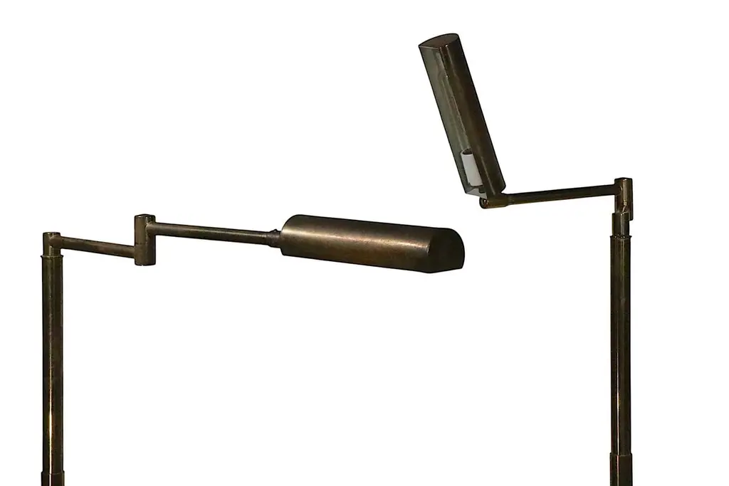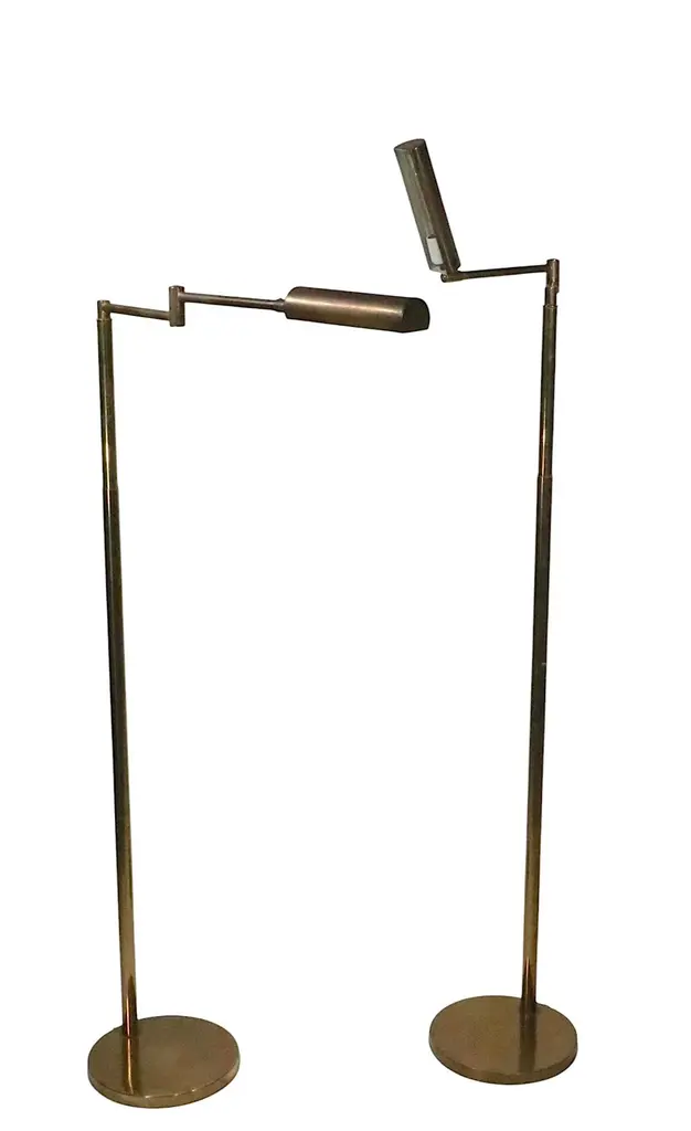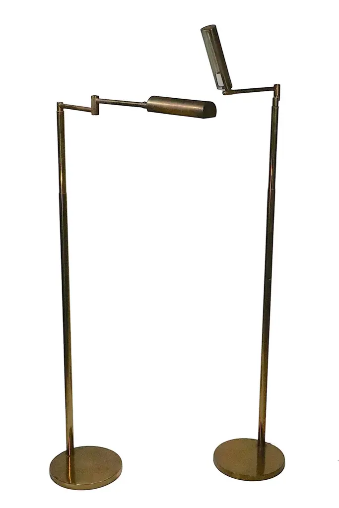 Pair of vintage pharmacy style adjustable floor lamps, attributed to Koch & Lowy, circa 1970's. The lamps feature jointed flex arms, a tilt and swivel hood shade, and an extendable vertical center pole. Both lamps are in good, original, clean and working condition, both show cosmetic wear to their finish, please see images. Executed in brass - offered and priced as a pair. Height 52.25- 41.75 Arms 25.5 ( extended ) Base Dia. 10 inches. Original, working in line foot operated on/off switch.