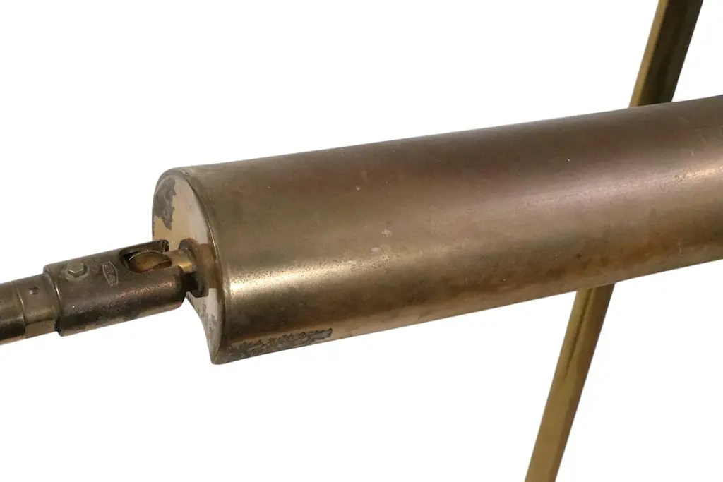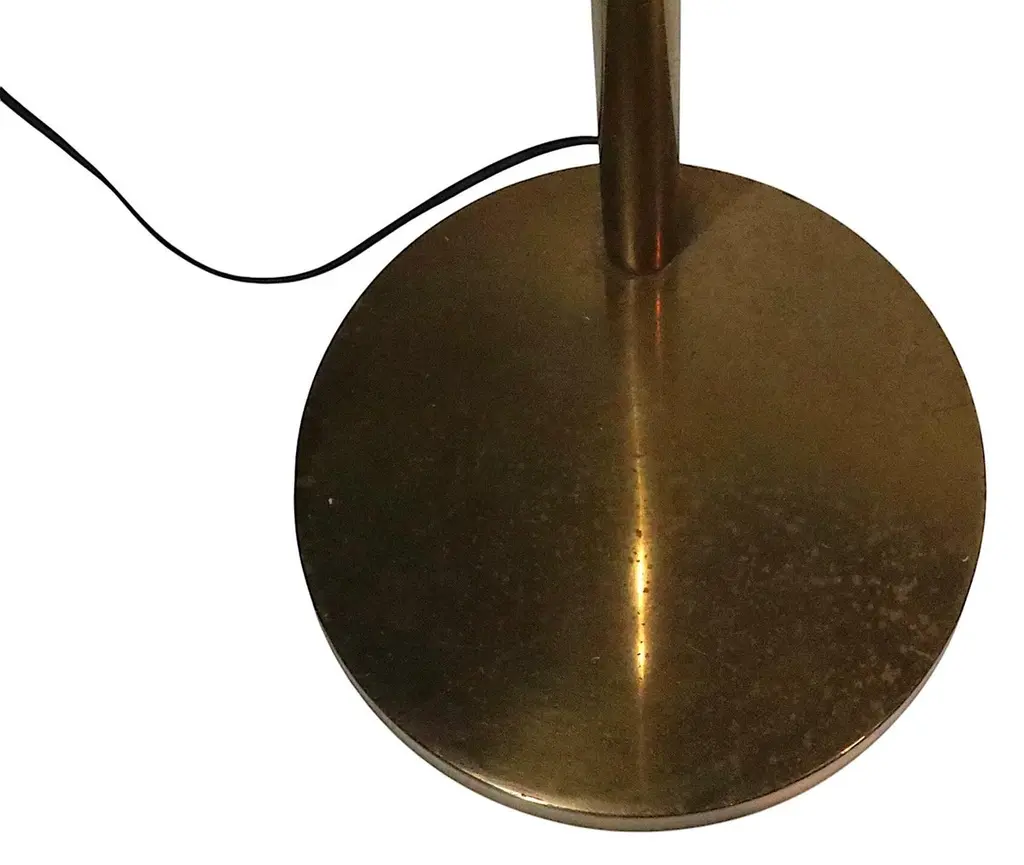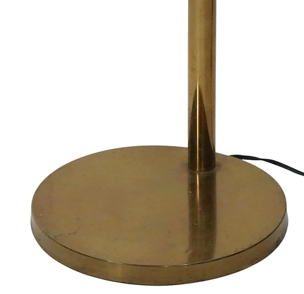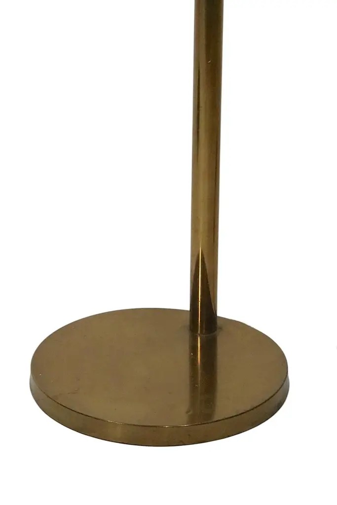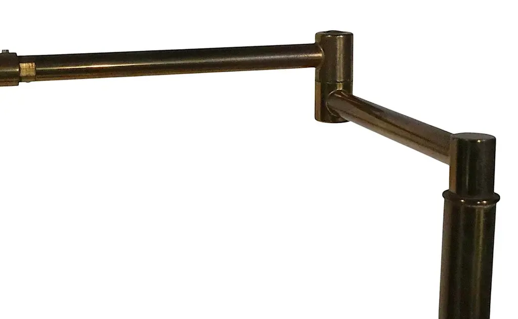 Pair of vintage pharmacy style adjustable floor lamps, attributed to Koch & Lowy, circa 1970's. The lamps feature jointed flex arms, a tilt and swivel hood shade, and an extendable vertical center pole. Both lamps are in good, original, clean and working condition, both show cosmetic wear to their finish, please see images. Executed in brass - offered and priced as a pair. Height 52.25- 41.75 Arms 25.5 ( extended ) Base Dia. 10 inches. Original, working in line foot operated on/off switch.