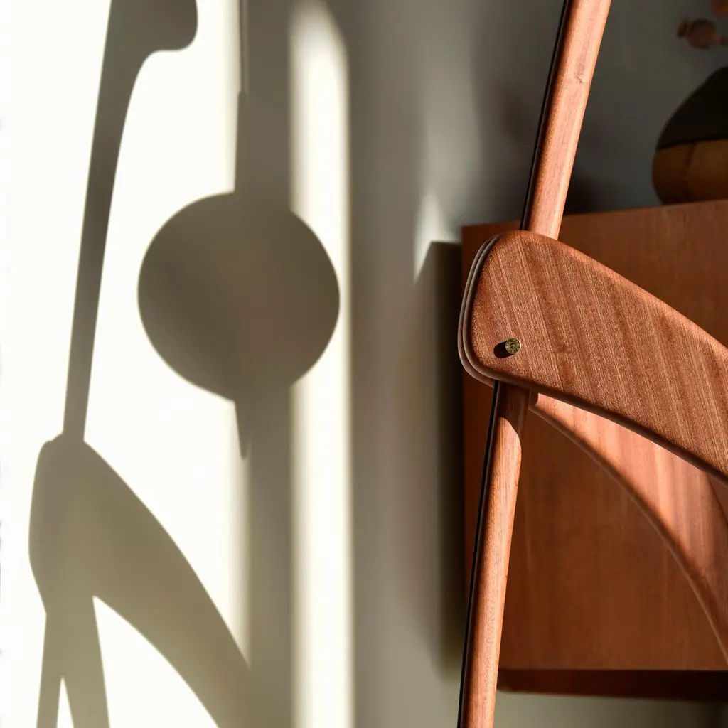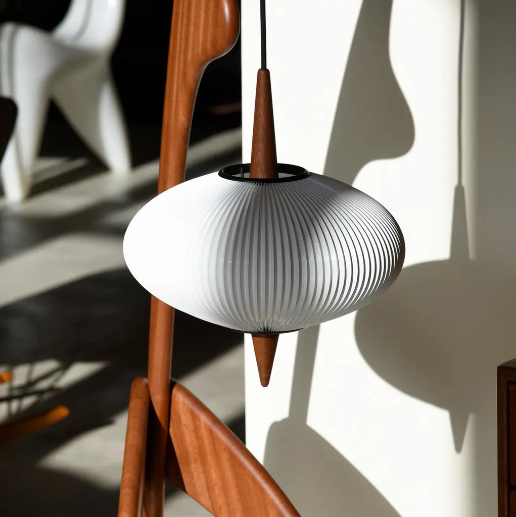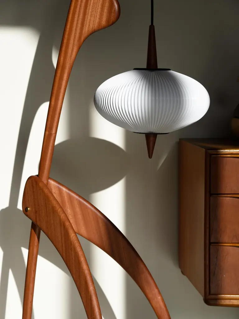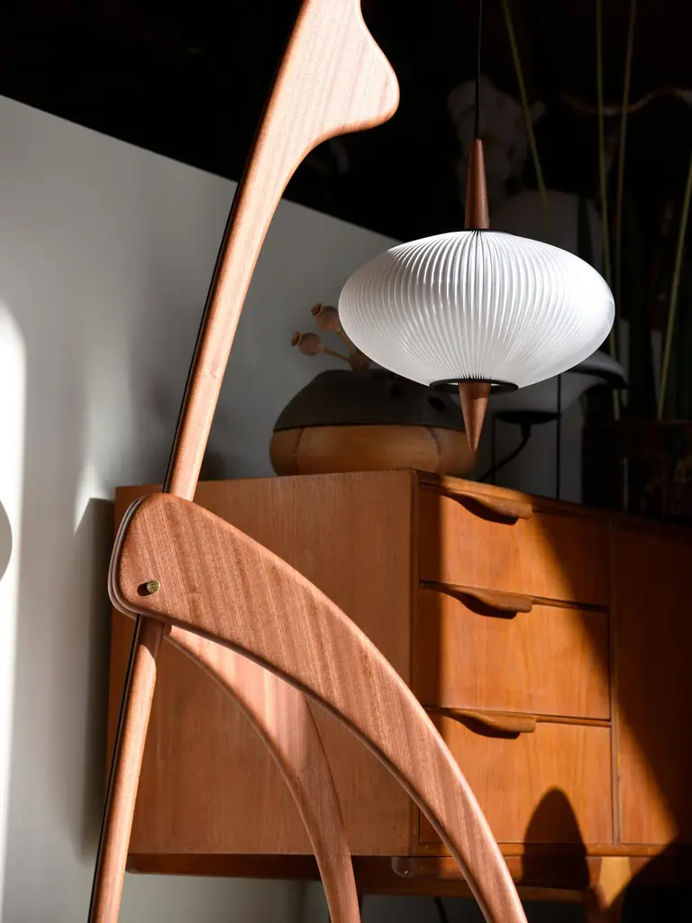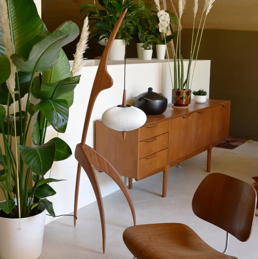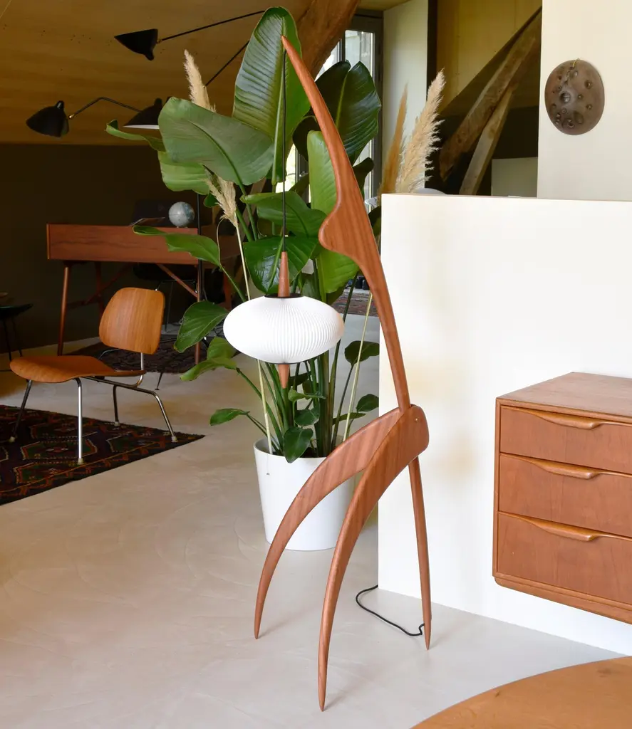 The Praying Mantis Floor Lamp by Rispal. Douglas Mont brings back Rispal’s iconic creations “Nouvelles Formes” with the release of new models. He honors at the same time the brand’s original style and DNA and pays tribute to the avant-gardism culture. Designed by the Rispal in-house team in 1950, the original model was surnamed the Mantis lamp because of its insect-like appearance. It was revealed to the public at the 36th Interior Designers Fair in Paris in 1952. First launching with a classic lampshade, it took on the iconic saucer lampshade in 1955, made with pleated cellulose acetate film – commonly called rhodoïd.Finish: Natural MahoganyDIMENSIONS:Height: 1600 mm, Base 420 x 470mm