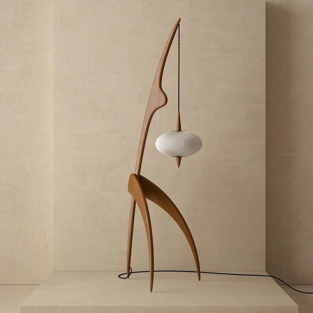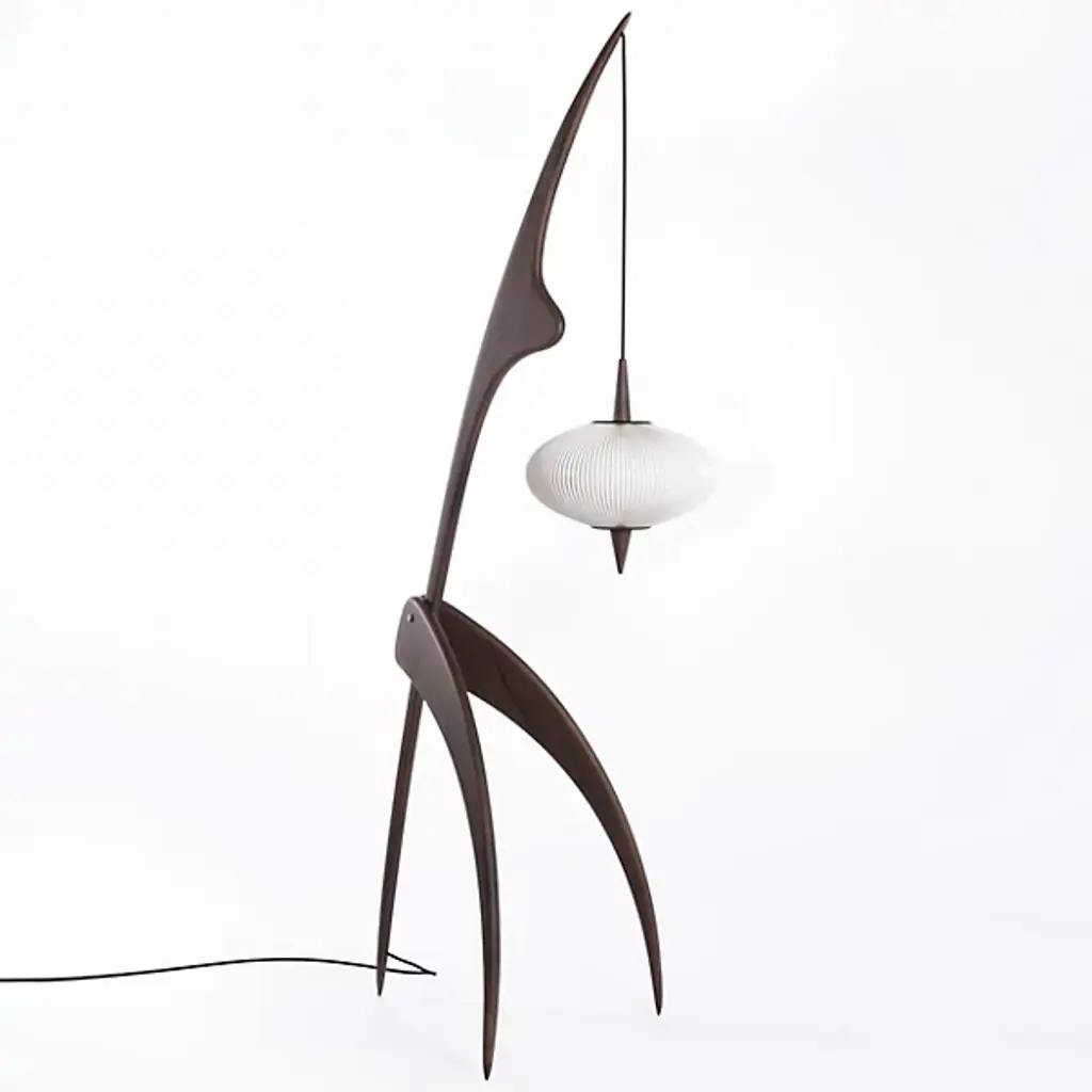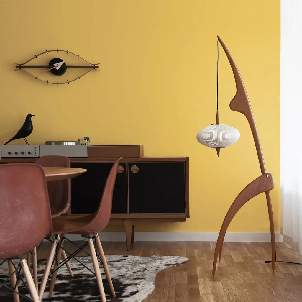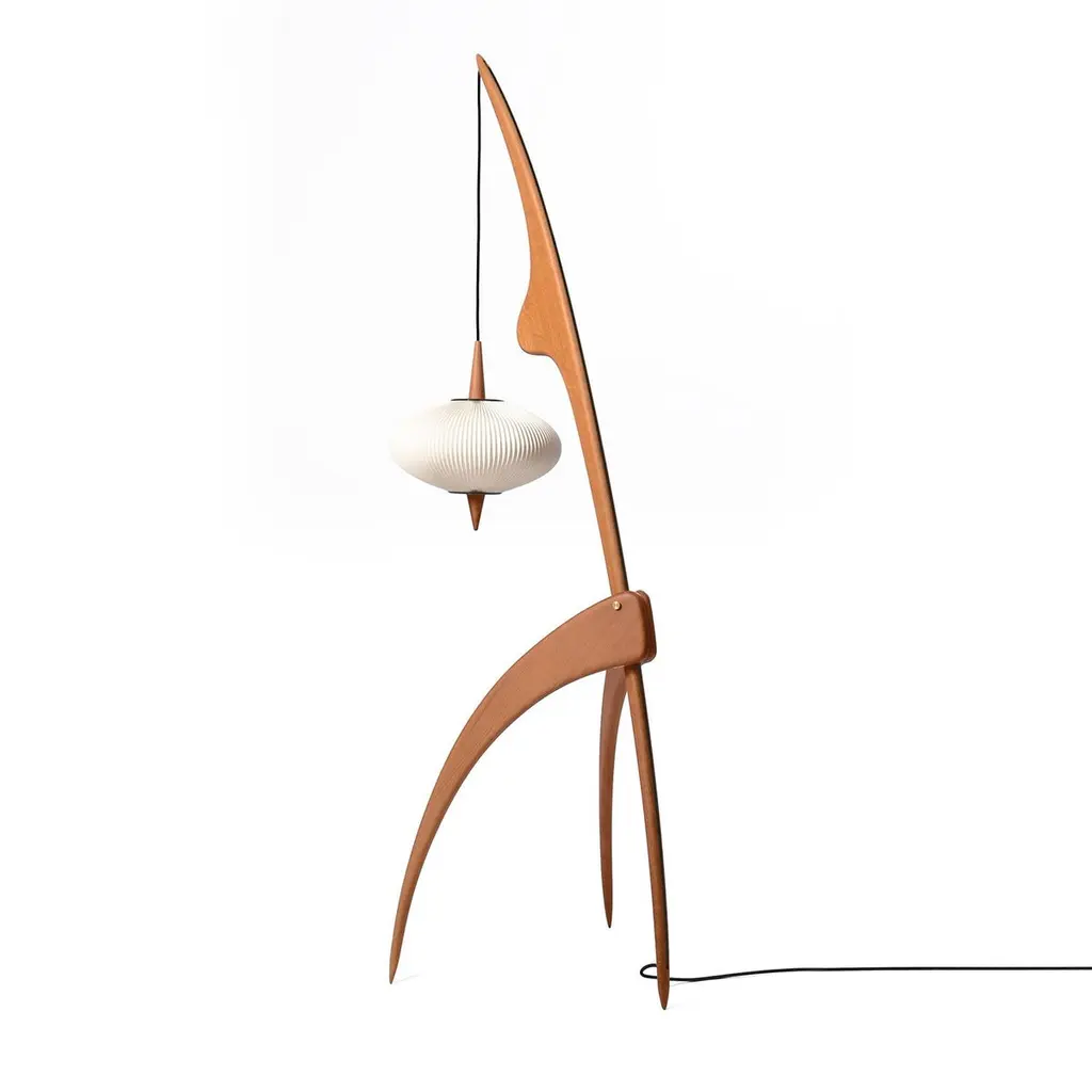 The Praying Mantis Floor Lamp by Rispal. Douglas Mont brings back Rispal’s iconic creations “Nouvelles Formes” with the release of new models. He honors at the same time the brand’s original style and DNA and pays tribute to the avant-gardism culture. Designed by the Rispal in-house team in 1950, the original model was surnamed the Mantis lamp because of its insect-like appearance. It was revealed to the public at the 36th Interior Designers Fair in Paris in 1952. First launching with a classic lampshade, it took on the iconic saucer lampshade in 1955, made with pleated cellulose acetate film – commonly called rhodoïd.Finish: Vintage OakDIMENSIONS:Height: 1600 mm, Base 420 x 470mm