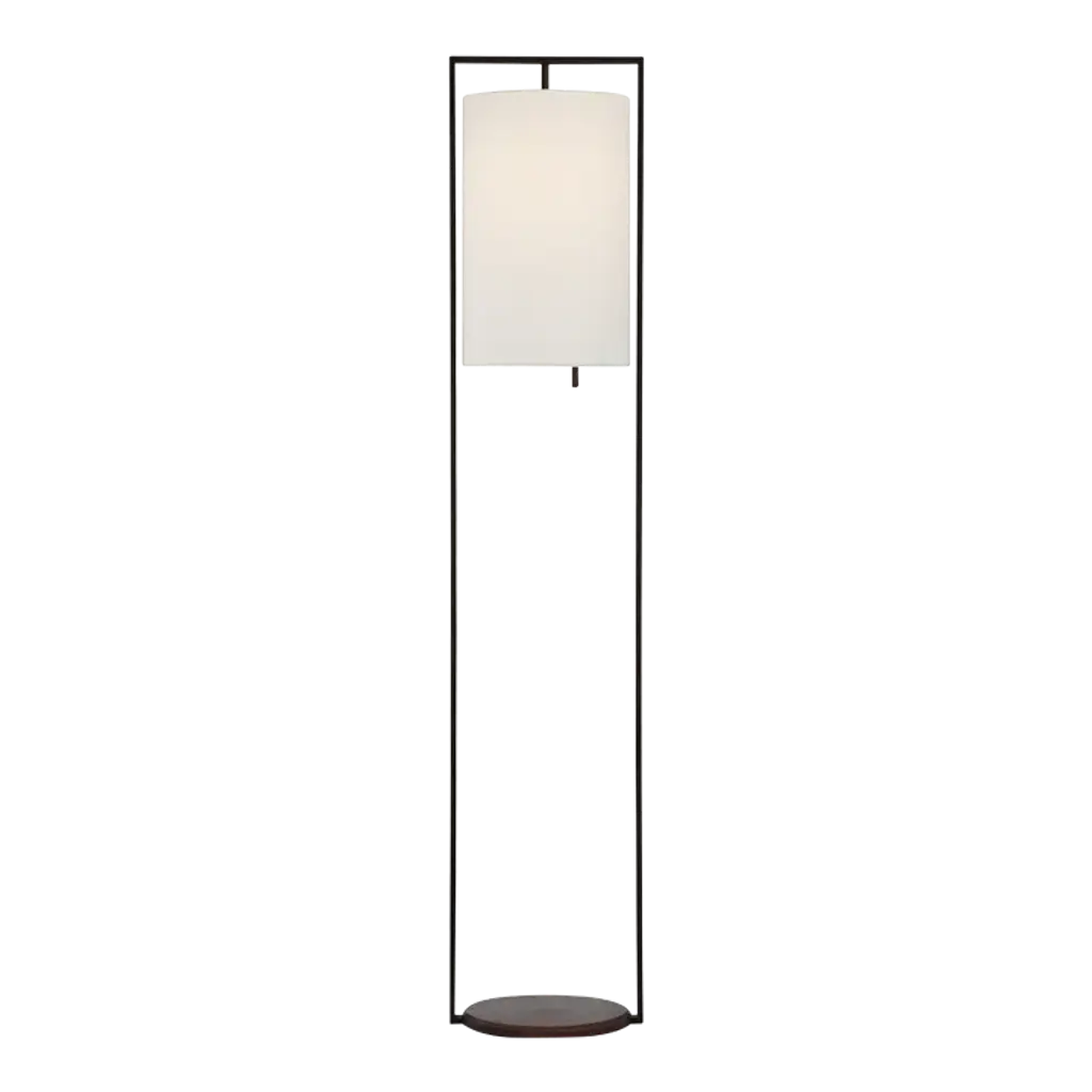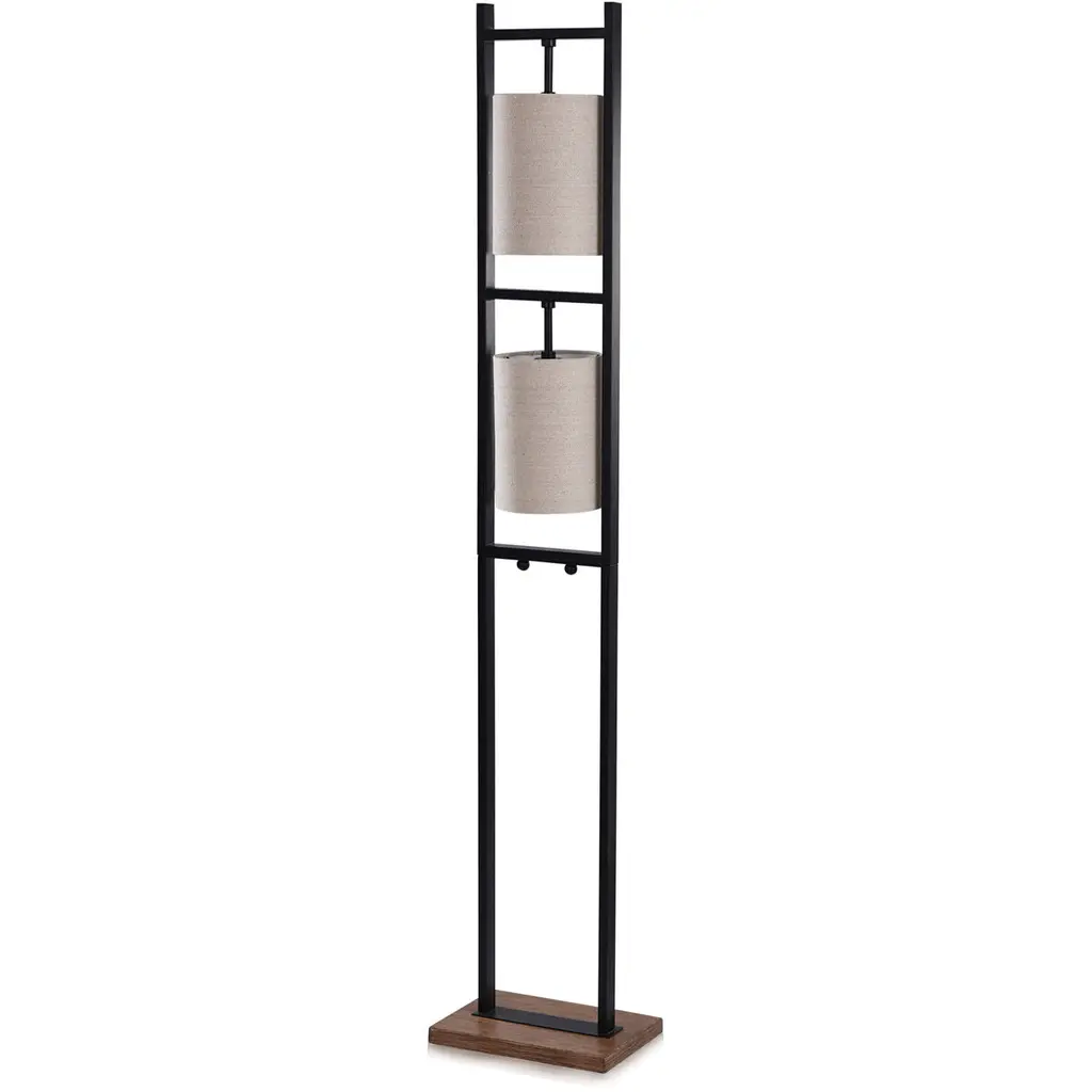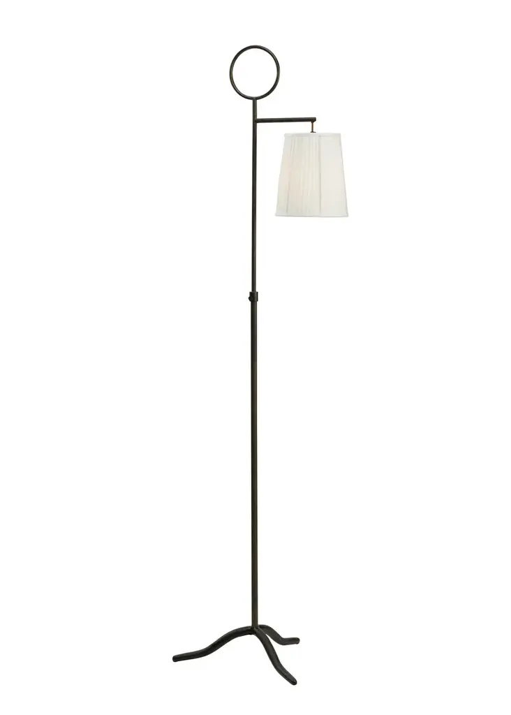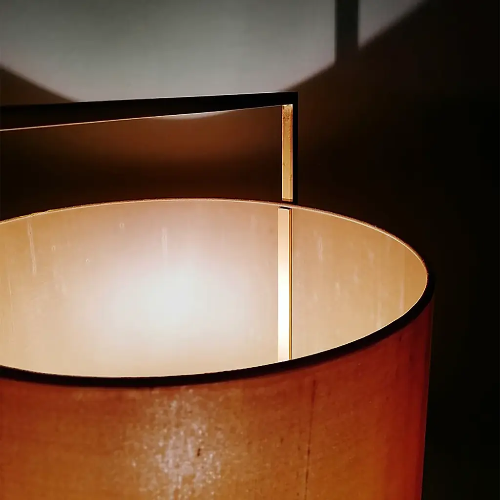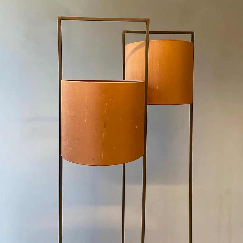 Floor lamp with a slender structure in galvanized metal with a burnished brass effect and a biscuit-colored silk fabric lampshade. The lamp's unique feature is the ability to move the lampshade vertically along the axis using magnets, offering a different look with each new position. Upon request, the lamp is also available in different sizes and the lampshade is customizable in various colors and fabrics.