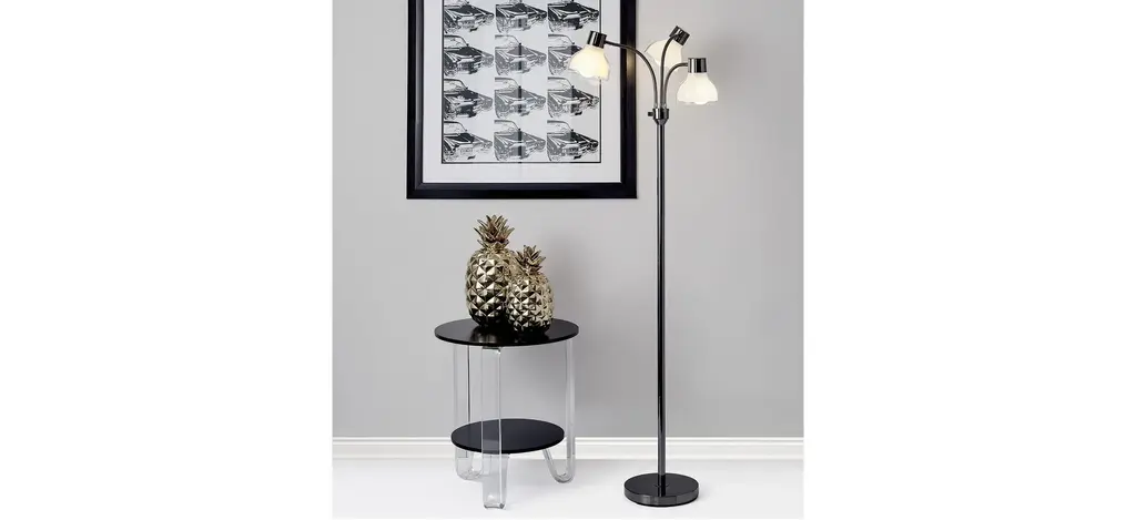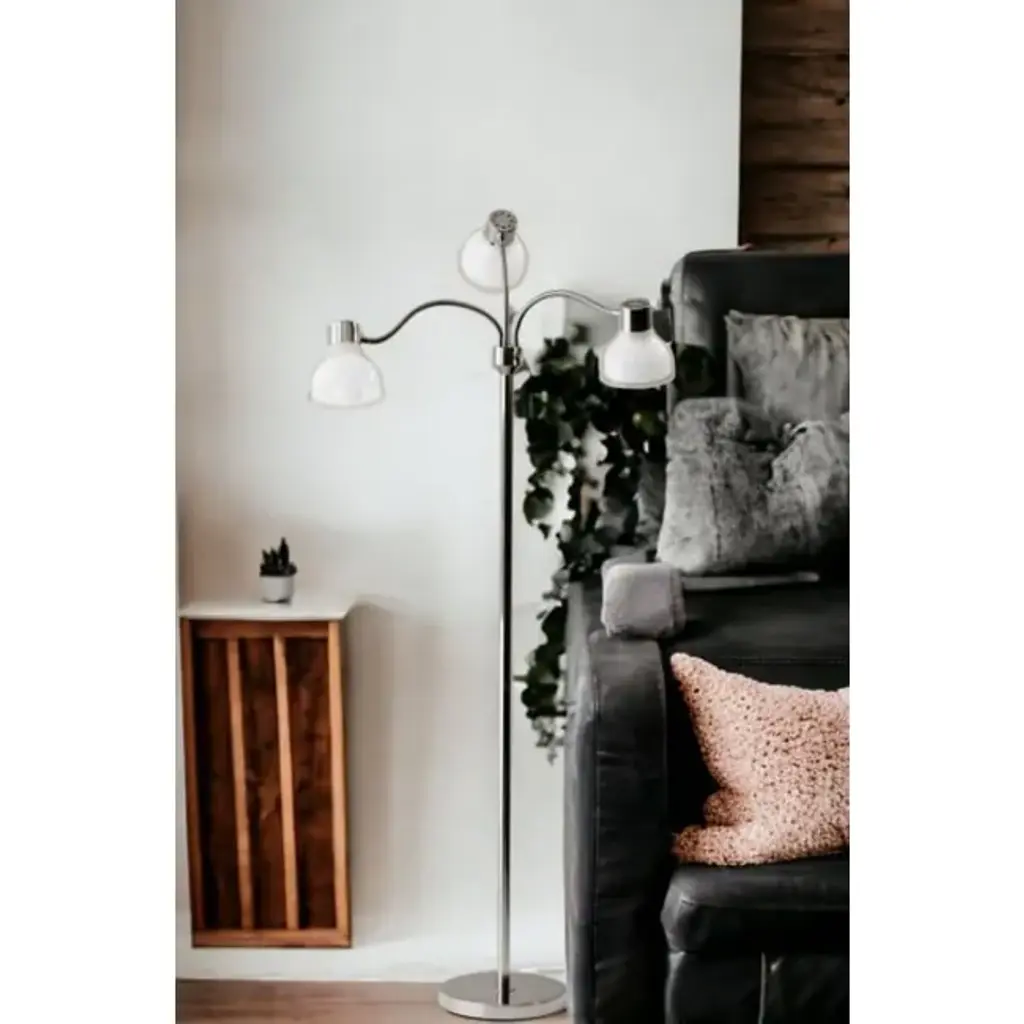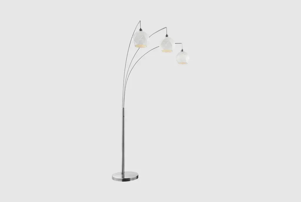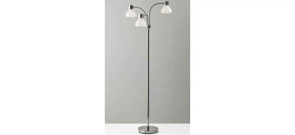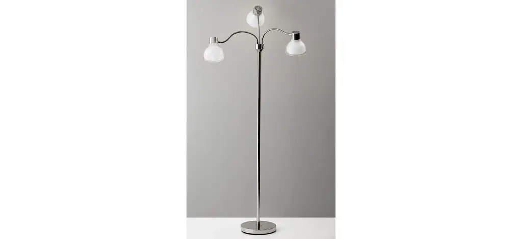 Enhance your bedroom or living room with the Presley 3-Arm Floor Lamp. A simple, yet functional style updated with a polished nickel finish and a unique shade construction. A clear plastic outer shade covers a frosted inner shade creating a beautiful glow when lit. Three adjustable gooseneck arms conveniently bring the light to wherever it is needed. This floor lamp can function as both an ambient light source for a large living space or directive task lighting for a workspace. A rotary switch on the pole adjusts the light to 3 different settings: 1 light on, 2 lights on, all lights on, and off. This lamp is smart outlet compatible and has a clear cord. Bulbs are not included.