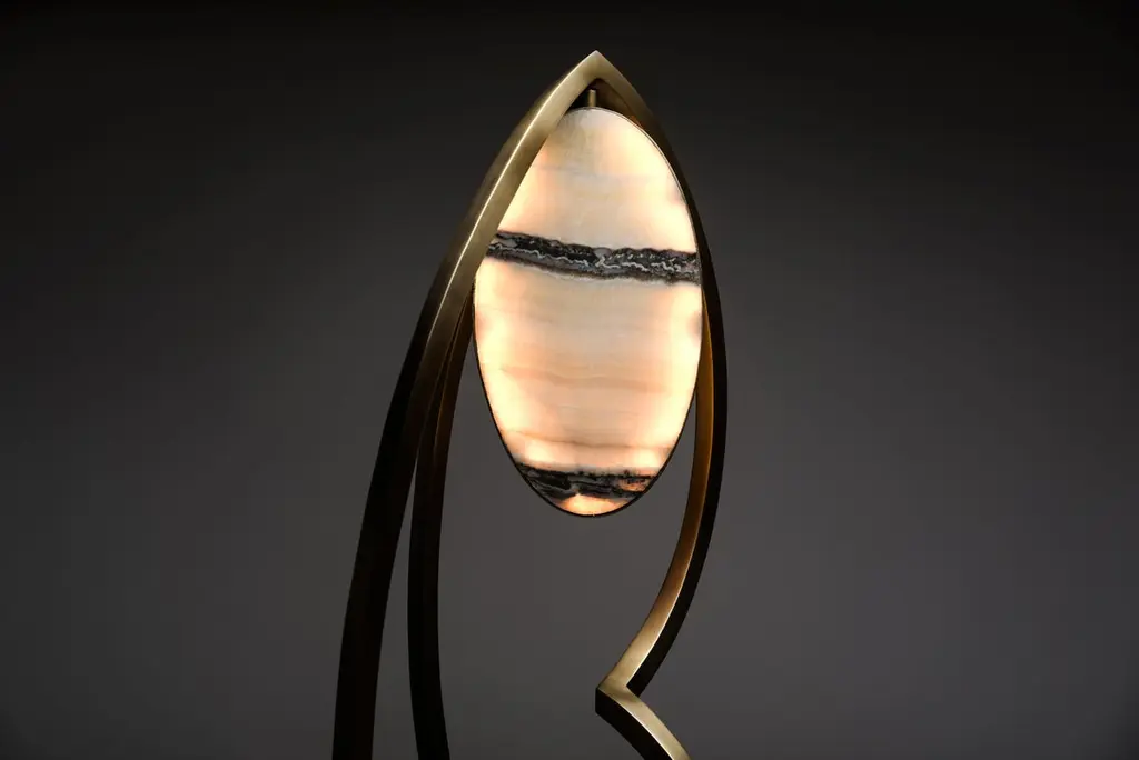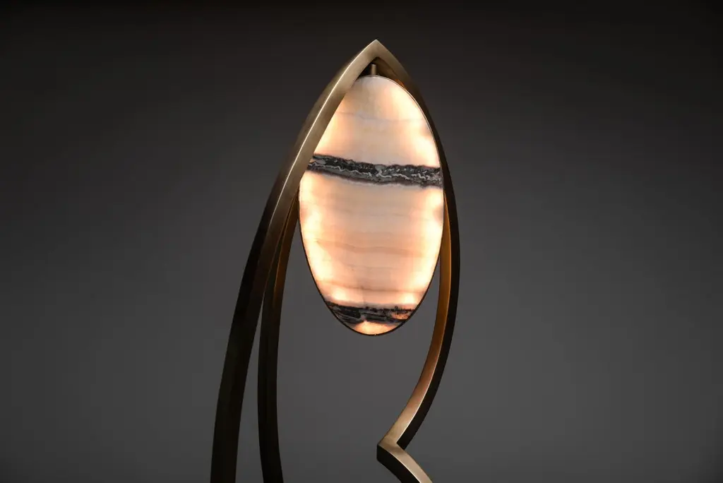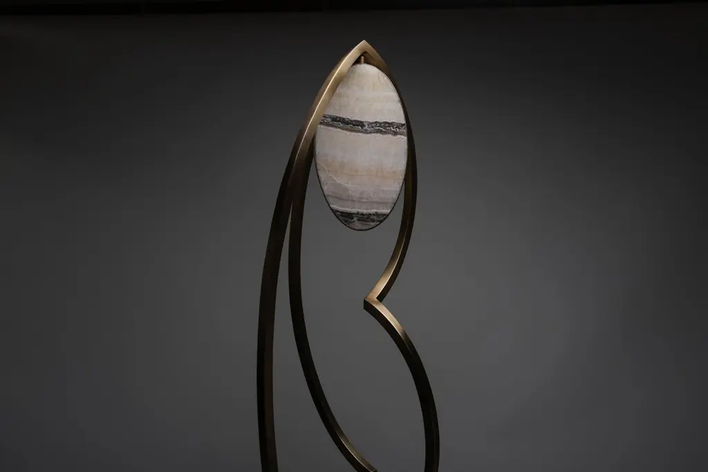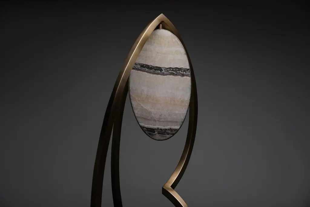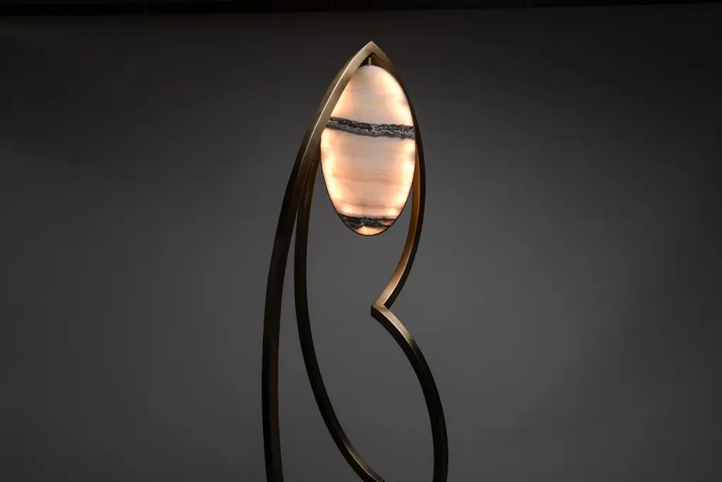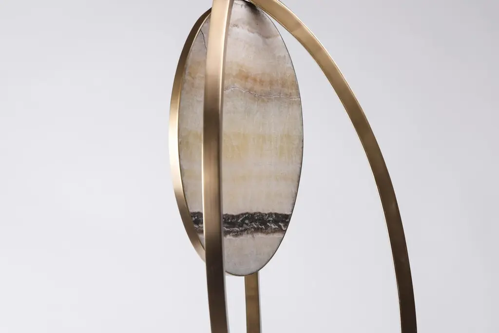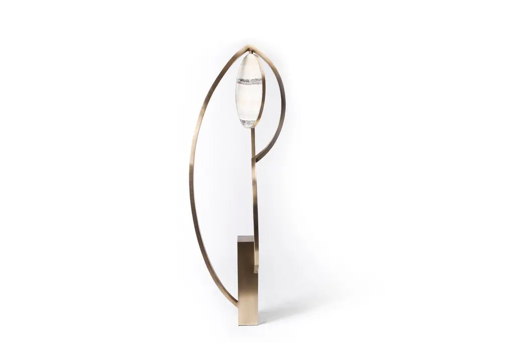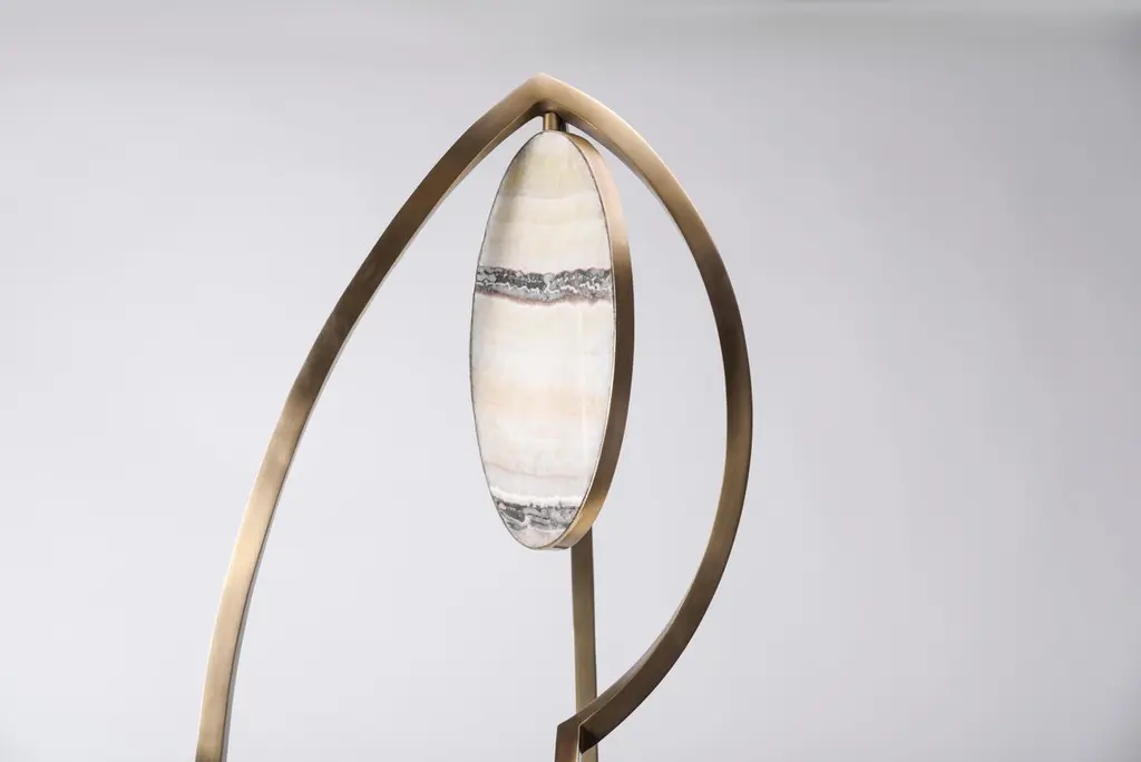 The Paris based label has distinguished themselves since their launch, with their iconic use of shagreen mixed with brass and other exotic materials. All furniture is handcrafted by skilled artisans, ultimately making each piece unique, designed in Paris and produced in the Philippines.Patrick Coard Paris launches a unique and beautifully sculptural lighting collection inspired by music as a continuation of his candle line. The prima dancer floor light in large is an ethereal and sculptural piece. Discreet LED lights are inserted in the semi-precious stone onyx pendant. The structure of the piece is in bronze-patina brass the way the light hits the metal in different angles creates beautiful shadows. Available in a medium size. Custom sizing available on request.The dimensions of this piece are 16 x 15.25 x 55.5", 41 x 39 x 141 cmAll Patrick Coard Paris pieces are handmade by artisans, ultimately making each piece unique. Wipe clean with soft dry cloth Patrick Coard Paris- an Irish/Scandinavian designer, threw the gauntlet down with an awe inspiring collection of candles never seen before. Whilst the market has been saturated with scented candles he went back to basics of non-scented candles. He used his love of this aesthetic to be the first to bring out a collection of candles in shagreen and exotic skin textures, in beautifully hand carved patterns and sculptural shapes with metal inserts. His inspirations from sculptors from the 1930s and 1940s has created a modern collection in which one can utterly relax.Color variants may occur, but this showcases the Parisian label's commitment to creating authentic luxurious products using natural components.For all pieces inlaid with stone and semi-precious stones, due to the natural quality of the material color tonality and pattern placement may differ slightly per piece.