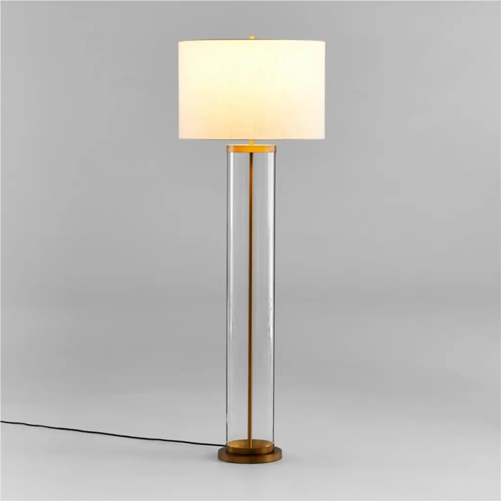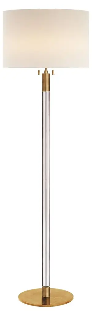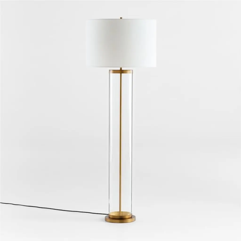 An illuminating mix of modern design and timeless craft, our grandly scaled Promenade floor lamp showcases its slender metal pole within a cylinder of hand-blown glass. Slim circles of iron finished in black, brass or nickel cap the tall bases, and white linen drum shades add textural counterpoint. Striking on its own or paired with the coordinating table lamps, our Promenade floor lamp is a Crate & Barrel exclusive.