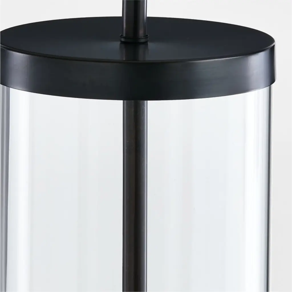 An illuminating mix of modern design and timeless craft, our grandly scaled Promenade floor lamp showcases its slender metal pole within a cylinder of hand-blown glass. Slim circles of iron finished in black cap the tall bases, and white linen drum shades add textural counterpoint. Striking on its own or paired with the coordinating table lamps, our Promenade floor lamp is a Crate & Barrel exclusive.