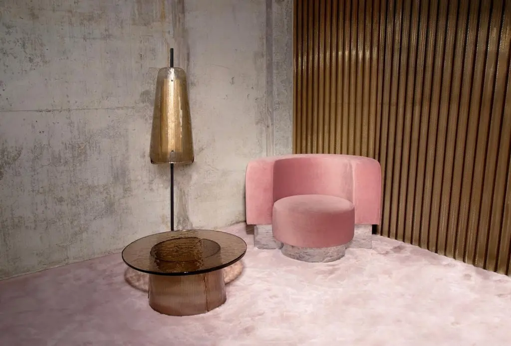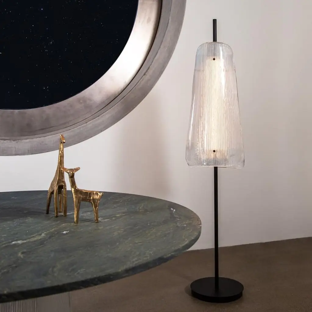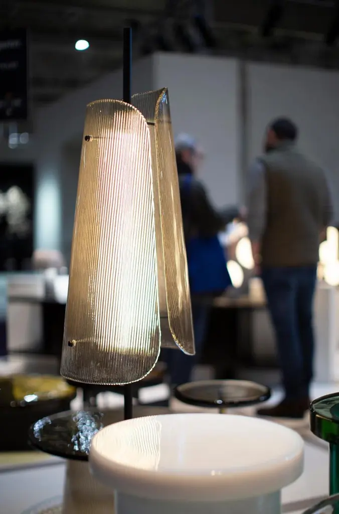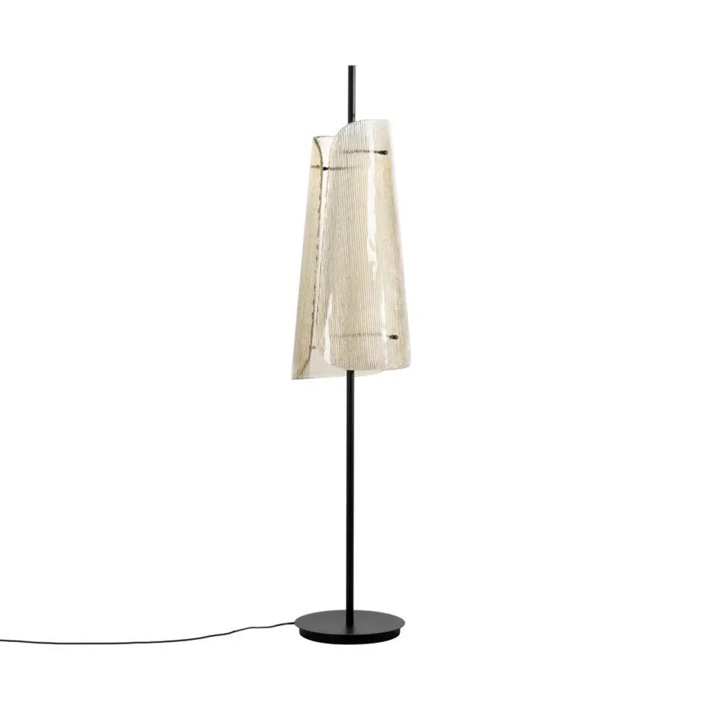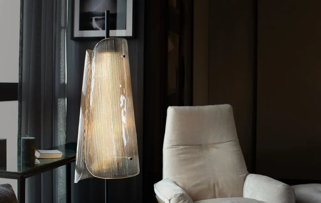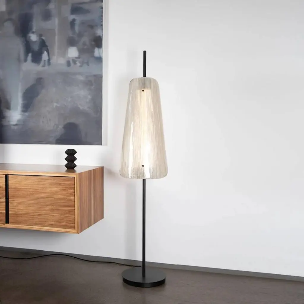 Resembling a lampshade but with a room-filling presence, bent is characterised by its curved section of glass (single or double). The regular grooved, but random glass surface was created by casting fluid glass mass into a special mould. So every single hand-made piece has its own character.Material: handmade glass + steel Additional informationDimensions340 × 340 × 1640 mmColour Glass Shadesmoky grey, transparentdimmable LED band, 32 W, 220–240 V, 50/60 Hz, 20 000 h, 2700 K warm white,1600 lm