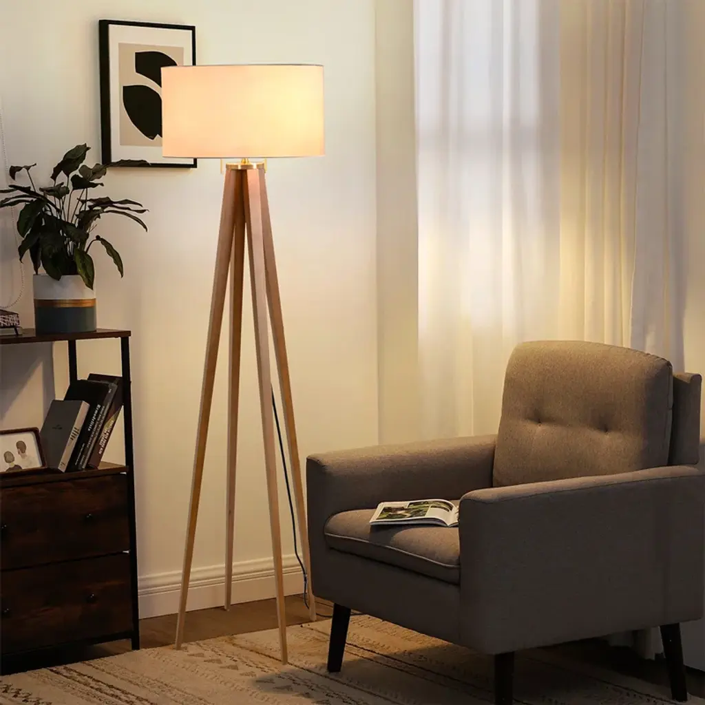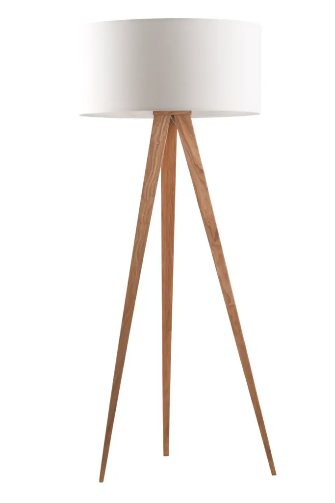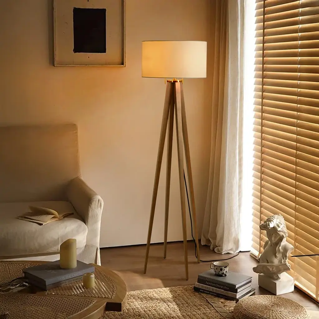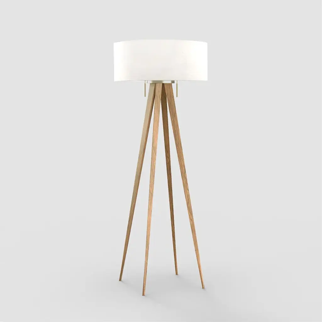 Quattro Floor Lamp - Natural Ash Wood Finish & Weathered Brass, White Linen Shade, Dimmer