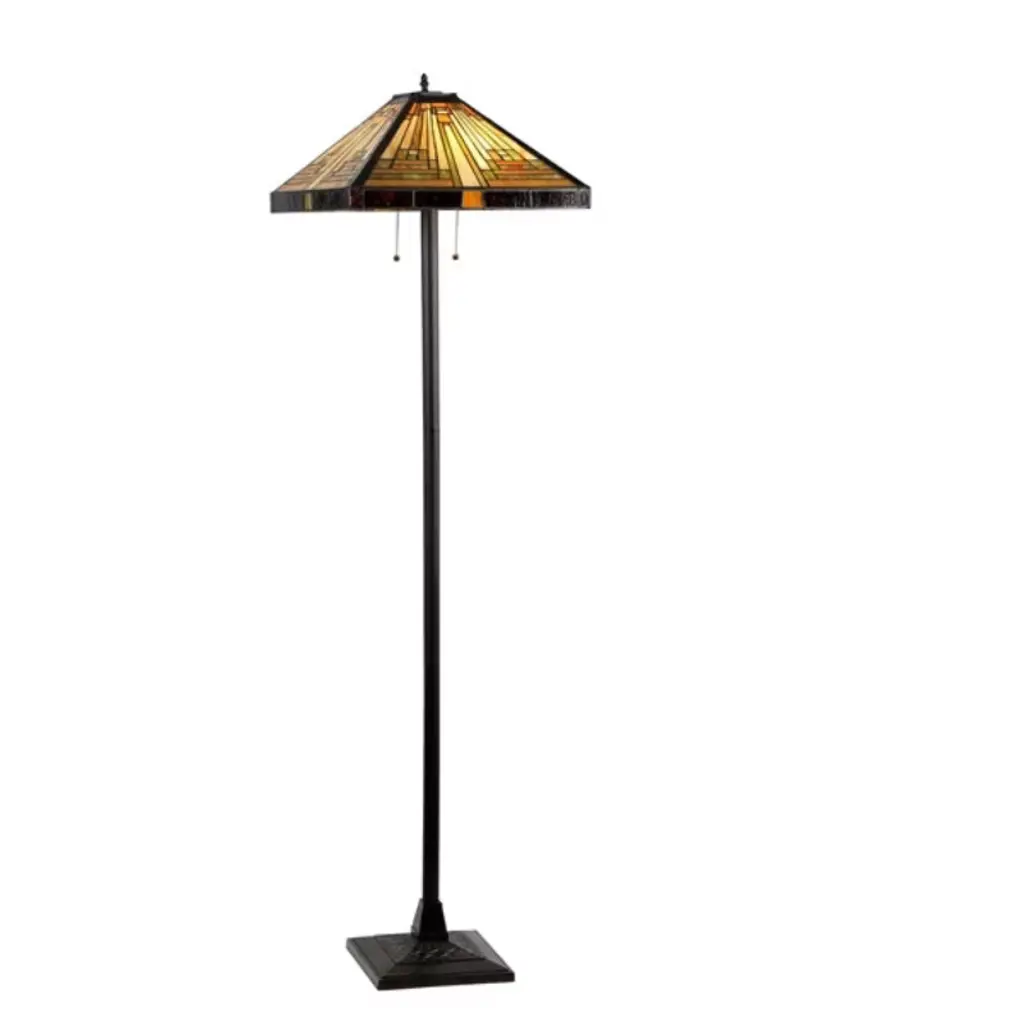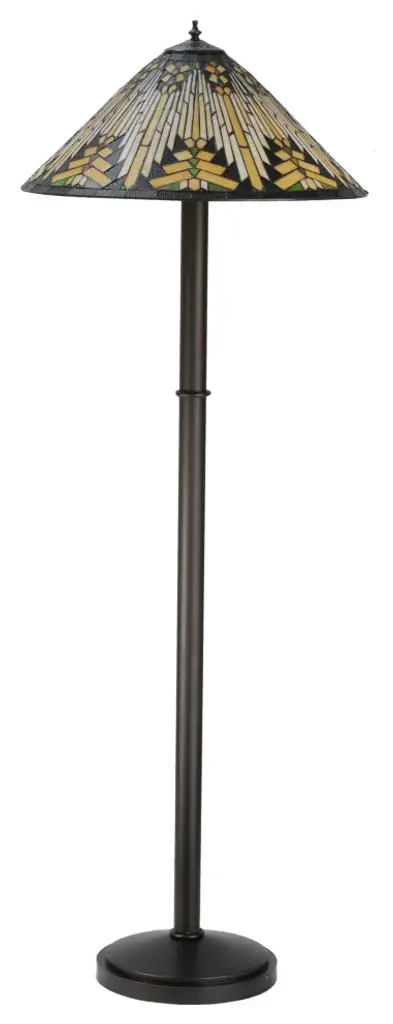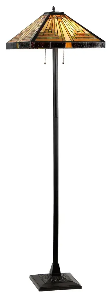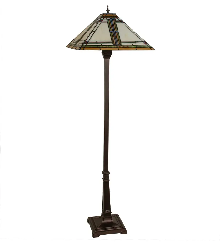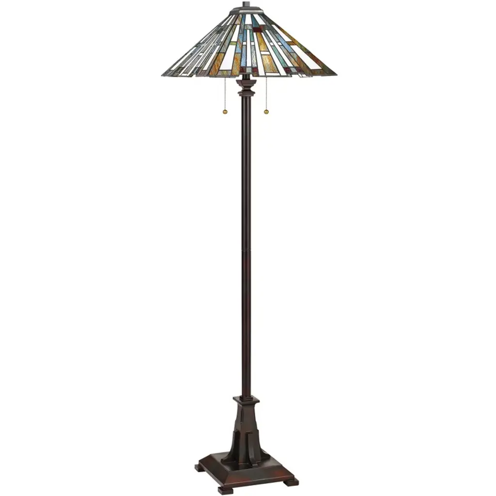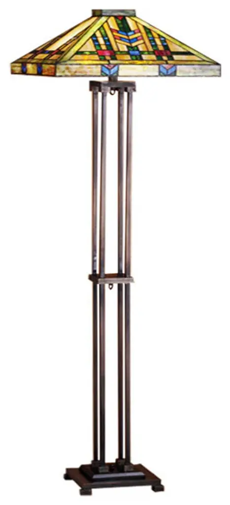 Two Light Floor Lamp from Inglenook collection in Valiant Bronze finish. Number of Bulbs 2. Max Wattage 100.00 . No bulbs included. This Arts and Crafts style features a pyramid shade with a stepped border for added visual interest. The classic geometric design includes art glass in shades of amber cream and tan accented with glass pieces in sapphire blue and rich green. The linear geometric details on the base makes it a perfect complement to the shade. No UL Availability at this time.