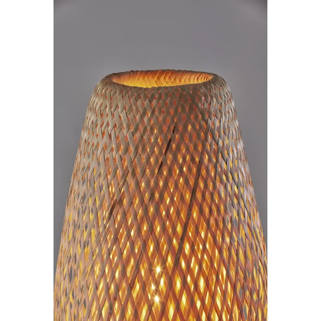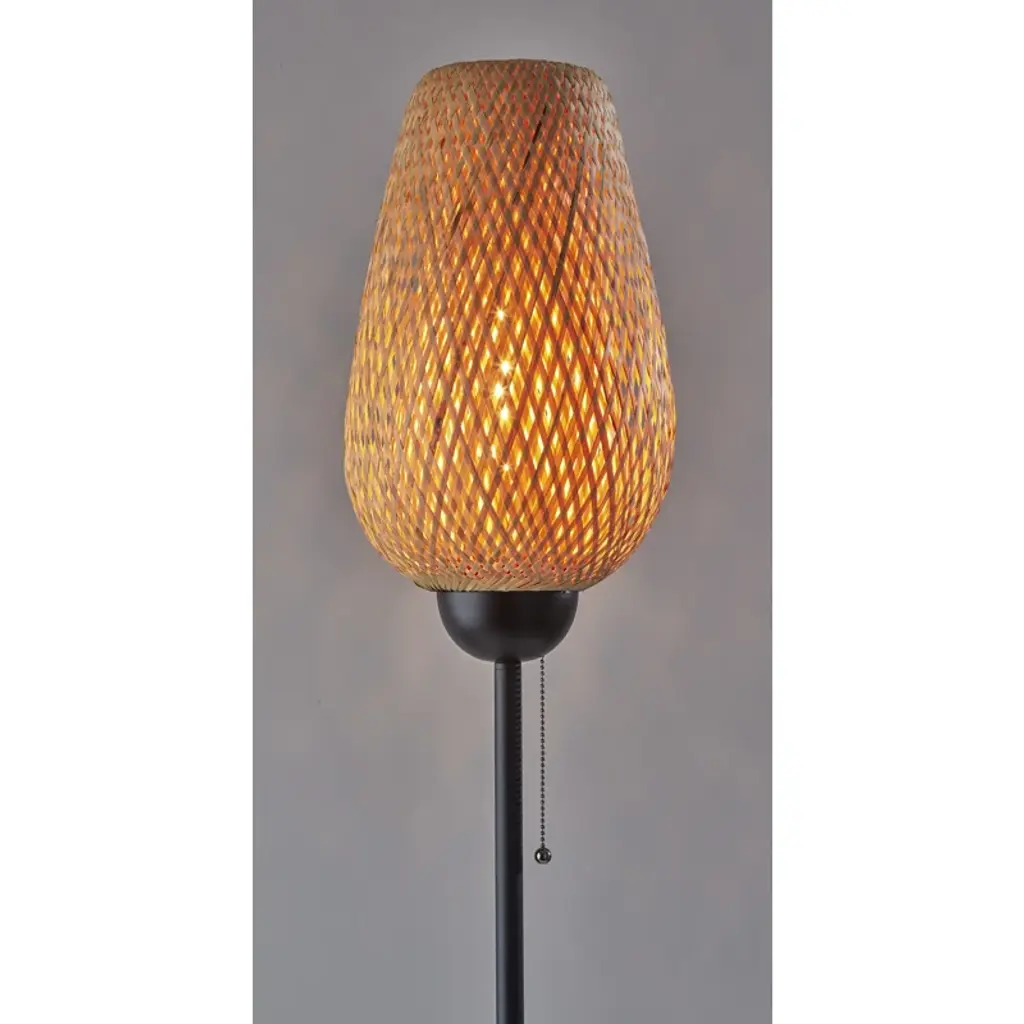Bring beach-bungalow ambiance and a warm glow to your home with the floor lamp. It features a round metal base in a black finish supporting the matching tall and narrow tube-shaped stem. With an open-weave natural bamboo tulip-shaped shade distilling the light of a 60W bulb, this lamp creates a relaxed and natural focal point for any room. Operated by a pull chain located on the base of the shade to easily turn it on or off.
