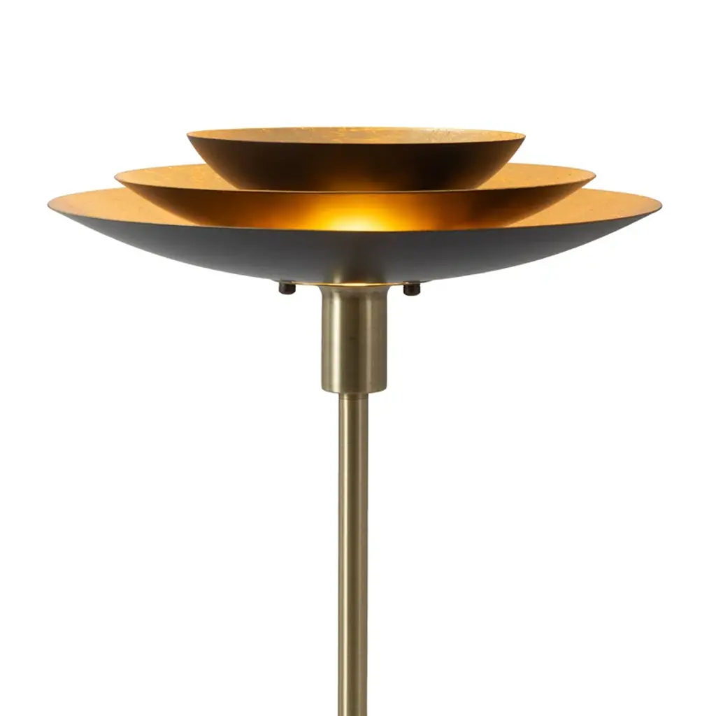 The Rancho Mirage Torchiere Floor Lamp, a beacon of elegance and sophistication that adds a touch of vintage-inspired charm to your home. Crafted with meticulous attention to detail, this lamp features a weathered brass finish and a matte black tiered shade, creating a mesmerizing interplay of light and shadow. The hand-applied gold-leaf finish beneath the shade casts a warm and inviting glow, transforming any room into a haven of ambiance and style.