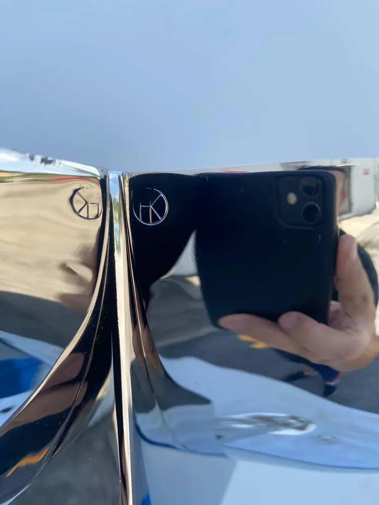 Extremely RARE, this large machine era/ Art Deco floor lamp is MARKED "HK" and we have not found the name attributed to this marking. It has been professionally restored with an amazing reflective finish and new plug and dimmer (for US). We have TWO of these beauties available in slightly differing heights but with same overall scale - they work perfectly together as desired. SOLD and priced individually. This is the taller floor lamp at 71 inches tall and 18x18 at the top. The shorter floor lamp (shown in a detail image) is 67.25 inches tall and 18x18 at top. These are VERY heavy and amazingly crafted lamps.