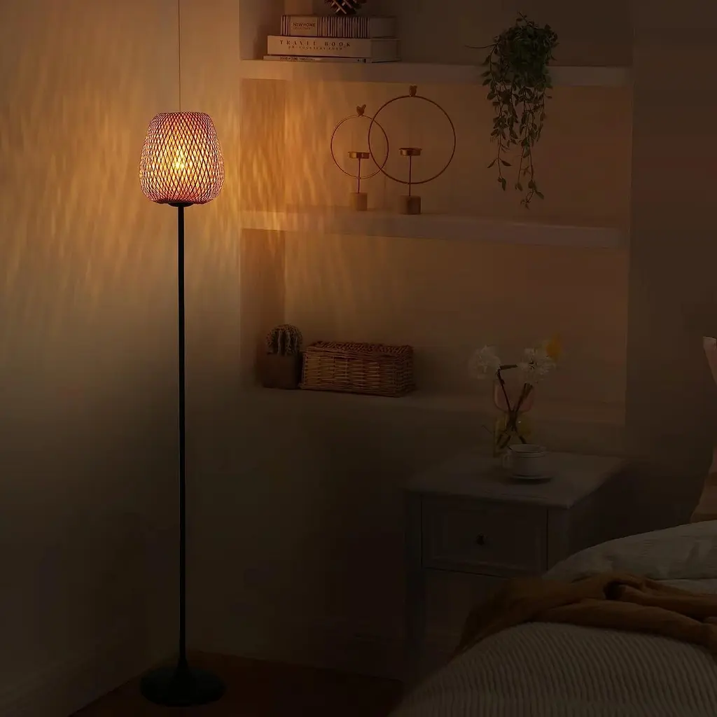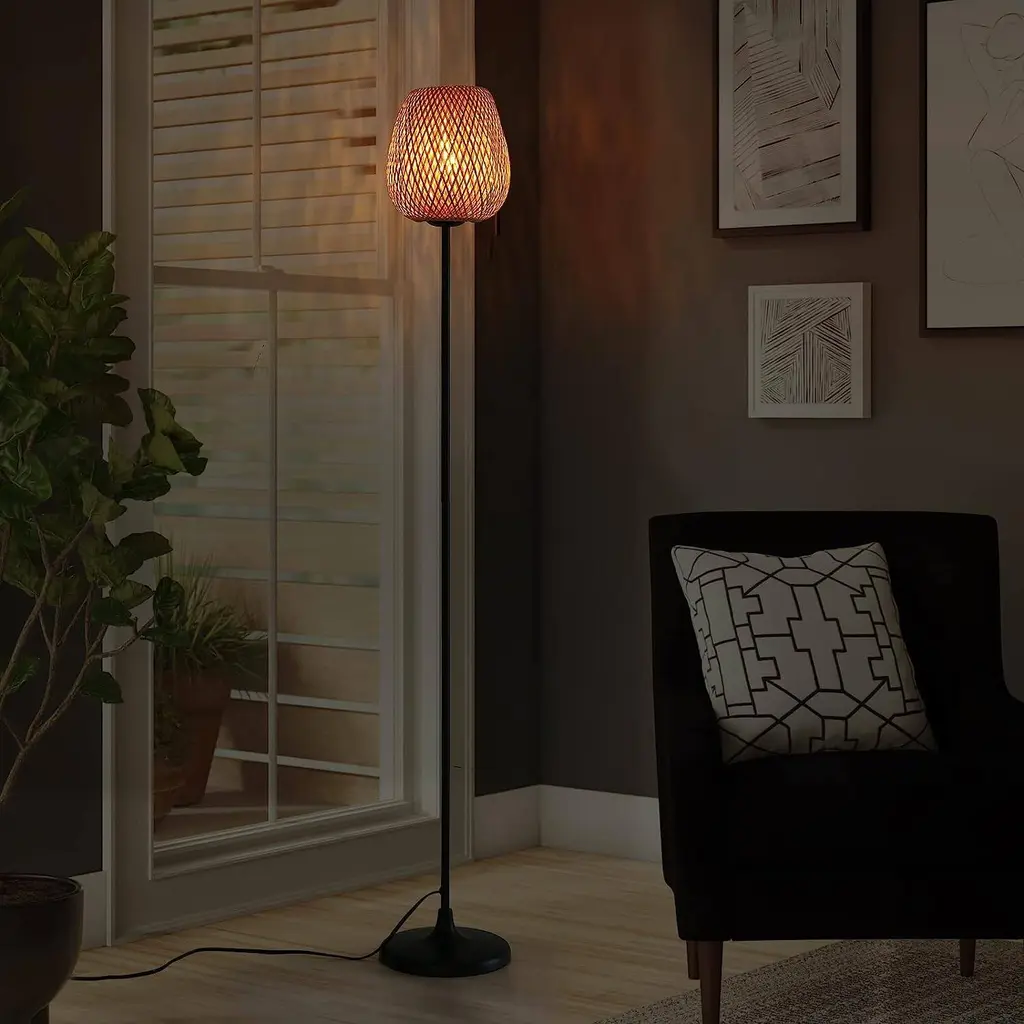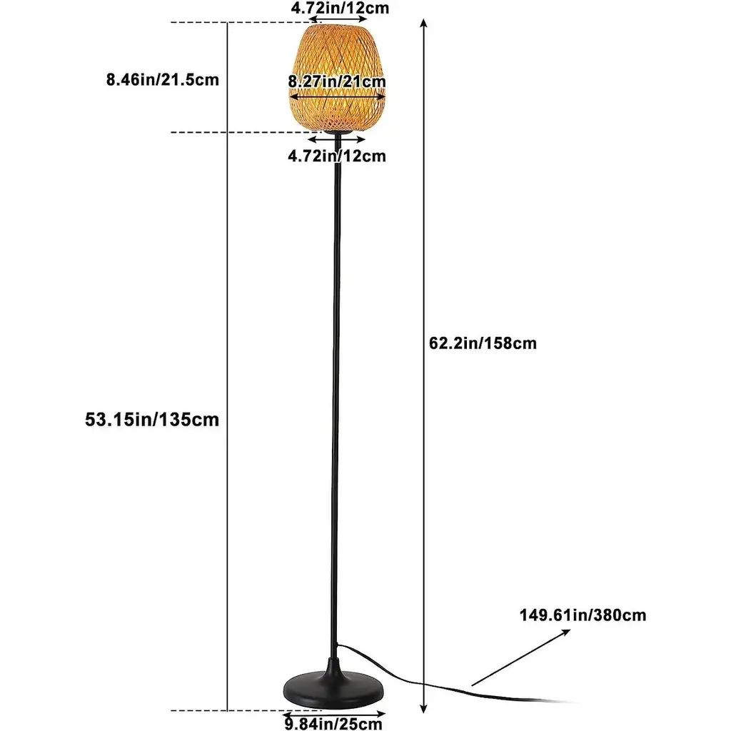 The handmade rattan floor lamp plug in cord embodies the modern bohemian style. It is hand-woven with high-quality bamboo and rattan which has high temperature resistance and anti-aging.It is perfect as a decorative lighting element in restaurants, bars, hotels, cafes,bedroom,living room, bedside, reading desk and many other applications.【Double Bamboo Rattan Lampshade】This bamboo floor lamp is a special style tall lamp, we combine the double-deck rattan lampshade with the floor lamp. The hand-finished lamp will add a rustic touch. Not only a rustic floor lamp but also an ornament for living. Japanese-style elements made up of high-quality solid white metal and natural bamboo. You can see beautiful lights and shadows in your house.【Homemade Floor Lamp Specifications】The over height of the rattan floor lamp is 62.2 inch. We uses black standing base to get a fashionable style with a large rattan lampshade. The tall reading lamp is equipped with a foot pedal switch in 146.6 in extra long cord, very convenient to switch the light on/off by your foot.Bulb not included.【E26 Bulb Requirements】 Bulb is not included in the package. With an E26 sized screw base, the bulb can be installed as desired. To get a better lighting effect, we suggest you using LED bulb 10W-12W, energy saving bulb 12W-20W, incandescent bulb 40W-60W (60W MAX), Voltage: 110V-120V.【Hidden Line Design on Pole】 This floor lamp we have made the design of passing the power cord through the column, which can better hide the line and make the floor lamp look more concise. And don't worry about the cord tripping over children or pets.