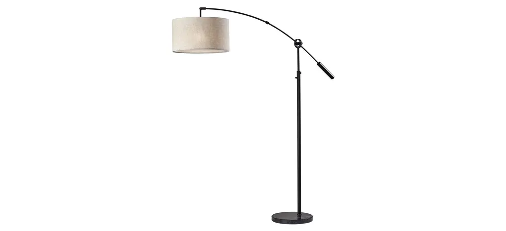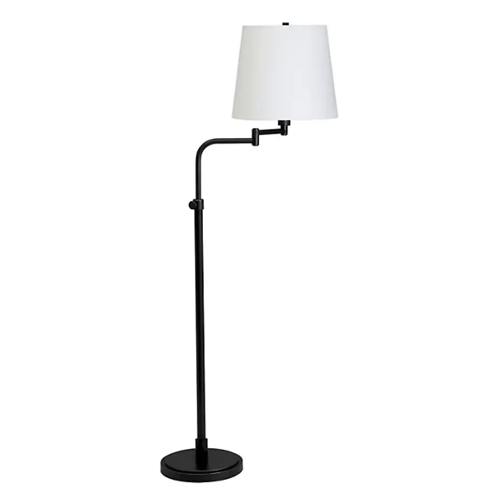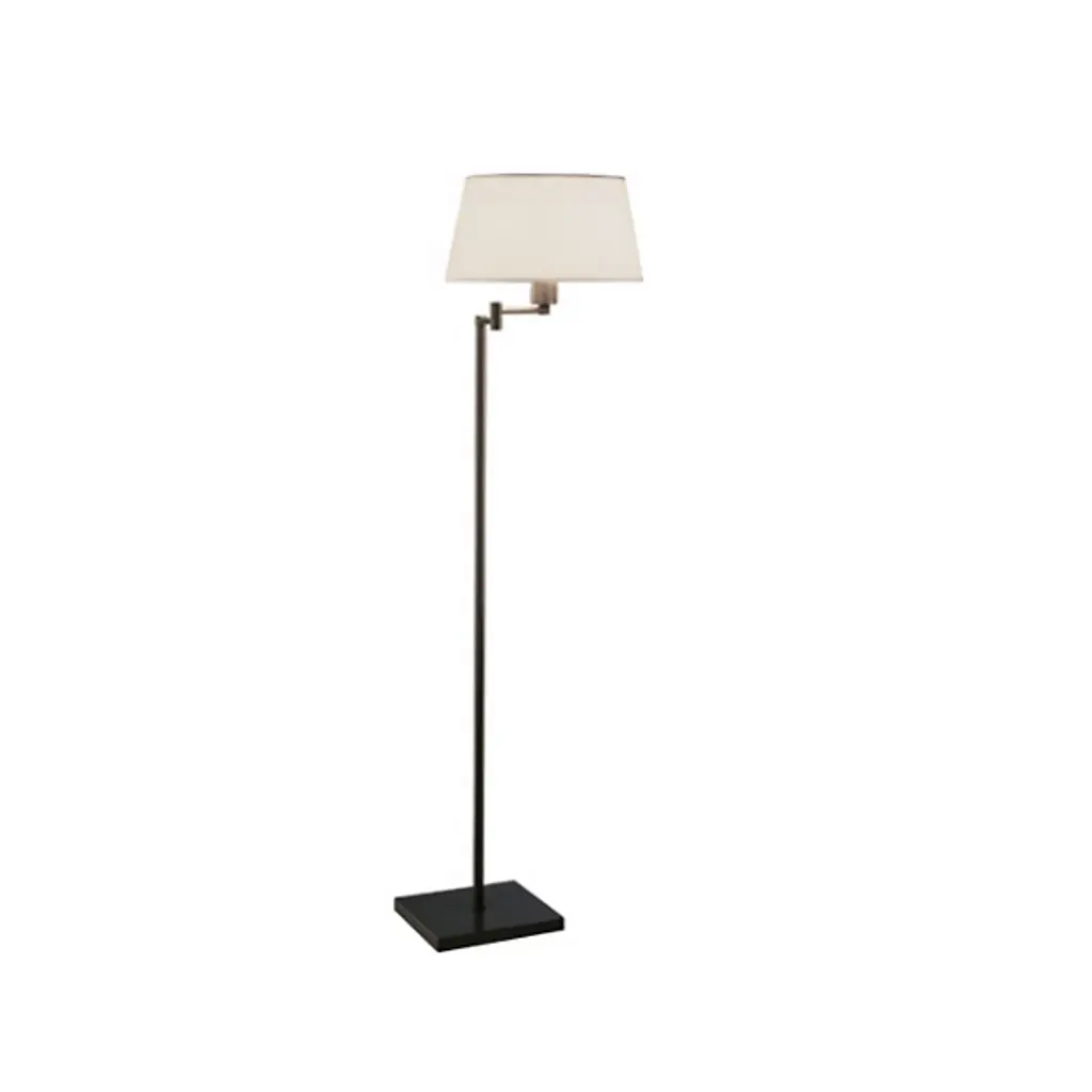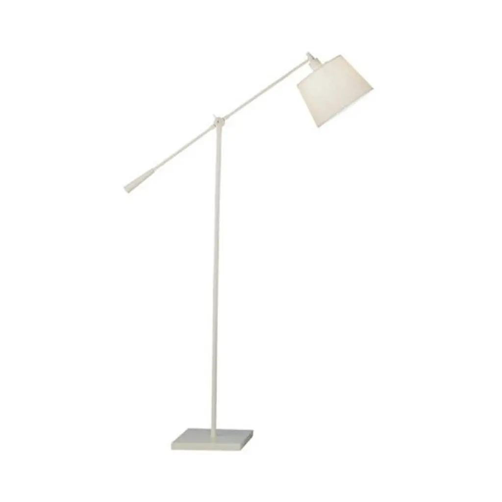 Beauty in simplicity. The Real Simple Boom Floor Lamp by Robert Abbey infuses a clean, modern presence in your living space or bedrooms. Its barrel-shaped lampshade is made of fabric for a classic look. It is attached to an angled arm that is balanced on a horizontal stem with a square base. The joint that connects the stem and arm lets you manipulate the height and angle of the shade. Add a halogen lamp to bring direct and ambient light in any space.