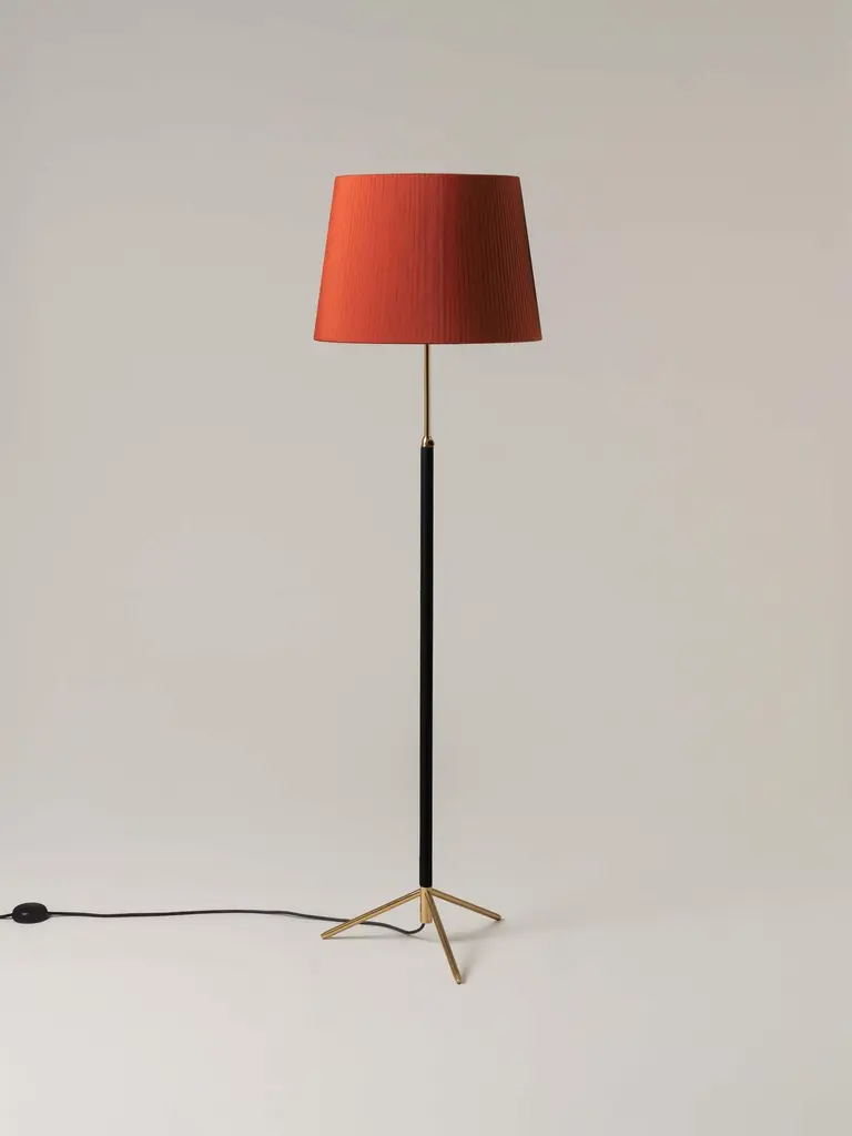 Red and brass pie de Salón G1 floor lamp by Jaume Sans.Dimensions: D 45 x H 120-160 cm.Materials: Metal, leather, ribbon.Available in chrome-plated or polished brass structure.Available in other shade colors and sizes.This slender synthesis of traditional lamps is a sparkle of timeless elegance created in a context of the avant-garde. The combination of materials with its symmetrical, leather-wrapped centre shaft, its choice of three shade materials and eight colour options make it a paradigm of industrial craftsmanship.Height adjustable lampshade.Dimmer included.Santa & Cole is a small, independent and global editor of design products, with its roots in Belloch (Barcelona, Spain). We have been editing since 1985, when the company was first founded. By editing we mean preparing a work for the public domain, we mean adapting an item for everyone’s use. What a book editor does with stories, we do with objects.More than eighty creators have contributed to a rich catalogue of furniture and lighting products originating in very different contexts, by renowned designers such as Antoni Arola, Miguel Milá, André Ricard and llmari Tapiovaara.Acute and attentive to quality and detail, Santa & Cole outsources all of its industrial production to an extensive network of suppliers, mainly in Spain, but also in other countries such as Japan, where the washi paper for our Tekiò lamp is made.Our mission is to build, safeguard and disseminate knowledge through design objects. Objects whose quality is recognisable at the touch of a hand, and that enrich people’s lives, whether at home or in shared environments. Our philosophy is more modern than futurist and we are more intrigued by silence than by stridency.Our focus is not the present market, but the future one; not Barcelona, but the world; not fashion, but history.All our lamps can be wired according to each country. If sold to the USA it will be wired for the USA for instance.