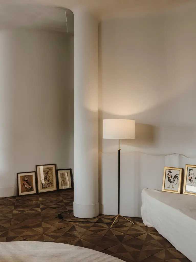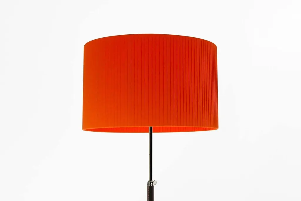 Red and chrome Pie de Salón G2 floor lamp by Jaume SansDimensions: D 45 x H 120-160 cmMaterials: Metal, leather, ribbon.Available in chrome-plated or polished brass structure.Available in other shade colors and sizes.This slender synthesis of traditional lamps is a sparkle of timeless elegance created in a context of the avant-garde. The combination of materials with its symmetrical, leather-wrapped centre shaft, its choice of three shade materials and eight colour options make it a paradigm of industrial craftsmanship.Height adjustable lampshade.Dimmer included.Santa & Cole is a small, independent and global editor of design products, with its roots in Belloch (Barcelona, Spain). We have been editing since 1985, when the company was first founded. By editing we mean preparing a work for the public domain, we mean adapting an item for everyone’s use. What a book editor does with stories, we do with objects.More than eighty creators have contributed to a rich catalogue of furniture and lighting products originating in very different contexts, by renowned designers such as Antoni Arola, Miguel Milá, André Ricard and llmari Tapiovaara.Acute and attentive to quality and detail, Santa & Cole outsources all of its industrial production to an extensive network of suppliers, mainly in Spain, but also in other countries such as Japan, where the washi paper for our Tekiò lamp is made.Our mission is to build, safeguard and disseminate knowledge through design objects. Objects whose quality is recognisable at the touch of a hand, and that enrich people’s lives, whether at home or in shared environments. Our philosophy is more modern than futurist and we are more intrigued by silence than by stridency.Our focus is not the present market, but the future one; not Barcelona, but the world; not fashion, but history.All our lamps can be wired according to each country. If sold to the USA it will be wired for the USA for instance.