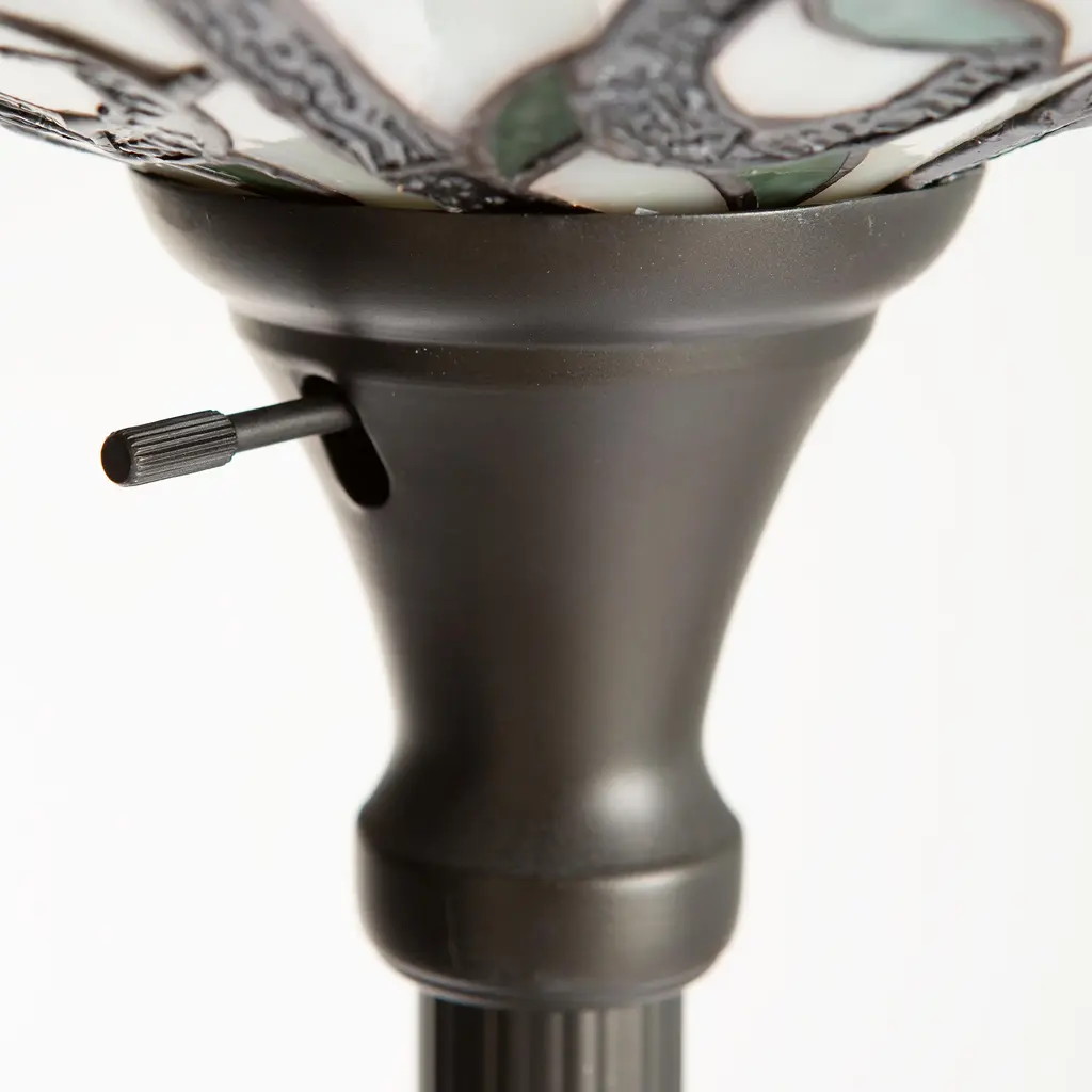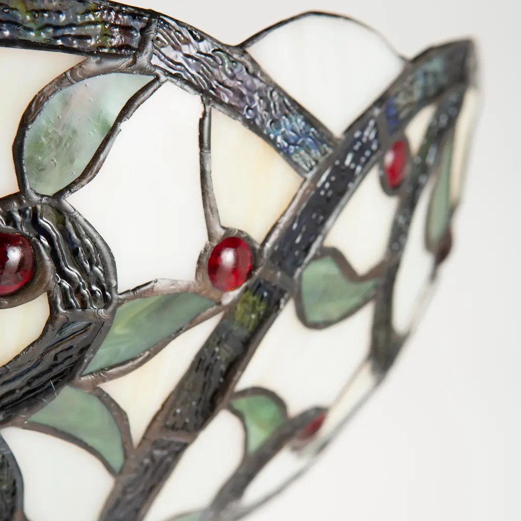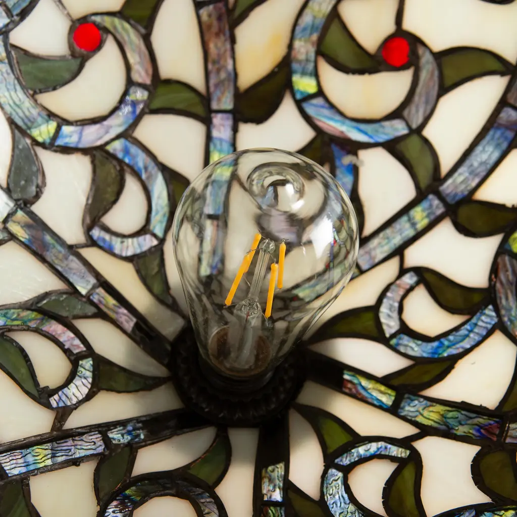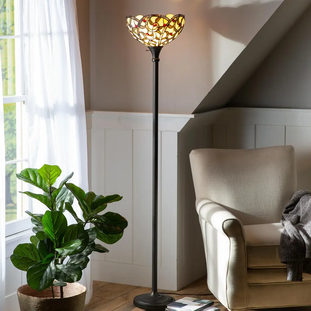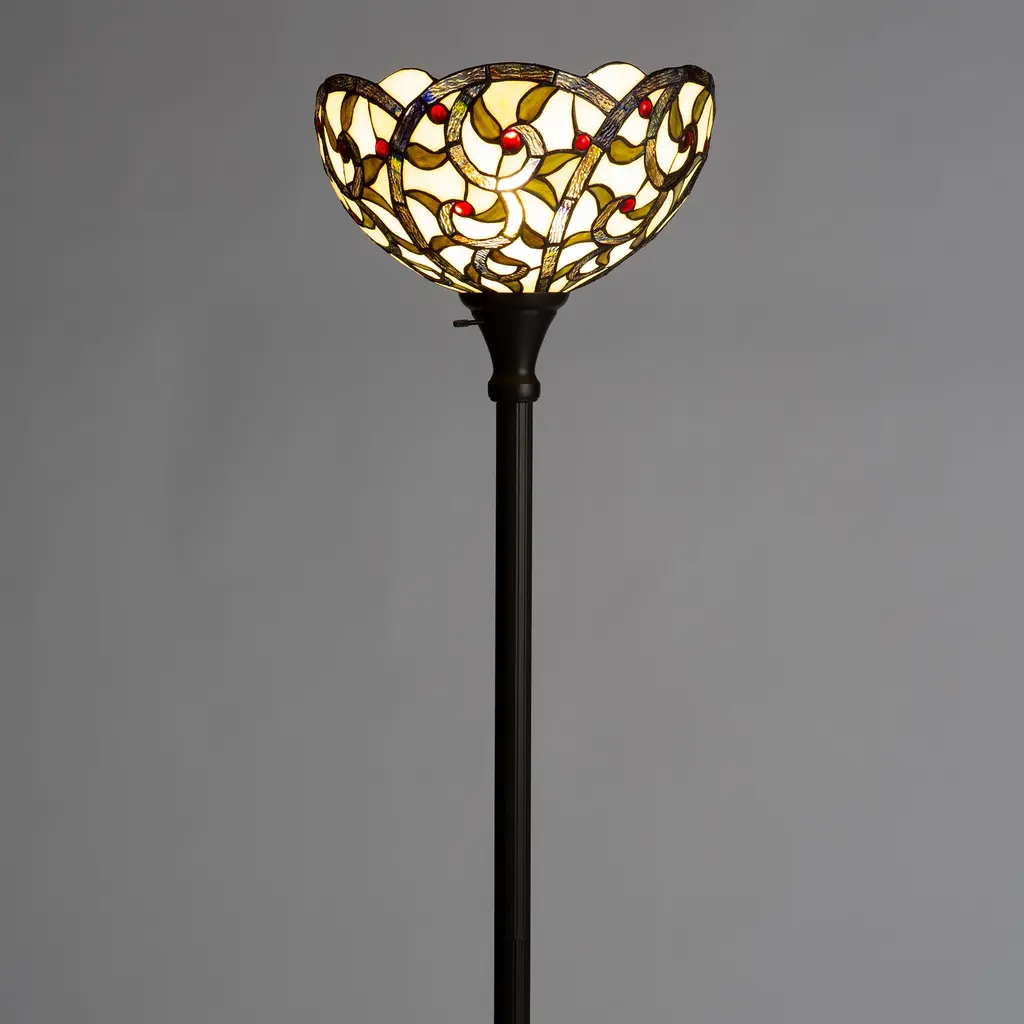 This stunning Red Jewels Stained Glass Floor Lamp features 288 unique glass pieces and 24 jewels. The translucent glass allows the lamp to emit a soft golden-amber glow. This lamp is a functional treasure to enjoy for years. Not only does it provide light to your home--it does so with a flourish. The stand-out red jewels add to the lamp's elegant flair. Display this lamp as a statement piece in a living room, dining room or any space in your home where you want light to be beautiful as well as functional. Use with 100-Watt max lightbulb.