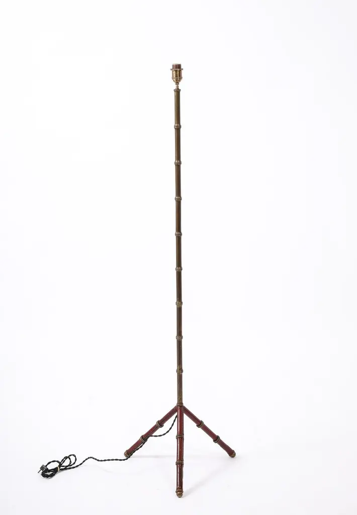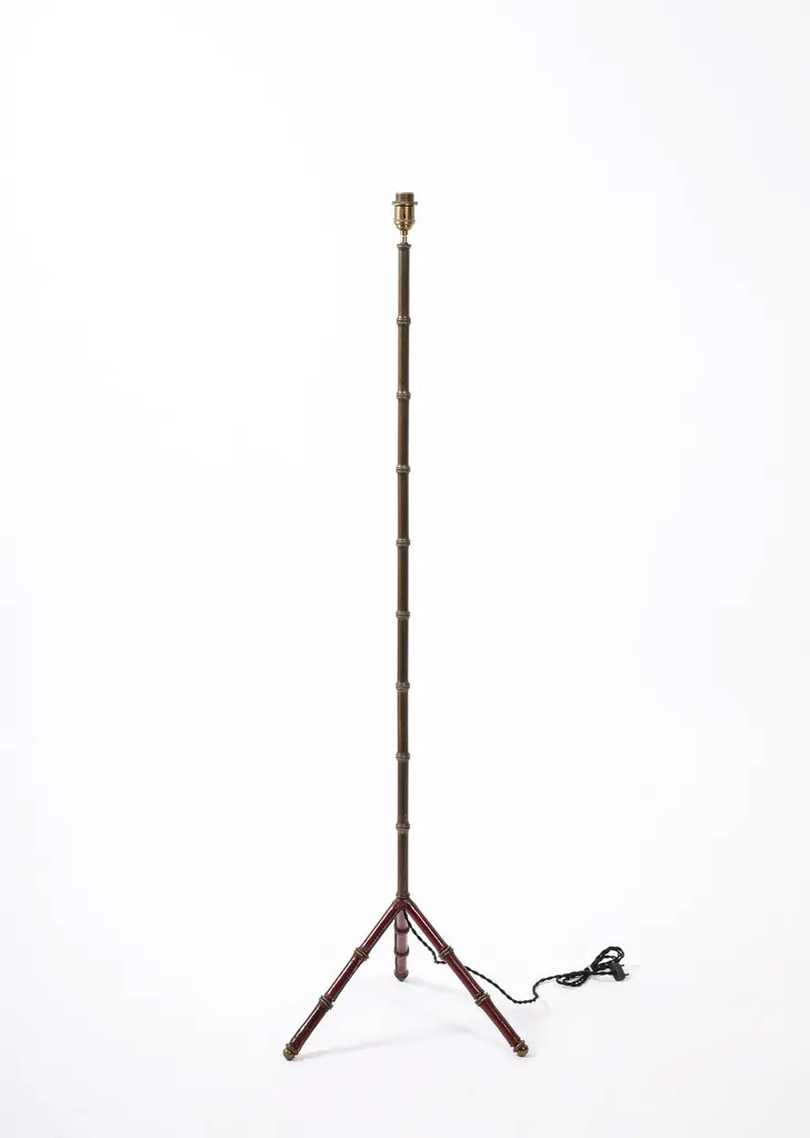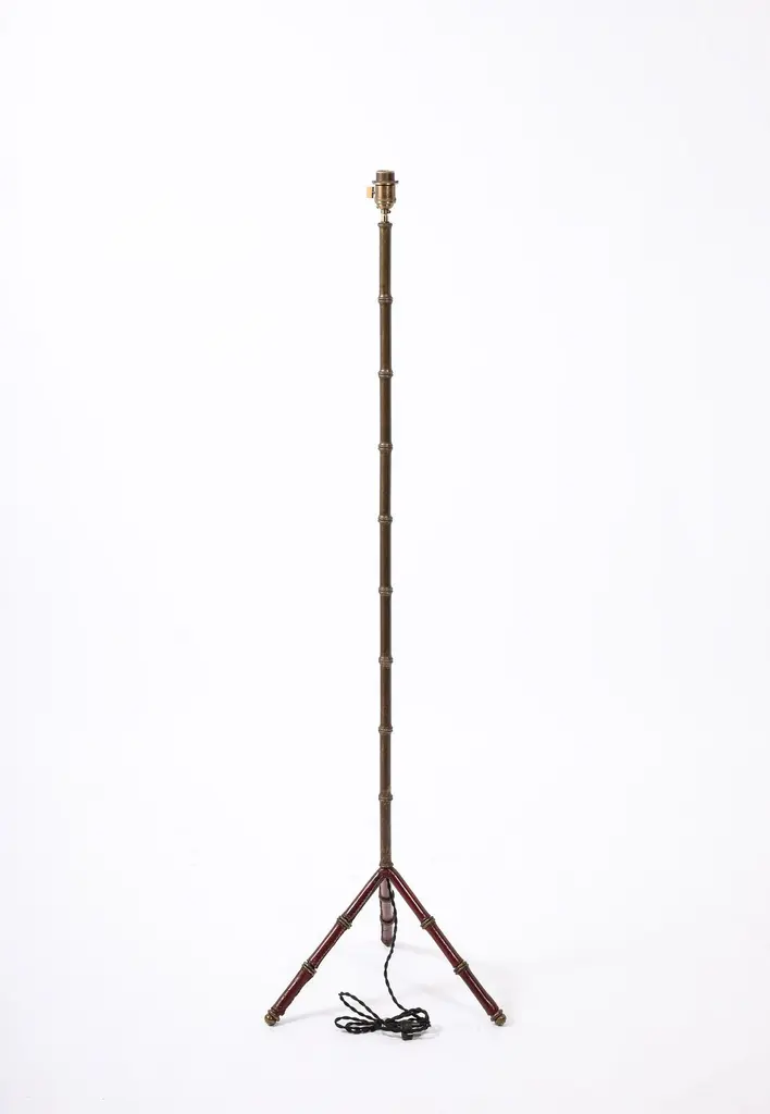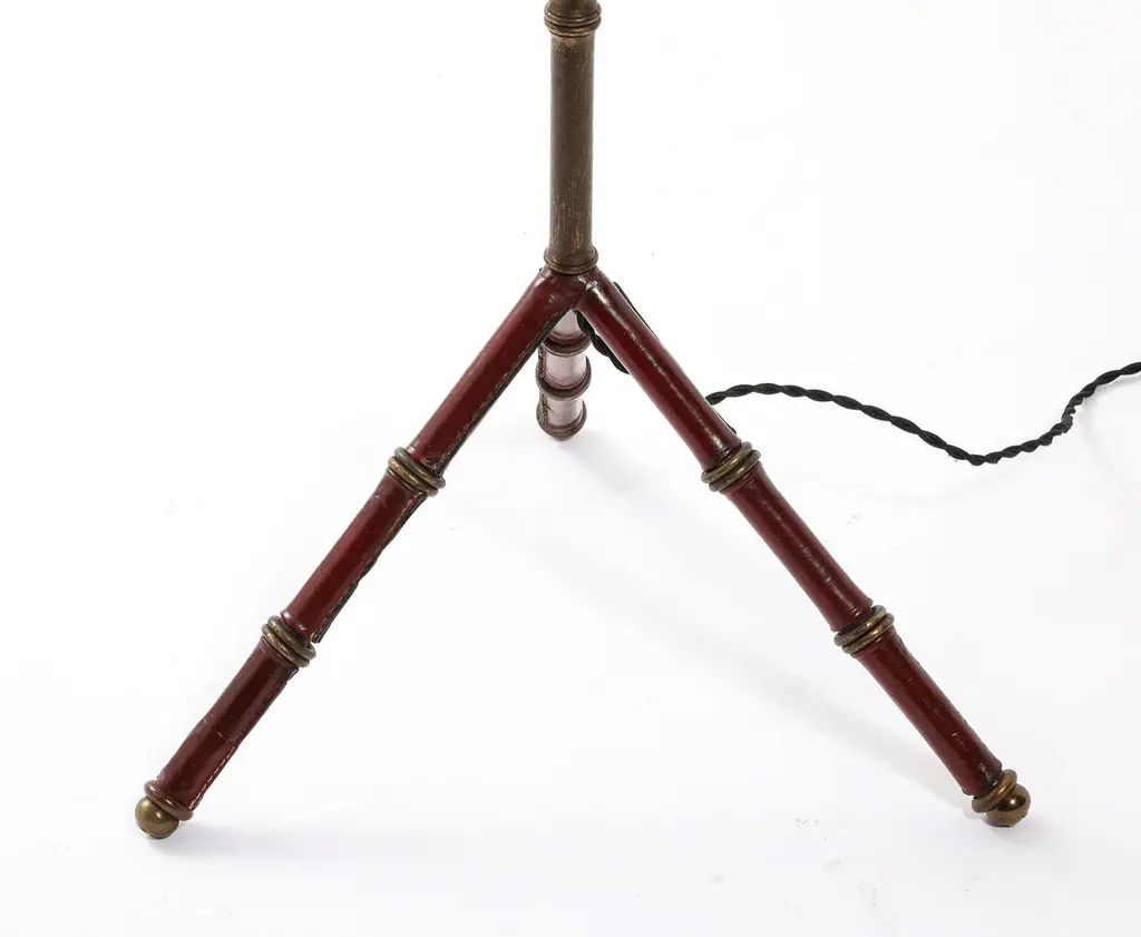 Tripod floor lamp in iron wrapped in red hand-stitched leather with a faux bamboo brass motif.