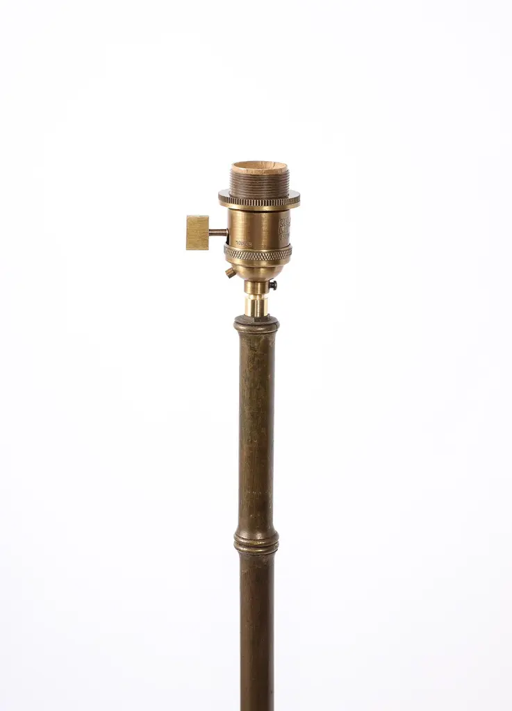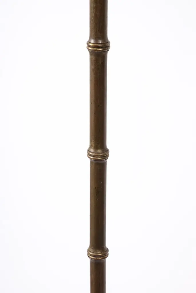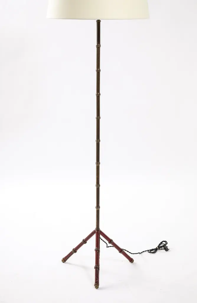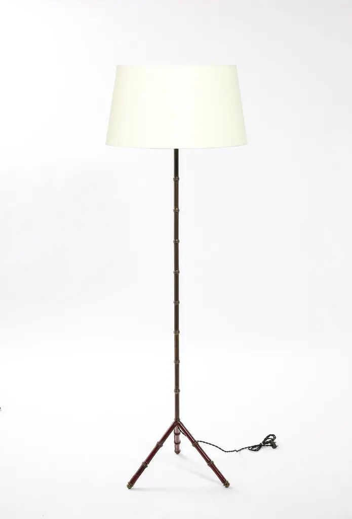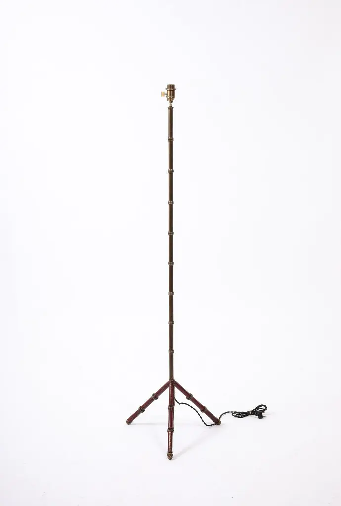 Tripod floor lamp in iron wrapped in red hand-stitched leather with a faux bamboo brass motif.