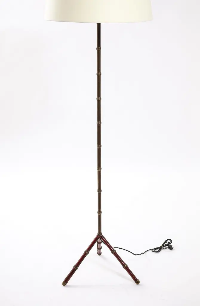 Red Leather & Brass Faux Bamboo Jacques Adnet Floor Lamp, France 1950's