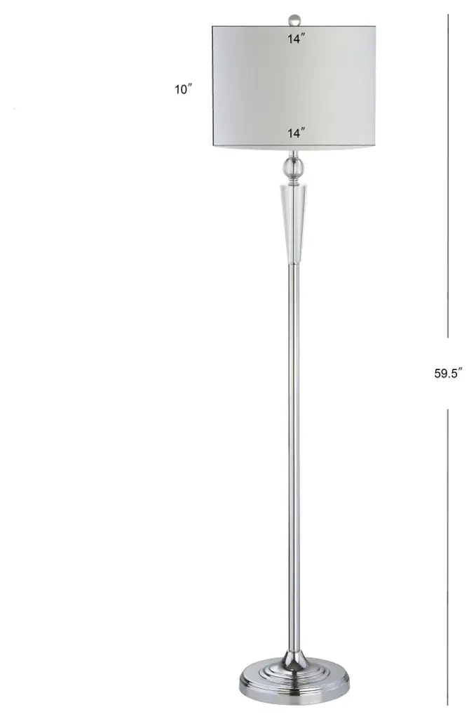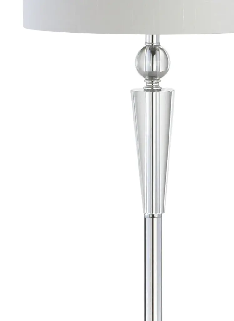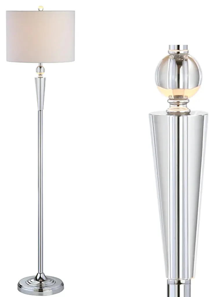 For those who love architectural details, this crystal column floor lamp''s perfect proportions and mix of chrome and crystal create a perfect harmony of simplicity and interest. The cotton drum lampshade is a modern addition, and the silk-wrapped cord is so lovely, you''ll want to leave it exposed. Best of all, this lamp is fabricated from premium materials -- 100% cotton fabric, crystal, and chrome-plated electrical components -- making it a reliable choice for years to come.-Column base in chrome with crystal details -Classic white drum shade in a hardback cotton material-Beautiful to display or easy to conceal: the 72" cord is silk-wrapped-On-off switch on socket-Takes one maximum 100 watt or equivalent bulb-Eco-friendly 9W LED bulb included-UL Listed-Color: Chrome with white shade-Body Material: Crystal /Metal-Base Material: Iron-Finial Material: Crystal-Finial Color: Clear-Harp Color: Silver-Includes: One (1) lamp(s)-Minor Assembly Required-Lamp: 59.5 inches high x 14 inches wide x 14 inches deep-Shade: 10 inches high x 14 inches wide x 14 inches deepYou see a lamp.We see a decorative work of art.A perfectly curved shade casts a dramatic shadow on a floor. A silk cord you never want to hide. LED lightbulbs: as easy on the environment as they are on the eyes. The JONTHAN Y Lighting collection considers every detail from impeccably sourced materials to designer styling. And our prices are so attractive, we''ve transformed a functional necessity into a fashion accessory.JONATHAN Y Lighting - a fashion revolution in home decor.