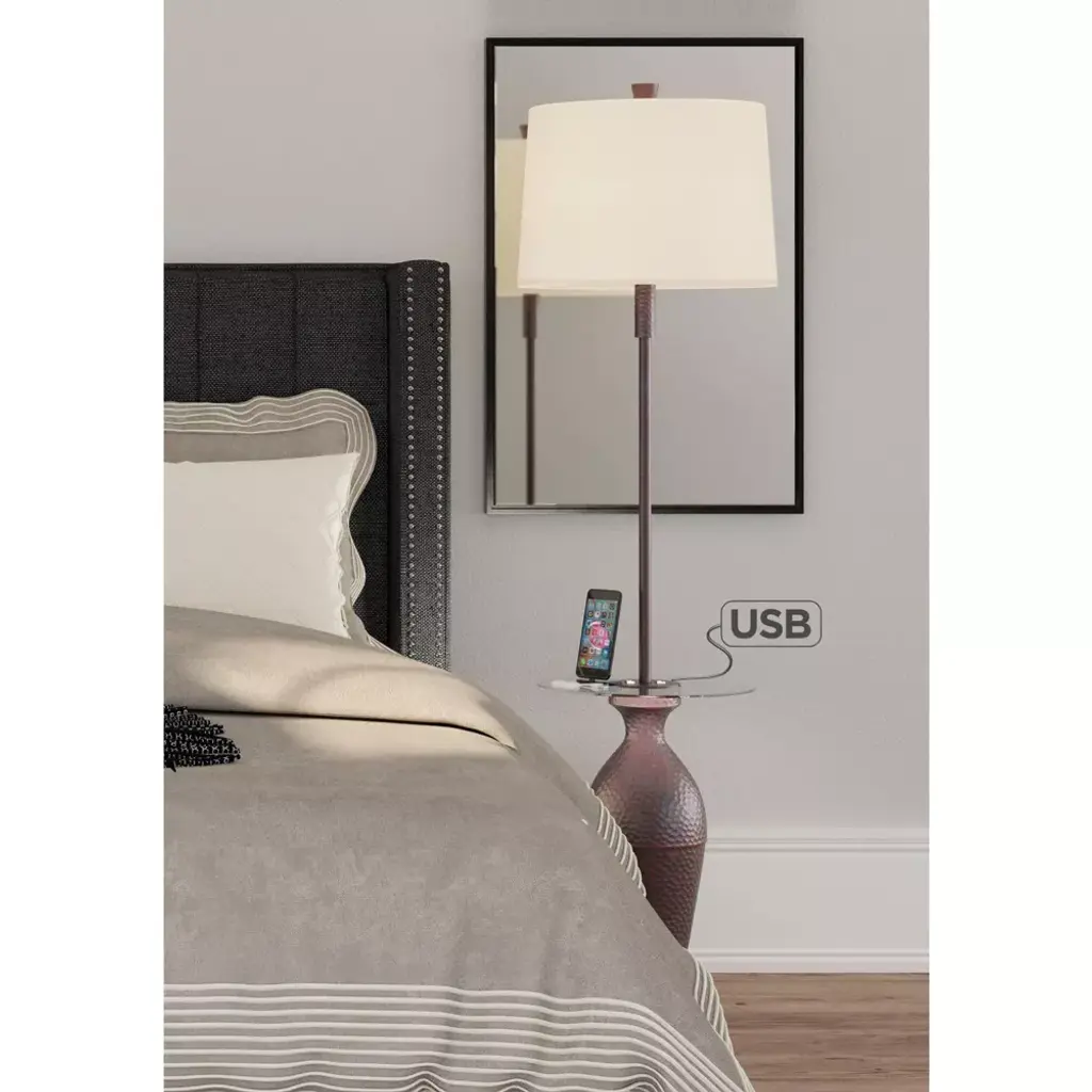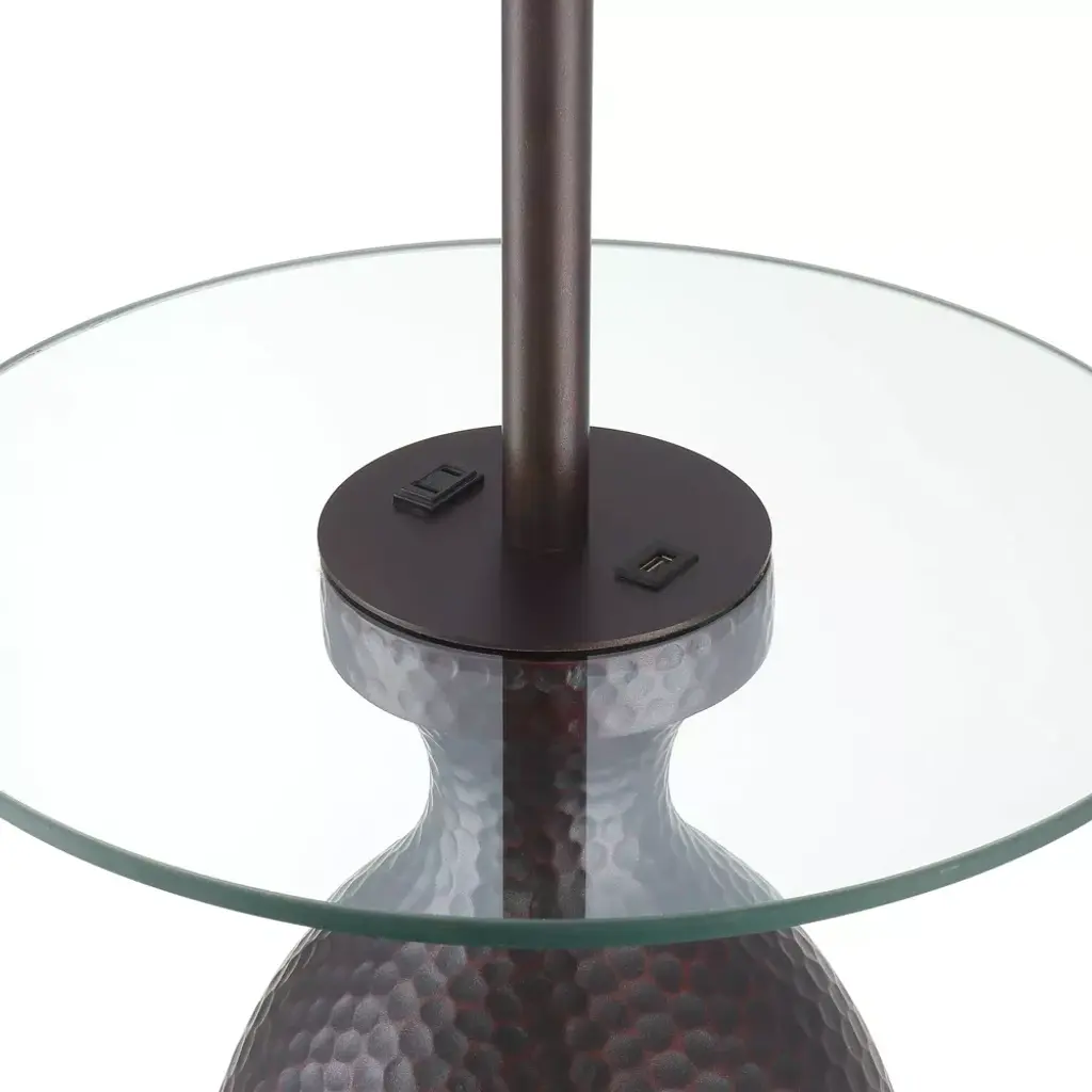 A handsome design that offers exceptional function and utility. Light up your living space with this contemporary industrial floor lamp. It has a glass tray table built into the center, along with a USB port and power outlet, allowing you to charge smartphones and other devices. This lamp is perfect for a bedroom, living room, study area, or reading space.