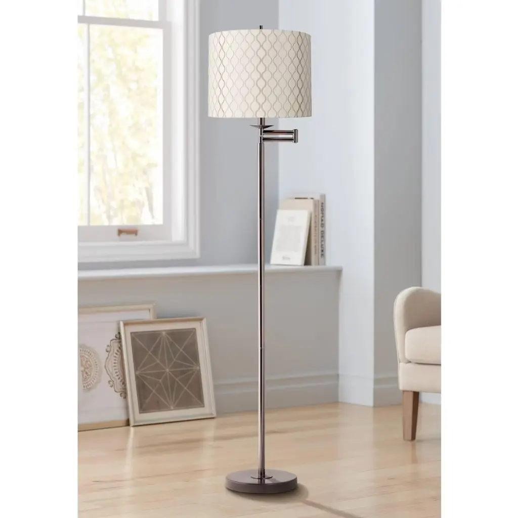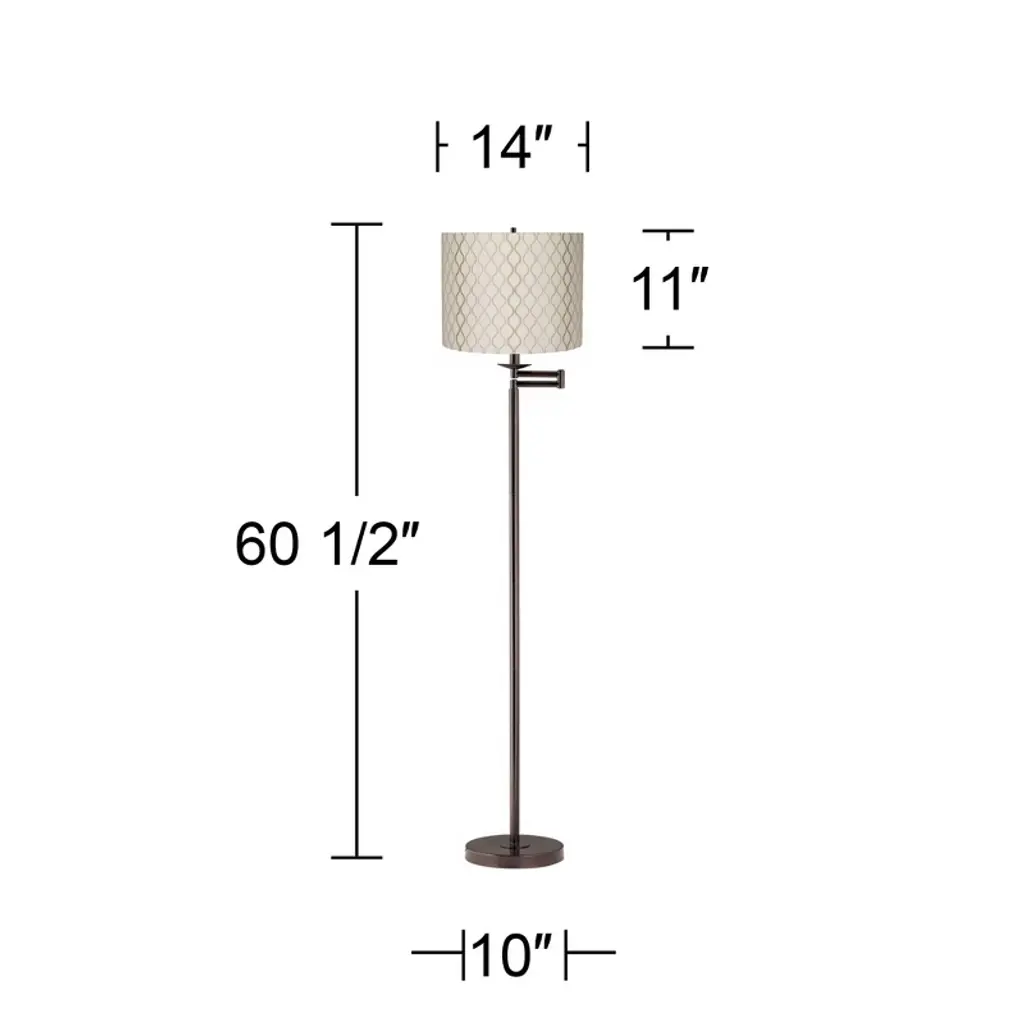 Perfect next to a sofa or arm chair, this swing arm floor lamp adjusts to position light just where you need it. The design comes in a classic bronze finish with a swing arm at the top and an on/off socket switch. It's topped with a stylish off-white fabric drum shade with tan embroidery in a repeating hourglass pattern.